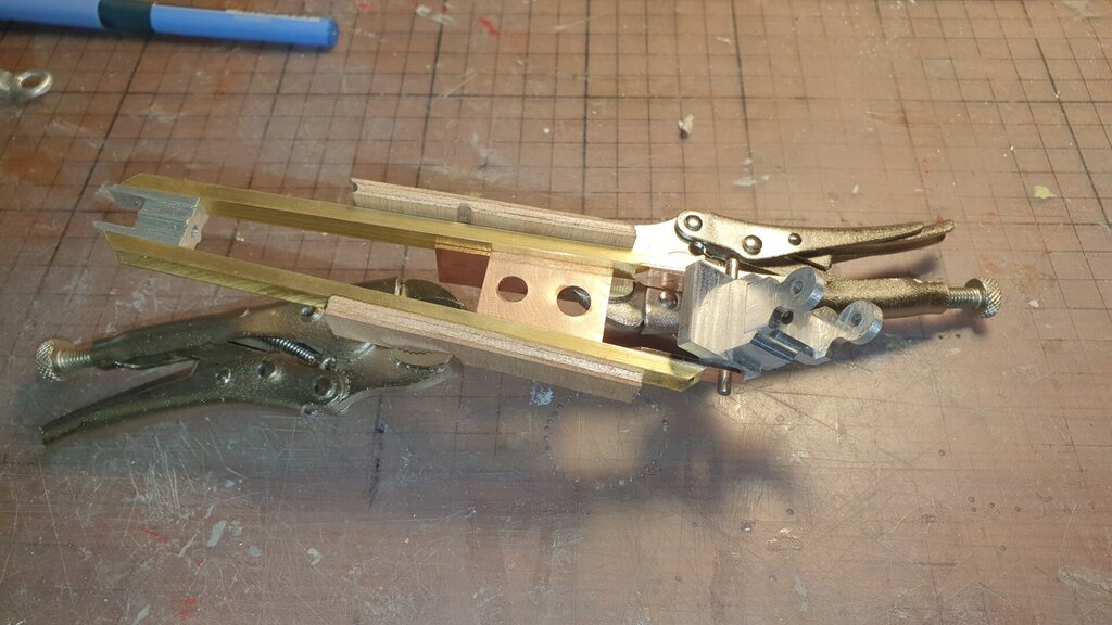 Na lemiesz użyłem kształtownik miedziany C 8x4x0,.7 ..... Pręt jest średnicy 3 mm. Będzie na nim sprężynka imitująca amortyzator zaczepu... Przygotowanie do lutowania wzmocnień poprzecznych.... Lutowałem palnikiem i pastą Bisan LB3.... -