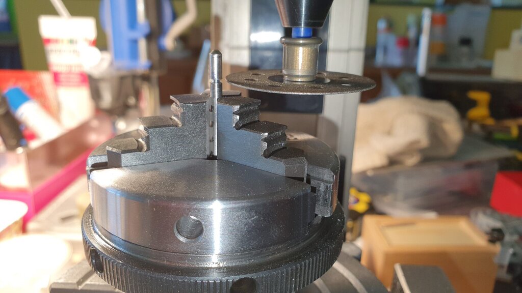 Wykorzystując uchwyt tokarski K01-63 zamocowany do stołu obrotowego, wykonałem w prętach nacięcia do zamocowania pierścieni zabezpieczających za pomocą tarczy diamentowej Dremel ..... Zaczep dostał amortyzator sprężynowy..... Dyszel na sprężynach.... Przygotowanie do zamocowania drążków skrętnych kół przyczepy... -