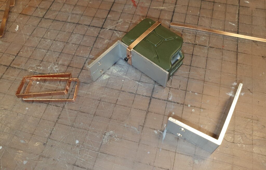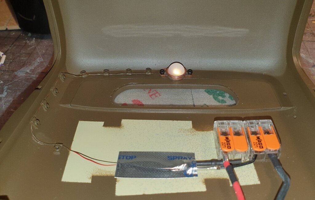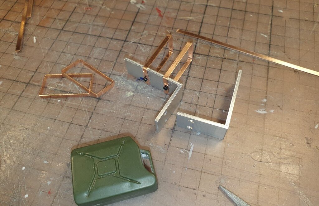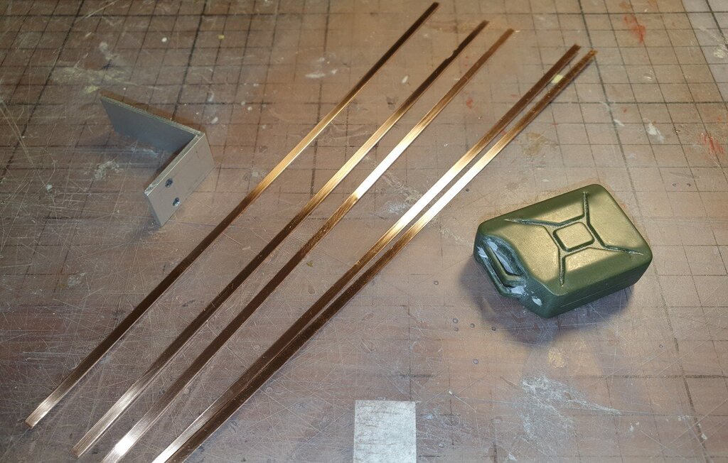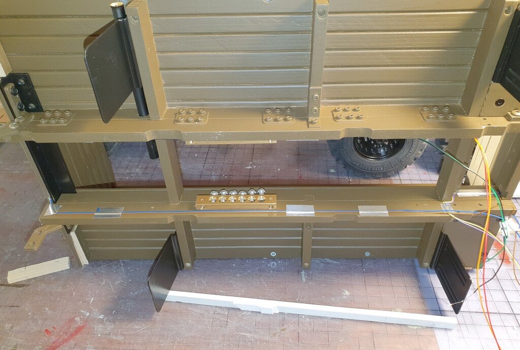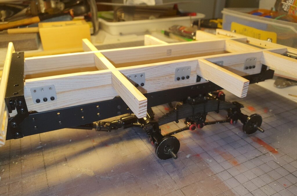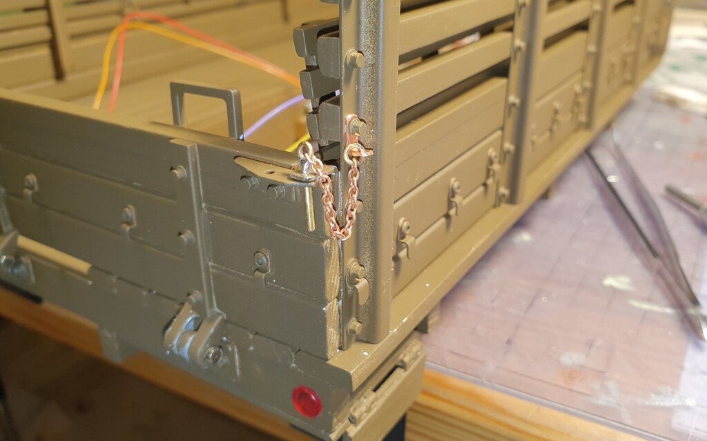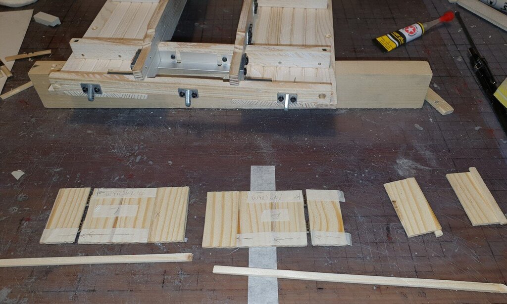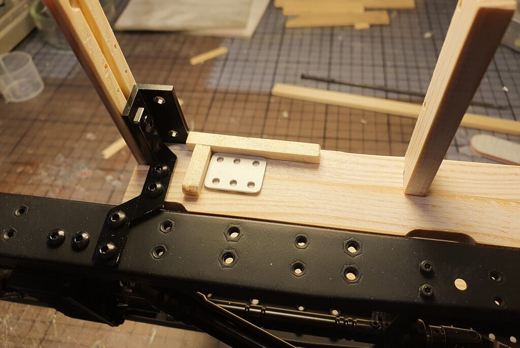 Fajne spostrzeżenie ???. Skrzynia z modelu posłużyła mi jak wzór. Całą wykonałem z listewek drewnianych. Wyeliminowałem wzmocnienia w postaci kątowników. Przestrzeń pod skrzynią wykorzystam na elementy elektryczne. W modelu bateria jest w skrzyni na pace. W moim modelu to wyeliminowałem. Nic nie będzie widoczne i wszystko będzie zmyślnie ukryte. Wygląd elemetów skrzyni z zestawu.... Pociąłem deseczki na listewki i nawierciłem otwory do skręcenia. Niektóre dlistewki sa klejone... Pomalowałem podkładem.... Nafrezowałem rowki pod kabelki do oświetlenia..... Dopasowanie to plastikowej podłogi skrzyni... Wyfrezowałem blaszki do zamocowania ramy skrzyni... Tu schowek na baterię.... środkowa część podłogi jesy odsuwana i unoszona do góry. Spasowanie jest na klik.... Po założeniu nie ma śladu, że coś jest zdejmowane.... okucia do stelażu plandeki.... klocki, dla skręcenia burt to podłogi skrzyni... listewki na podwyższenie burt skrzyni.... Dzięki tej modyfikacji rant skrzyni wystaje ppoza krawędź burty. W modelu oryginalnym burty się licują. Przygotowanie do montażu rury wydechowej. Planuję, że będzie dym... rura z rurki miedzinej z rozwalcowaną końcówką.... mocowanie dla rury wydechowej... dodatkowe otwory, umożliwiające montaż skrzyni.... Zrobiłem też ławki na skrzyni dla żołnierzy. Ławki są składane.... składane podpórki ławeczek.... zrobiłem skrzynki mocowane pod podłogą w tylnej cześci.... zrobiłem z blachy miedzinaej 1 mm przednie chlapacze skrzyni. Chciałem, aby wyglądały tak jak tylnie.... zrobiłem szablon do wyszlifowania półwałków z pręta PCV... zamknięcie do tylnie klapy... Przeciągnąłem kabelki do oświetlenia. Użyłem ledów.... Krawędzie burt wzmocniłem blachą. Blacha miedziana 0.1 mm wygiąłem na super giętarce. Kupienie jej nie moge jednak nazwać faktem przyjemnym. Ale to nie temat na to forum. Proponuję tylko się dobrze zastanowić przed zamówieniem giętarki u Pana, który je produkuje. widoczne haczyki dla sznurków plandeki.... Krótki film z działania wciagarki.... 20220115_182626.mp4 Krótki film z działania wałów... 20211010-003815-naped - reduced.mp4 Krótki film ze składanej ławeczki... 20220105_222408.mp4 -