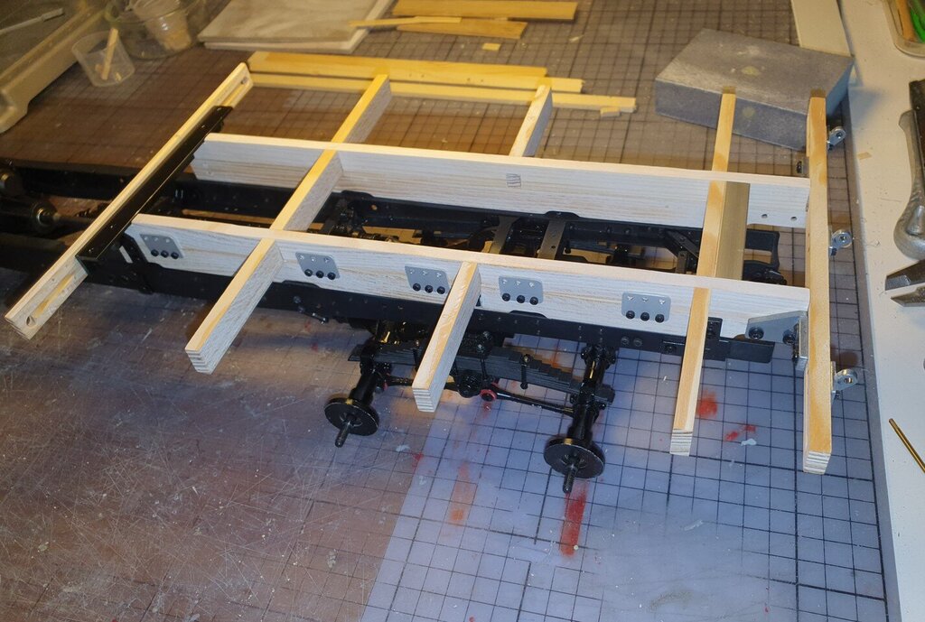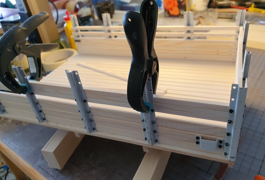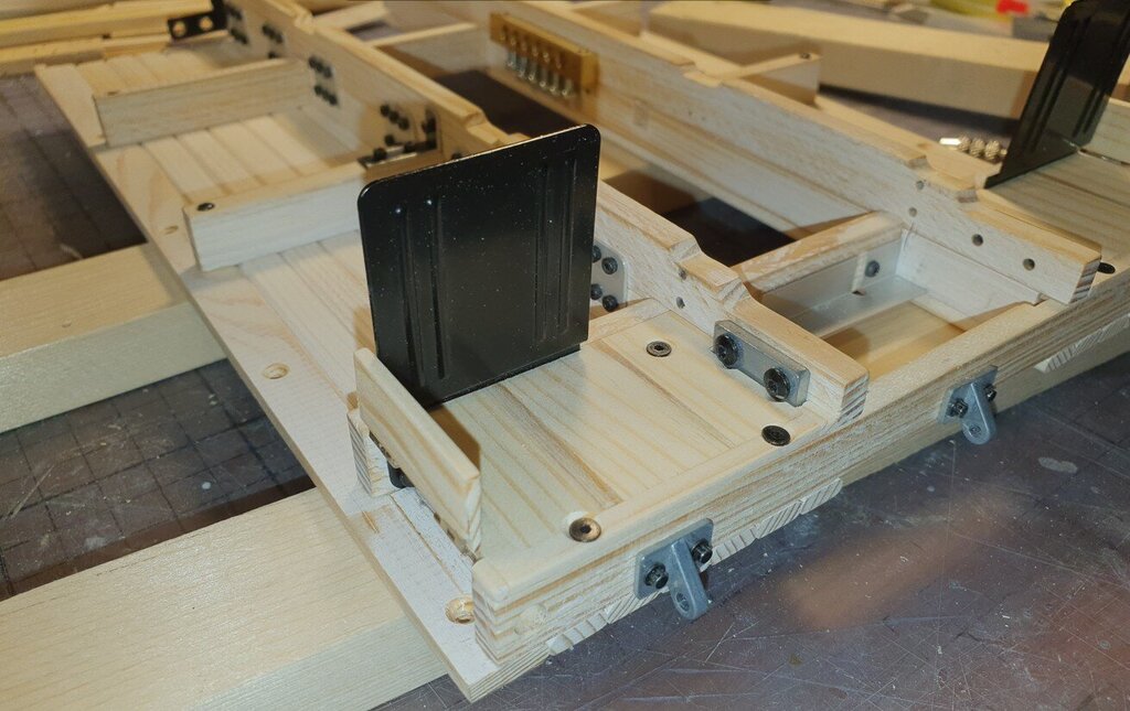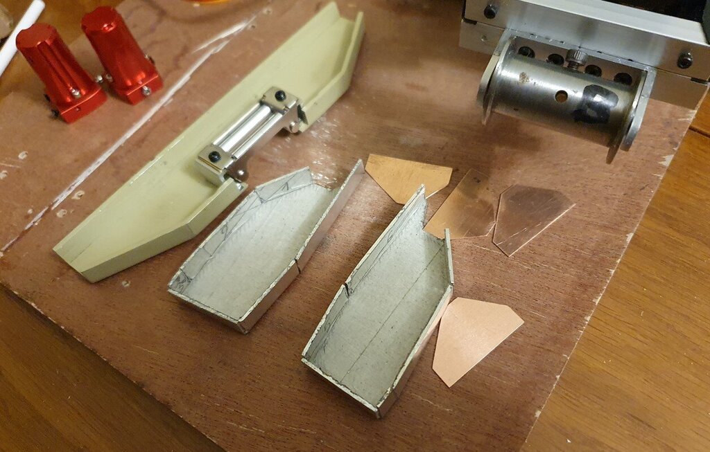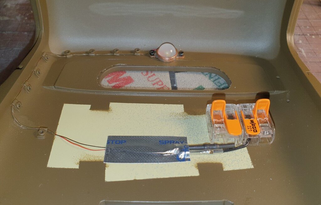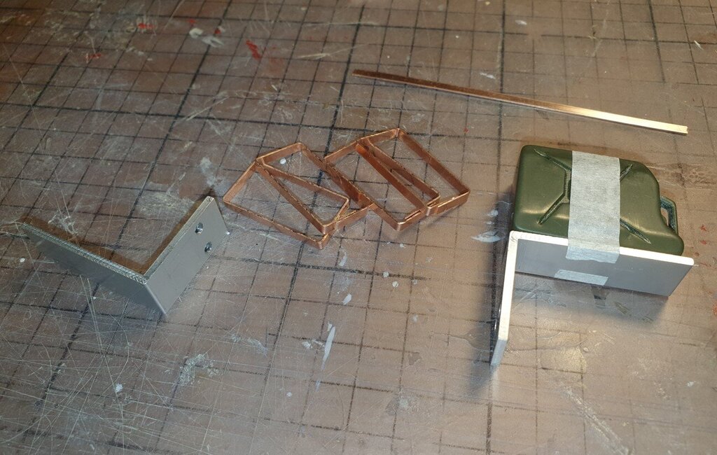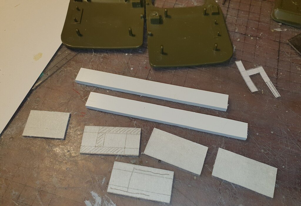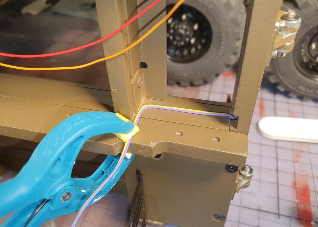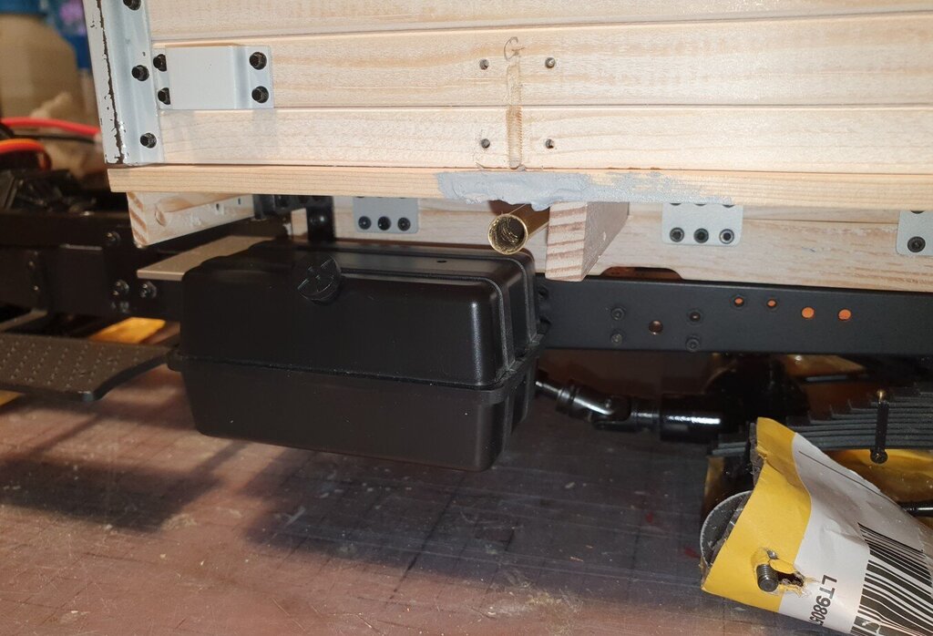 Fajne spostrzeżenie ???. Skrzynia z modelu posłużyła mi jak wzór. Całą wykonałem z listewek drewnianych. Wyeliminowałem wzmocnienia w postaci kątowników. Przestrzeń pod skrzynią wykorzystam na elementy elektryczne. W modelu bateria jest w skrzyni na pace. W moim modelu to wyeliminowałem. Nic nie będzie widoczne i wszystko będzie zmyślnie ukryte. Wygląd elemetów skrzyni z zestawu.... Pociąłem deseczki na listewki i nawierciłem otwory do skręcenia. Niektóre dlistewki sa klejone... Pomalowałem podkładem.... Nafrezowałem rowki pod kabelki do oświetlenia..... Dopasowanie to plastikowej podłogi skrzyni... Wyfrezowałem blaszki do zamocowania ramy skrzyni... Tu schowek na baterię.... środkowa część podłogi jesy odsuwana i unoszona do góry. Spasowanie jest na klik.... Po założeniu nie ma śladu, że coś jest zdejmowane.... okucia do stelażu plandeki.... klocki, dla skręcenia burt to podłogi skrzyni... listewki na podwyższenie burt skrzyni.... Dzięki tej modyfikacji rant skrzyni wystaje ppoza krawędź burty. W modelu oryginalnym burty się licują. Przygotowanie do montażu rury wydechowej. Planuję, że będzie dym... rura z rurki miedzinej z rozwalcowaną końcówką.... mocowanie dla rury wydechowej... dodatkowe otwory, umożliwiające montaż skrzyni.... Zrobiłem też ławki na skrzyni dla żołnierzy. Ławki są składane.... składane podpórki ławeczek.... zrobiłem skrzynki mocowane pod podłogą w tylnej cześci.... zrobiłem z blachy miedzinaej 1 mm przednie chlapacze skrzyni. Chciałem, aby wyglądały tak jak tylnie.... zrobiłem szablon do wyszlifowania półwałków z pręta PCV... zamknięcie do tylnie klapy... Przeciągnąłem kabelki do oświetlenia. Użyłem ledów.... Krawędzie burt wzmocniłem blachą. Blacha miedziana 0.1 mm wygiąłem na super giętarce. Kupienie jej nie moge jednak nazwać faktem przyjemnym. Ale to nie temat na to forum. Proponuję tylko się dobrze zastanowić przed zamówieniem giętarki u Pana, który je produkuje. widoczne haczyki dla sznurków plandeki.... Krótki film z działania wciagarki.... 20220115_182626.mp4 Krótki film z działania wałów... 20211010-003815-naped - reduced.mp4 Krótki film ze składanej ławeczki... 20220105_222408.mp4 -