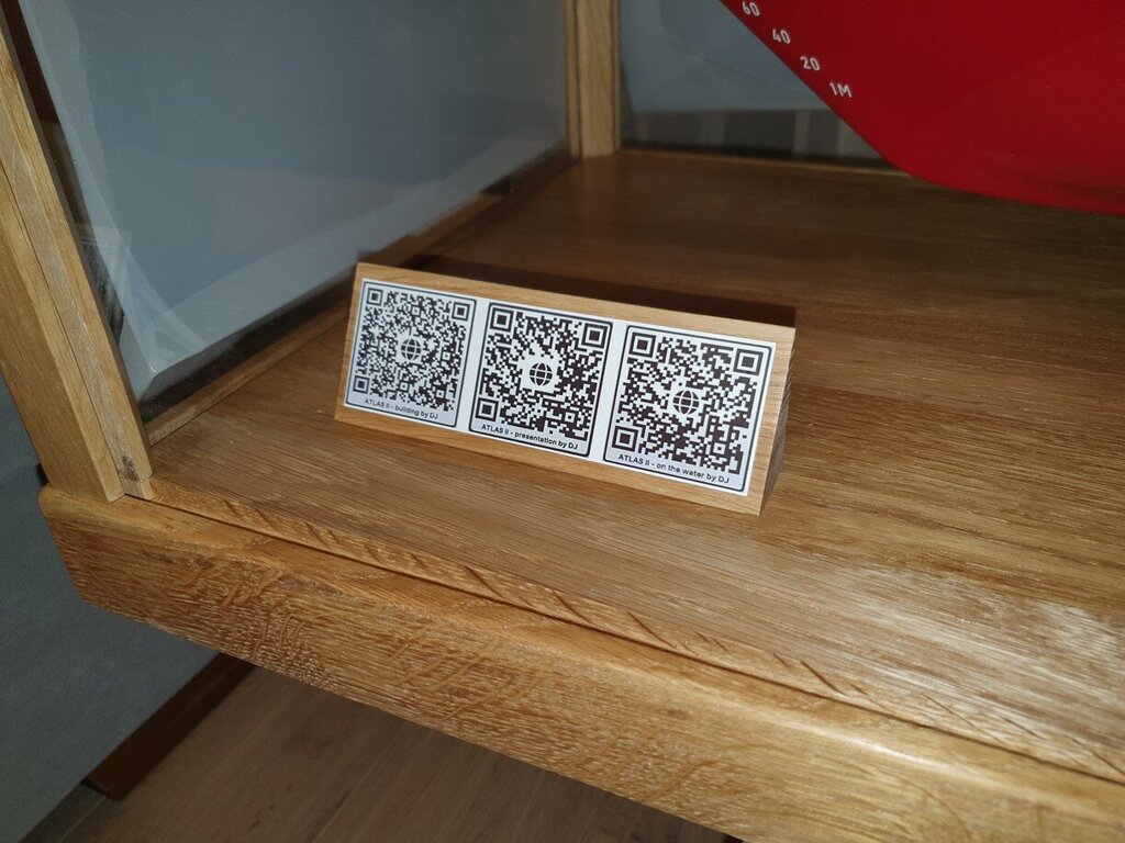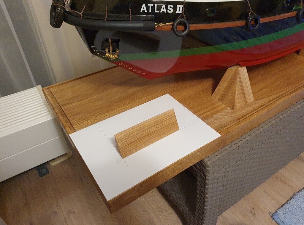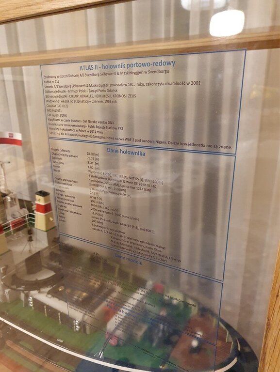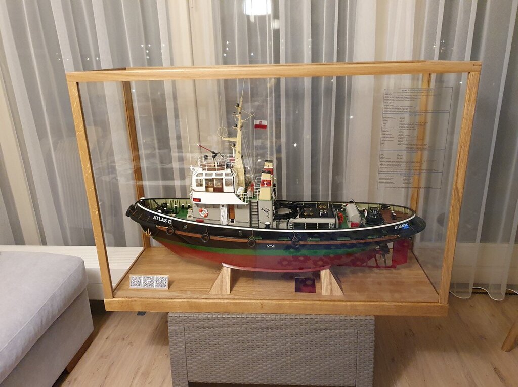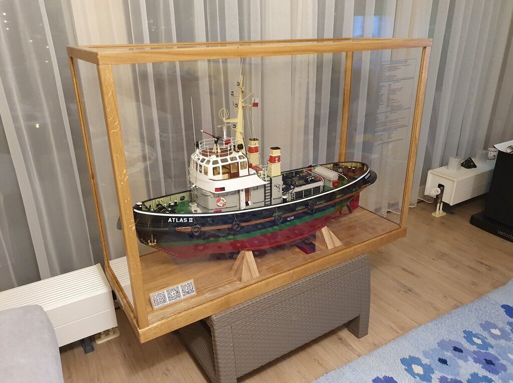 Dość ciekawy wzór wyszedł po złożeniu listew... Górną ramę połączyłem za pomocą pióra.... Przed ostatecznym sklejeniem wsunąłem taflę pleksi 6 mm. Użyłem narożników kątowych, jako ścisków ustalających.... Całość została polakierowana lakierem do drewna satynowym... Na podstawę dołożyłem wizytownik, mocowany na kołki Fi 8.... Dla pokazania dolnego kosza ssącego zamocowałem lusterko..... Na wizytowniku przykleiłem kody QR..... W przeciwległym rogu szyby przedniej umieściłem opis jednostki. Wykonałem go na kalkomanii, po czym wydrukowałem lustrzany widok, aby móc wkleić od wewnątrz. Dzięki temu nie przesłania modelu, a można wszystko odczytać.... I w końcu model można było zobaczyć jako ukończony na 101 procent. Ten 1 dlatego, że nie wierzyłem, że uda mi się go ukończyć. Pokazanie się na forum, to jednak jest wielka mobilizacja.... Poniżej dość ciekawe zestawienie..... I tak to, przygoda z budową holownika ATLAS II się zakończyła. Rany, tyle lat!!!! Aż łezka się zakręciła w oku. Dziękuję wszystkim za śledzenie wątku. Miło było spędzić ten szmat czasu z Wami na forum. Pozdrawiam kibiców, życzę samych sukcesów oraz dporowadzanie spraw do końca. -