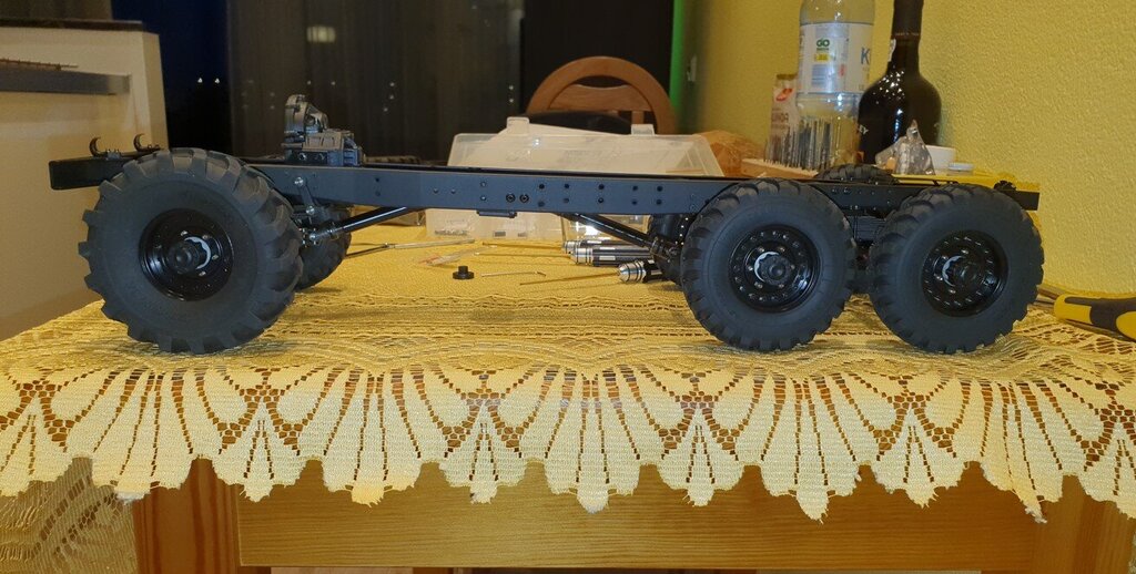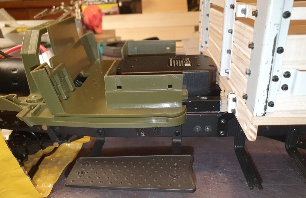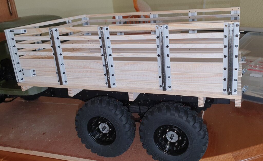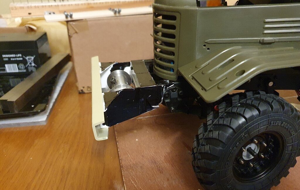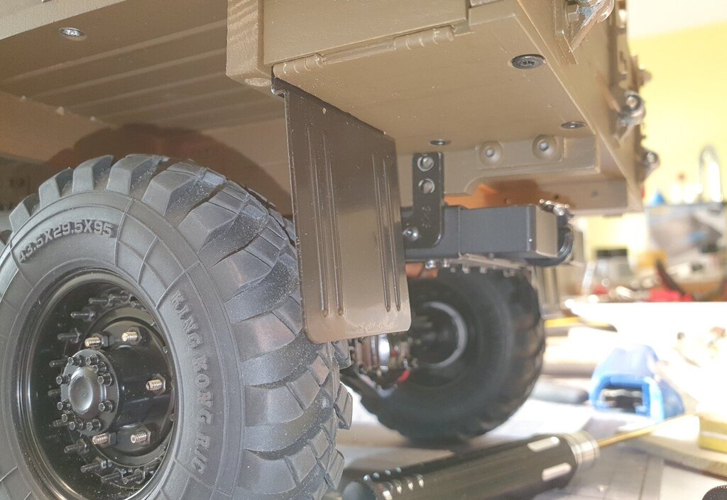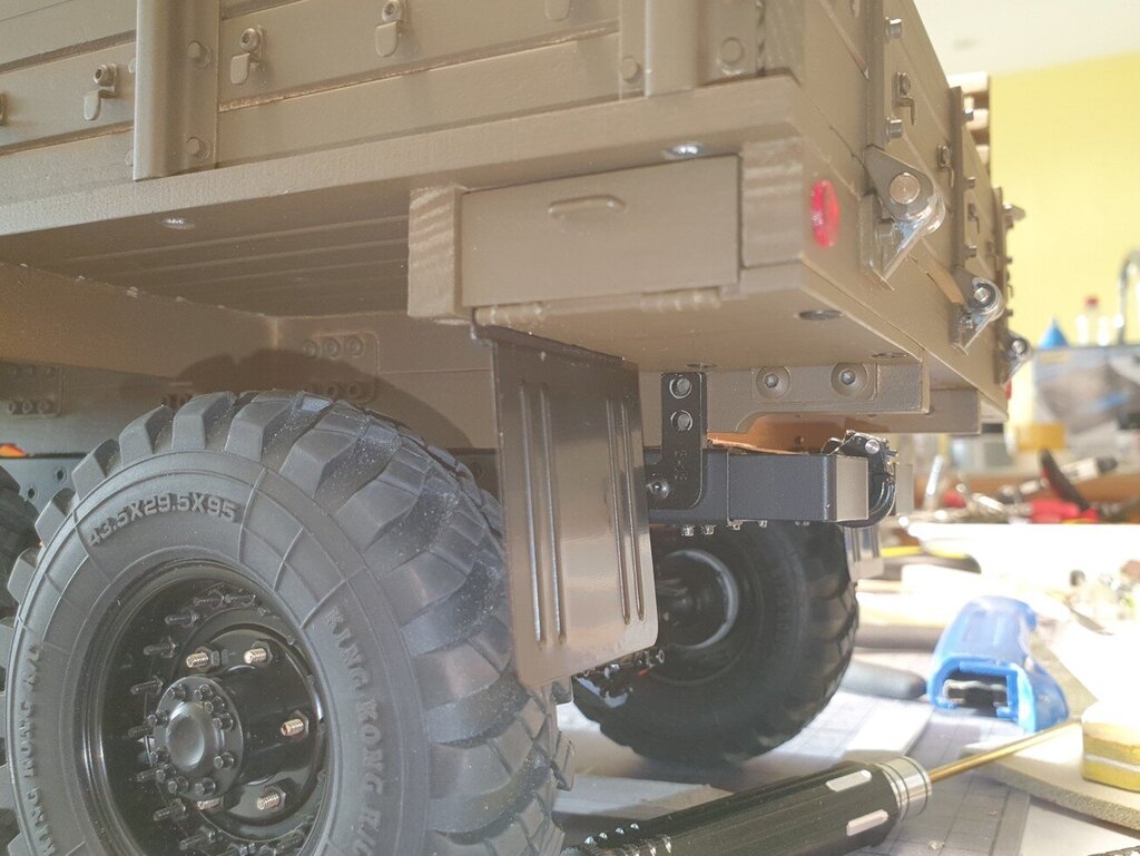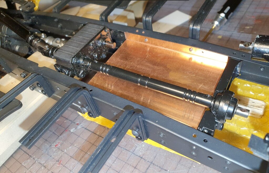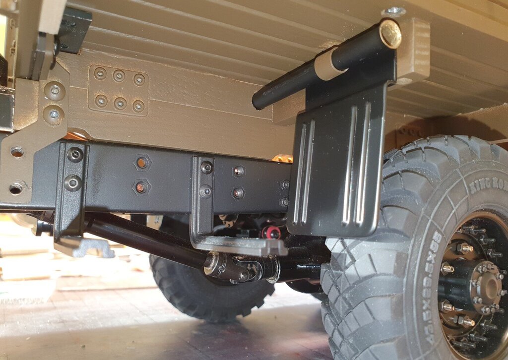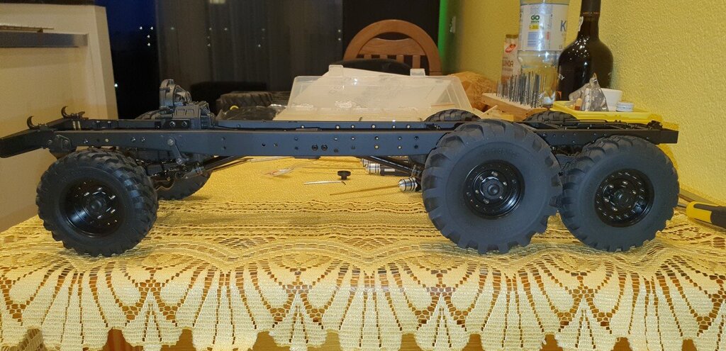 Oczywiście zapraszam do oglądania. W oryginale na wyjściu z przekładni jest wał sztywny. Trudno było to spasować, przez co napęd mocno hałasował... Zamieniłem go na wał z kardanem. Długość wału 45-52 mm... Po zmontowaniu napęd pracuje bezszelestnie. Jest super.... W międzyczasie zobaczyłem co jest w przekładni. Obudowa metalowa, koła zębate metalowe, łożyska kulowe na wałach głównych i pośrednich. wszystko wypełnione smarem. Zmontowałem z powrotem bo wszystko było jak powinno być. Tu drobne elementy, które były odłamane i przez to model był mocno preceniony.... Klamek np są 4 sztuki. Stweirdziłem,że zrobię ziła bardziej bojowego i podniosłem kabinę o 10 mm. W tym celu użyłem aluminiowy profil C. Wygiąłem go w imadle i przyciąłem na wymiar... Dodakowe podłużnice pomalowałem na czarny półmat. Widoczne blaszki do przykręcenia podłużnicy do ramy oraz uchwyt do ESC napędu głównego... Założyłem silnik 6V, 540, 80T. Zależało mi, aby model miał możliwość pełzania. Prędkość maksymalna jest także odpowiednia... Podniesienie szoferki wymusiło dołożenie chlapaczy do błotników przednich. Wykorzystałem chlapacze od modelu HG P801... Dzięki podniesieniu mam miejsce na założenie przednich amortyzatorów... Nabyłem dość dobrze wykonane amortyzatory powitrzne, jako, że będą one w zasadzie dekoracją.... Obudowy pomalowałem na czarno.... Użyte serwo.... Tu wcześniejsze próby z amortyzatorami od HG P801.... Teraz pokażę jak zrobiłem uchwyty do amortyzatorów. Użyłem blachy miedzianej 0,5 mm.... Zdfjęcia z amortyzatorami na wcześniejszem etapie przed zmianą. Wydały mi się one zbyt masywne... Uchwyt do ESC. Skrywa także włącznik ESC. Całość zamontowana na serwie skrętu... Rama w całej okazałości.... Model duży, ale miejscem za bardzo nie mogę szastać, bo jednak wyposażenia planuję troche w niego włożyć. Wprowadzone zmiany dały wolne miejsce pomiędzy szoferką, a skrzynią. Postanowiłem zamontować tam kanistry. Wykorzystałem gotowce. Wykonałem tylko uchwyty. Z blachy miedzianej 0.3 mm pociąłem paski.... -