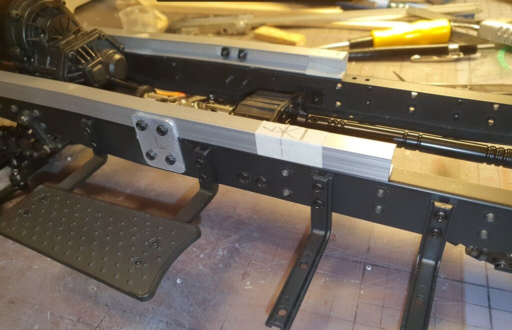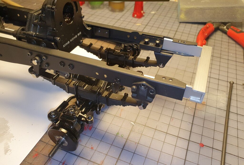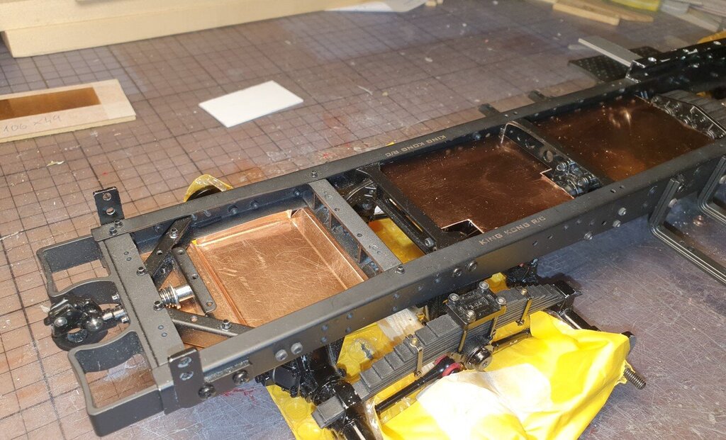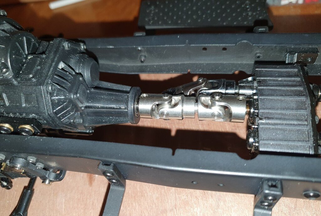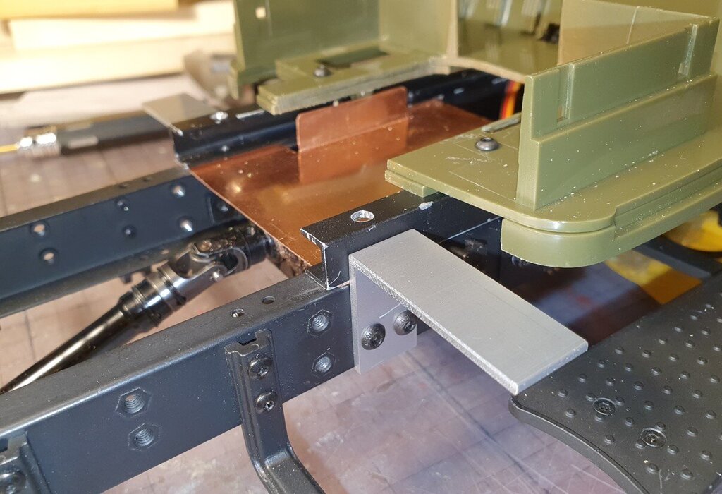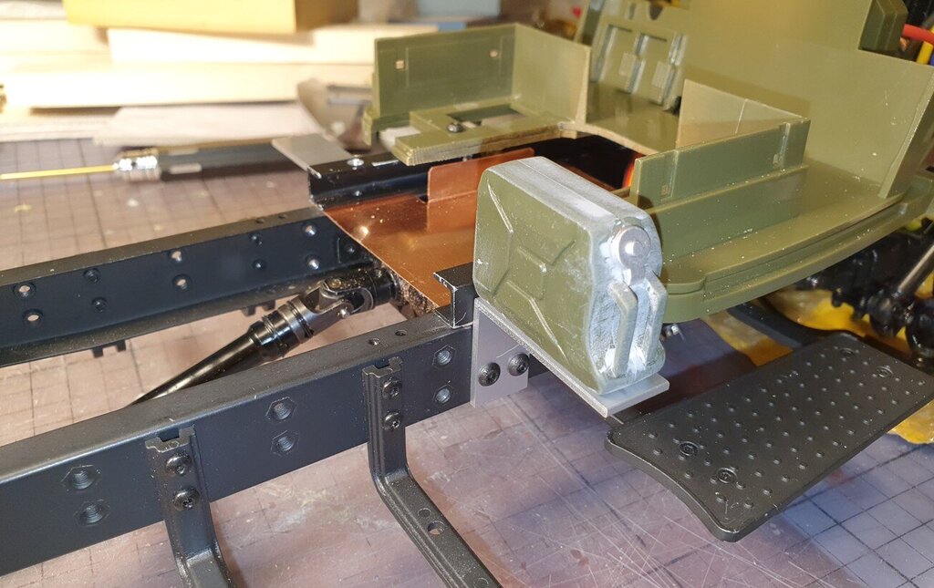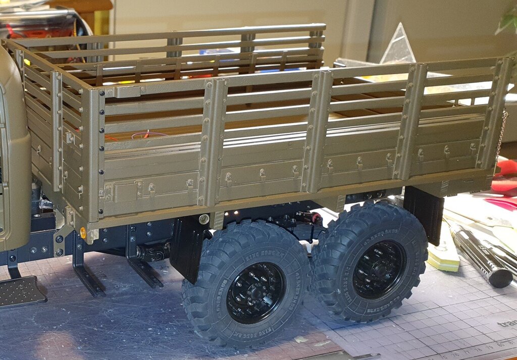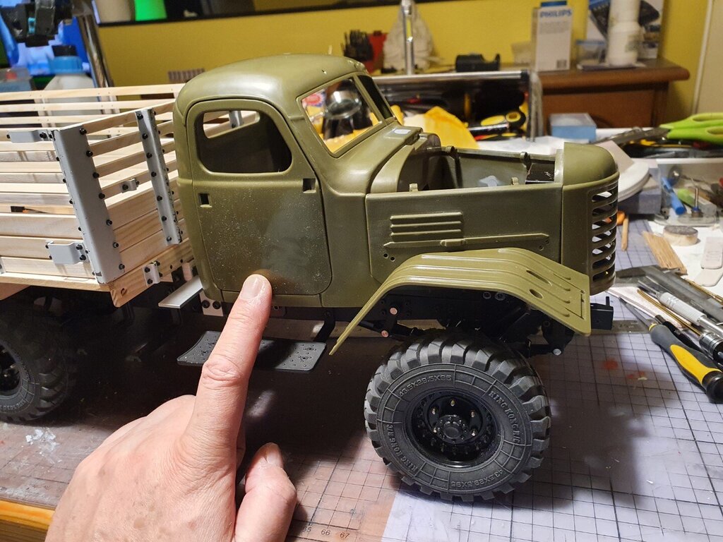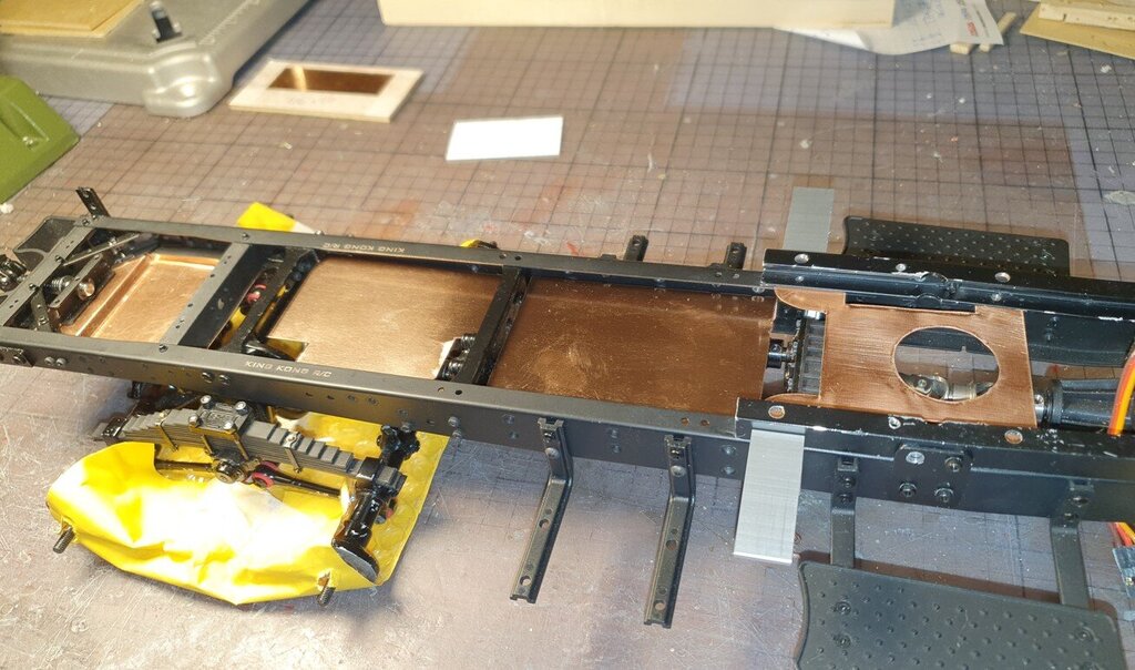 Oczywiście zapraszam do oglądania. W oryginale na wyjściu z przekładni jest wał sztywny. Trudno było to spasować, przez co napęd mocno hałasował... Zamieniłem go na wał z kardanem. Długość wału 45-52 mm... Po zmontowaniu napęd pracuje bezszelestnie. Jest super.... W międzyczasie zobaczyłem co jest w przekładni. Obudowa metalowa, koła zębate metalowe, łożyska kulowe na wałach głównych i pośrednich. wszystko wypełnione smarem. Zmontowałem z powrotem bo wszystko było jak powinno być. Tu drobne elementy, które były odłamane i przez to model był mocno preceniony.... Klamek np są 4 sztuki. Stweirdziłem,że zrobię ziła bardziej bojowego i podniosłem kabinę o 10 mm. W tym celu użyłem aluminiowy profil C. Wygiąłem go w imadle i przyciąłem na wymiar... Dodakowe podłużnice pomalowałem na czarny półmat. Widoczne blaszki do przykręcenia podłużnicy do ramy oraz uchwyt do ESC napędu głównego... Założyłem silnik 6V, 540, 80T. Zależało mi, aby model miał możliwość pełzania. Prędkość maksymalna jest także odpowiednia... Podniesienie szoferki wymusiło dołożenie chlapaczy do błotników przednich. Wykorzystałem chlapacze od modelu HG P801... Dzięki podniesieniu mam miejsce na założenie przednich amortyzatorów... Nabyłem dość dobrze wykonane amortyzatory powitrzne, jako, że będą one w zasadzie dekoracją.... Obudowy pomalowałem na czarno.... Użyte serwo.... Tu wcześniejsze próby z amortyzatorami od HG P801.... Teraz pokażę jak zrobiłem uchwyty do amortyzatorów. Użyłem blachy miedzianej 0,5 mm.... Zdfjęcia z amortyzatorami na wcześniejszem etapie przed zmianą. Wydały mi się one zbyt masywne... Uchwyt do ESC. Skrywa także włącznik ESC. Całość zamontowana na serwie skrętu... Rama w całej okazałości.... Model duży, ale miejscem za bardzo nie mogę szastać, bo jednak wyposażenia planuję troche w niego włożyć. Wprowadzone zmiany dały wolne miejsce pomiędzy szoferką, a skrzynią. Postanowiłem zamontować tam kanistry. Wykorzystałem gotowce. Wykonałem tylko uchwyty. Z blachy miedzianej 0.3 mm pociąłem paski.... -