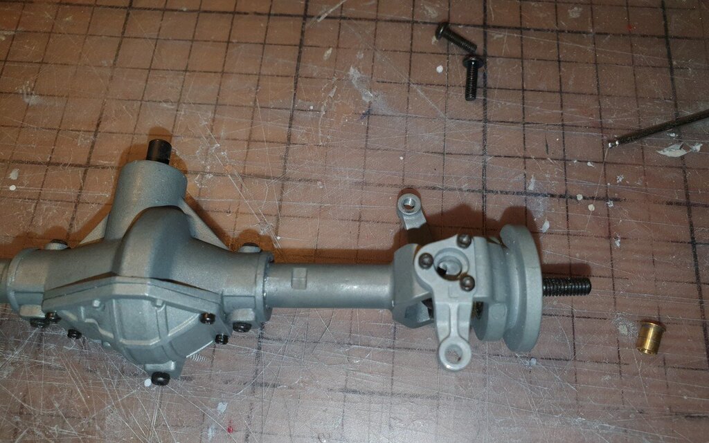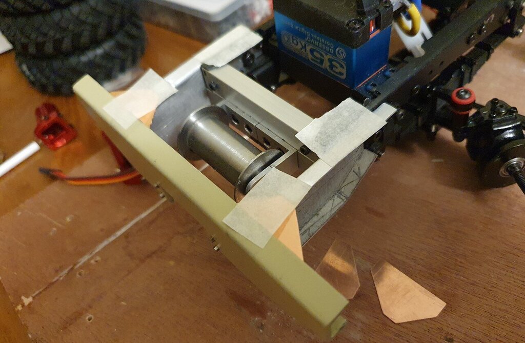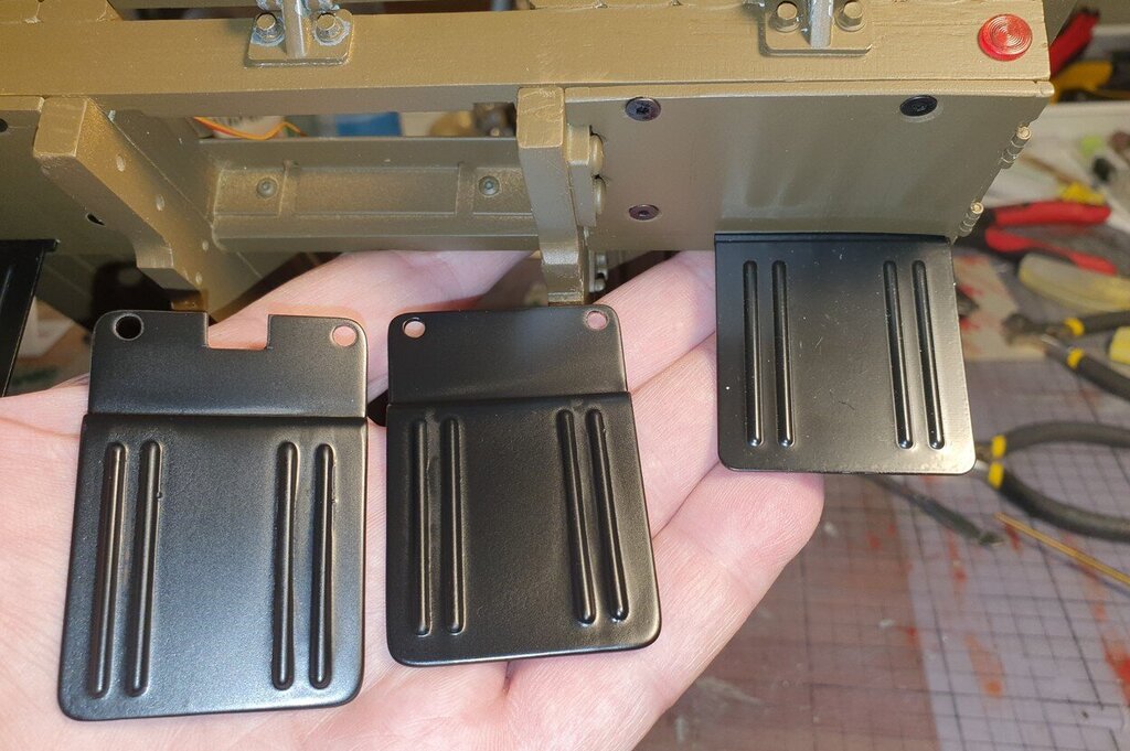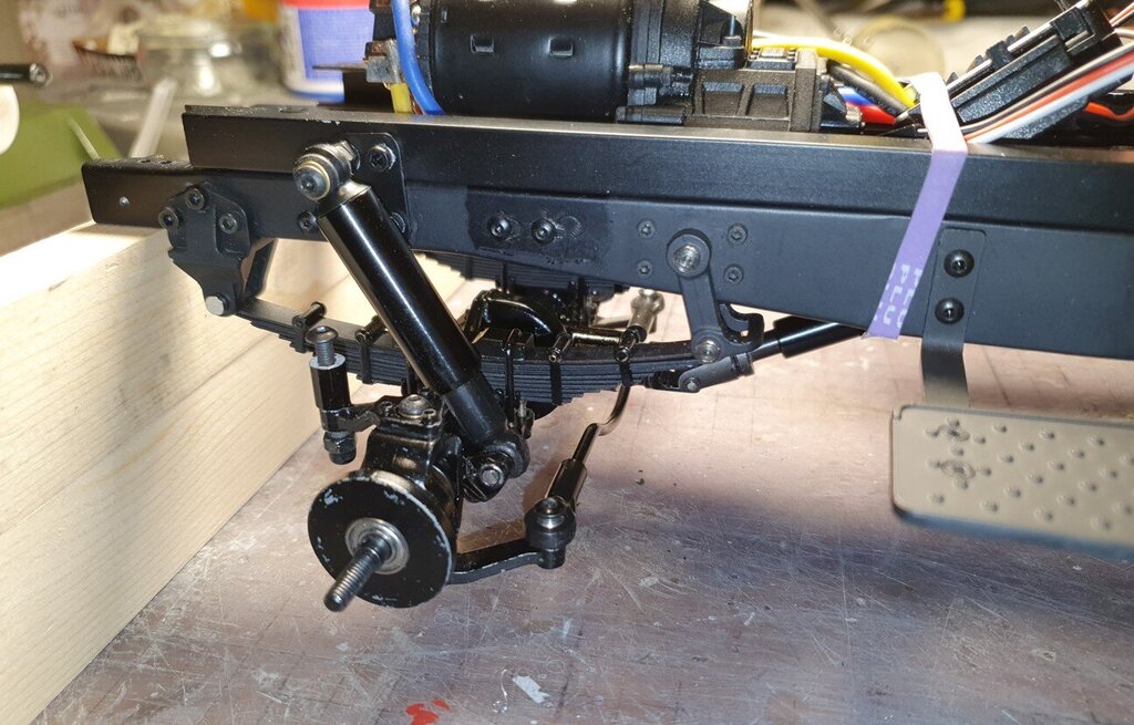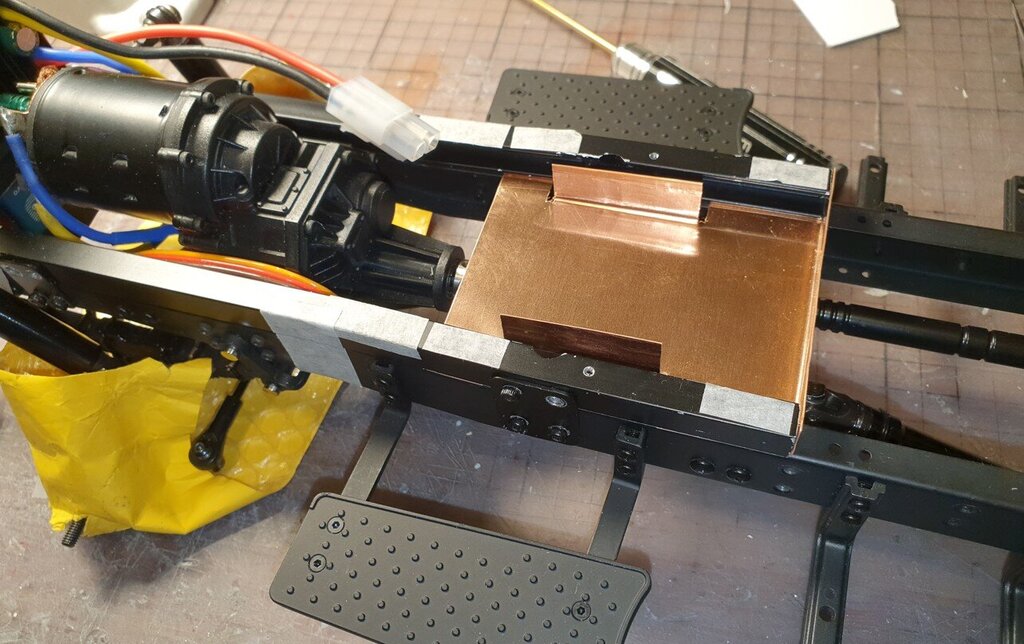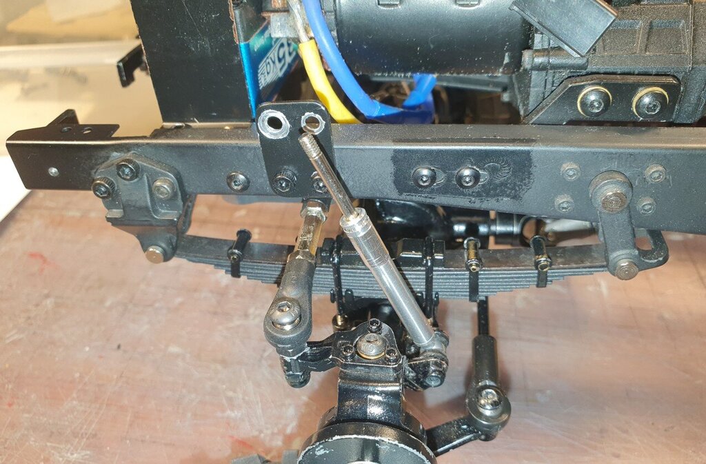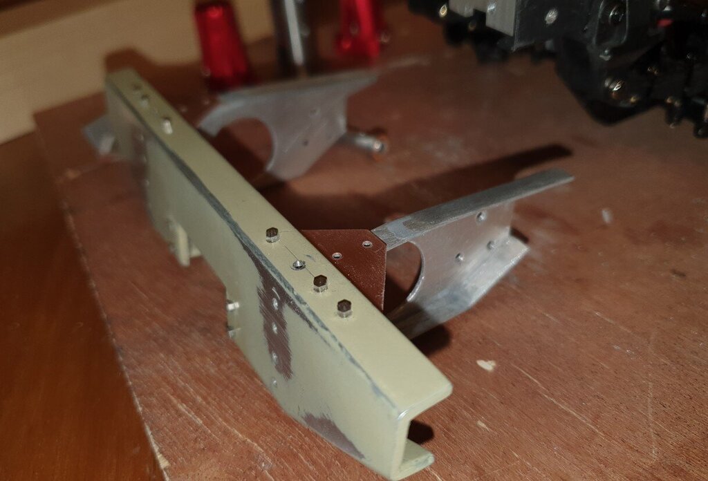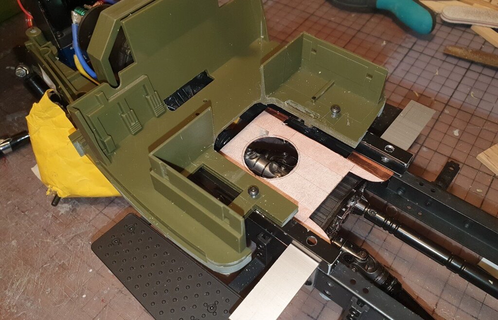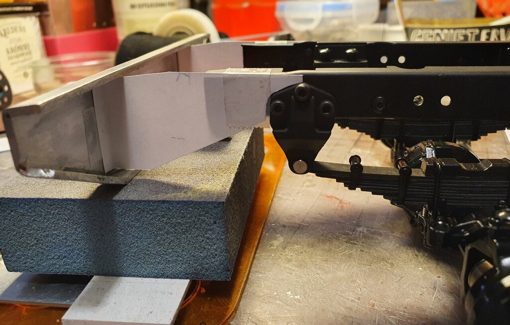 Oczywiście zapraszam do oglądania. W oryginale na wyjściu z przekładni jest wał sztywny. Trudno było to spasować, przez co napęd mocno hałasował... Zamieniłem go na wał z kardanem. Długość wału 45-52 mm... Po zmontowaniu napęd pracuje bezszelestnie. Jest super.... W międzyczasie zobaczyłem co jest w przekładni. Obudowa metalowa, koła zębate metalowe, łożyska kulowe na wałach głównych i pośrednich. wszystko wypełnione smarem. Zmontowałem z powrotem bo wszystko było jak powinno być. Tu drobne elementy, które były odłamane i przez to model był mocno preceniony.... Klamek np są 4 sztuki. Stweirdziłem,że zrobię ziła bardziej bojowego i podniosłem kabinę o 10 mm. W tym celu użyłem aluminiowy profil C. Wygiąłem go w imadle i przyciąłem na wymiar... Dodakowe podłużnice pomalowałem na czarny półmat. Widoczne blaszki do przykręcenia podłużnicy do ramy oraz uchwyt do ESC napędu głównego... Założyłem silnik 6V, 540, 80T. Zależało mi, aby model miał możliwość pełzania. Prędkość maksymalna jest także odpowiednia... Podniesienie szoferki wymusiło dołożenie chlapaczy do błotników przednich. Wykorzystałem chlapacze od modelu HG P801... Dzięki podniesieniu mam miejsce na założenie przednich amortyzatorów... Nabyłem dość dobrze wykonane amortyzatory powitrzne, jako, że będą one w zasadzie dekoracją.... Obudowy pomalowałem na czarno.... Użyte serwo.... Tu wcześniejsze próby z amortyzatorami od HG P801.... Teraz pokażę jak zrobiłem uchwyty do amortyzatorów. Użyłem blachy miedzianej 0,5 mm.... Zdfjęcia z amortyzatorami na wcześniejszem etapie przed zmianą. Wydały mi się one zbyt masywne... Uchwyt do ESC. Skrywa także włącznik ESC. Całość zamontowana na serwie skrętu... Rama w całej okazałości.... Model duży, ale miejscem za bardzo nie mogę szastać, bo jednak wyposażenia planuję troche w niego włożyć. Wprowadzone zmiany dały wolne miejsce pomiędzy szoferką, a skrzynią. Postanowiłem zamontować tam kanistry. Wykorzystałem gotowce. Wykonałem tylko uchwyty. Z blachy miedzianej 0.3 mm pociąłem paski.... -