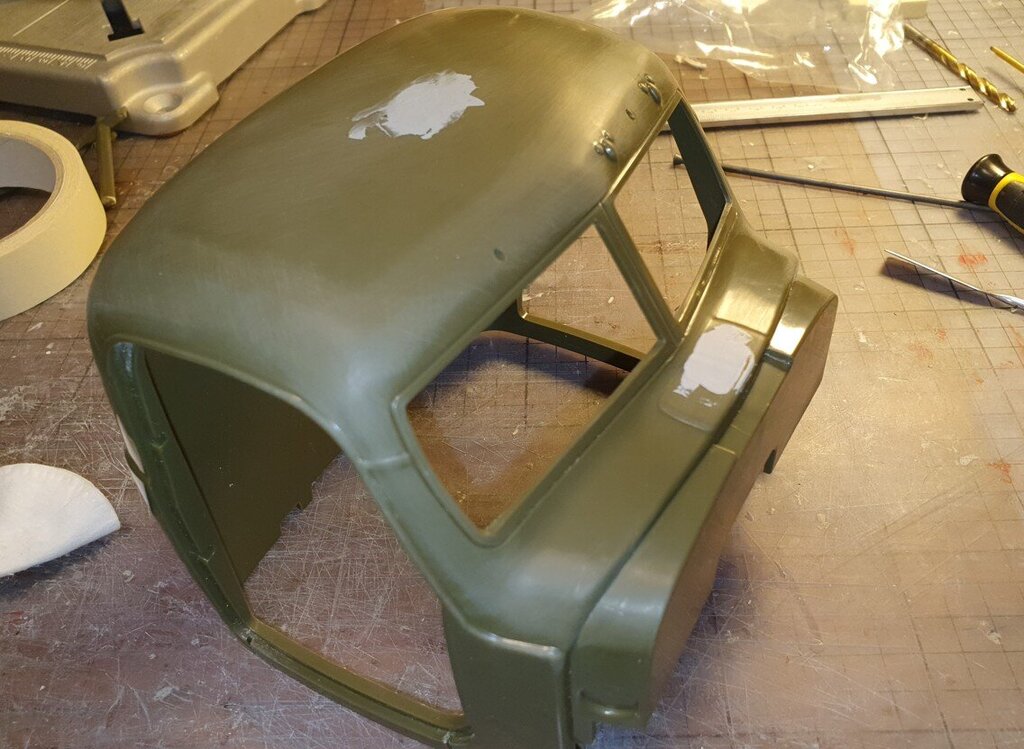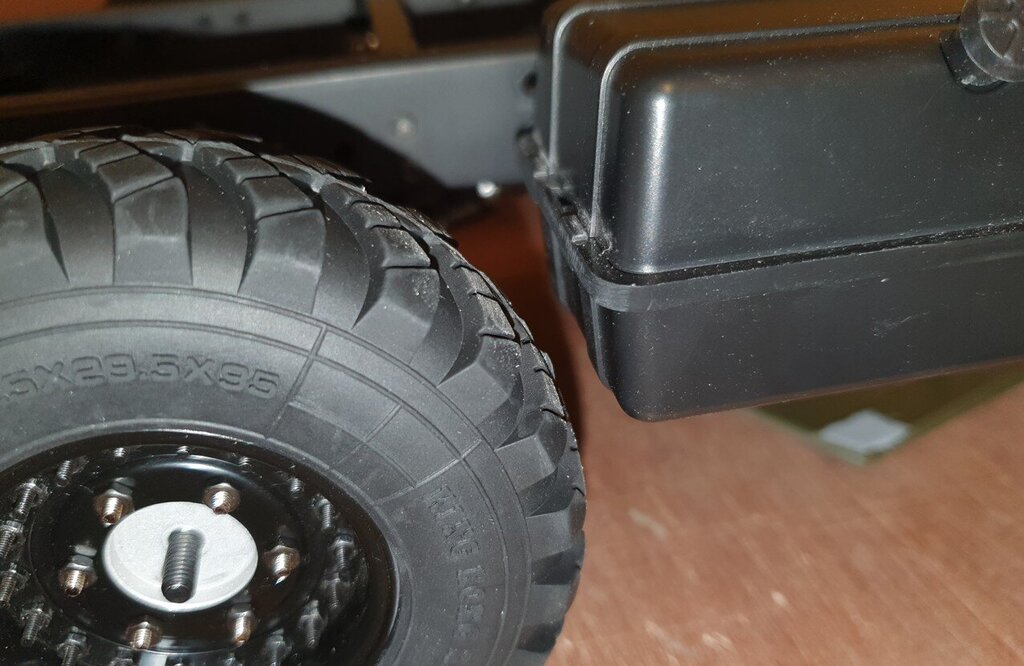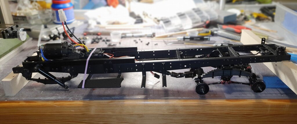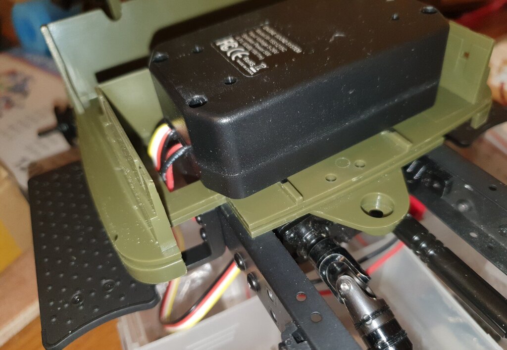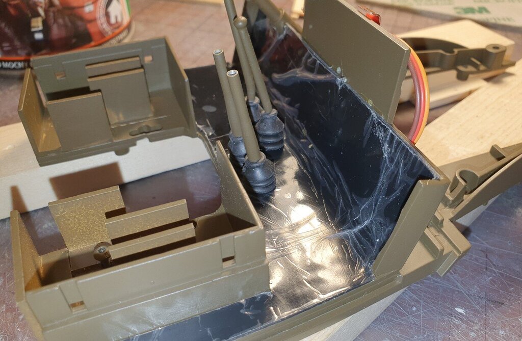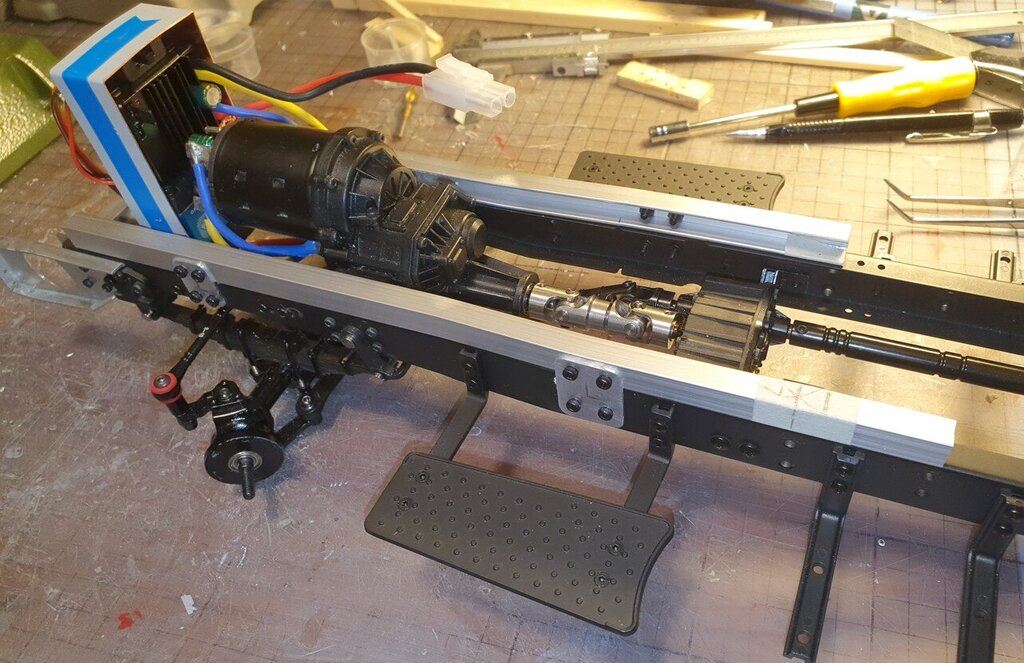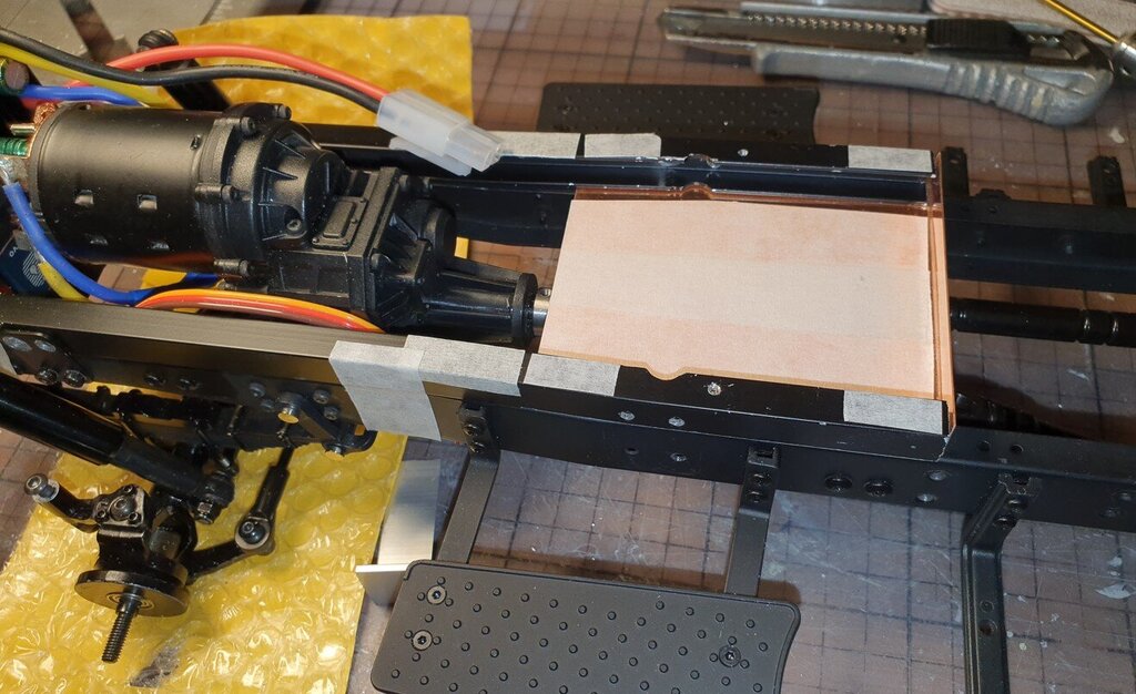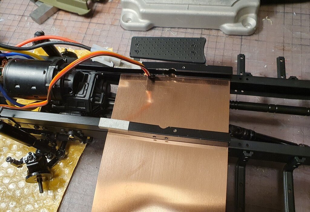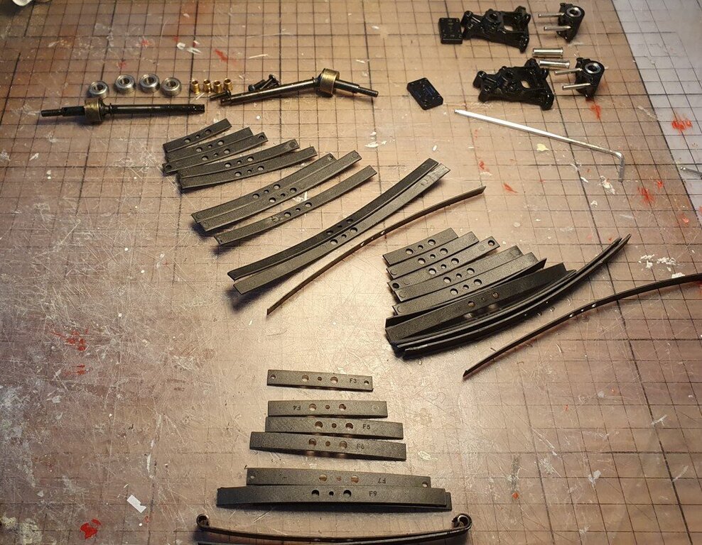 Oczywiście zapraszam do oglądania. W oryginale na wyjściu z przekładni jest wał sztywny. Trudno było to spasować, przez co napęd mocno hałasował... Zamieniłem go na wał z kardanem. Długość wału 45-52 mm... Po zmontowaniu napęd pracuje bezszelestnie. Jest super.... W międzyczasie zobaczyłem co jest w przekładni. Obudowa metalowa, koła zębate metalowe, łożyska kulowe na wałach głównych i pośrednich. wszystko wypełnione smarem. Zmontowałem z powrotem bo wszystko było jak powinno być. Tu drobne elementy, które były odłamane i przez to model był mocno preceniony.... Klamek np są 4 sztuki. Stweirdziłem,że zrobię ziła bardziej bojowego i podniosłem kabinę o 10 mm. W tym celu użyłem aluminiowy profil C. Wygiąłem go w imadle i przyciąłem na wymiar... Dodakowe podłużnice pomalowałem na czarny półmat. Widoczne blaszki do przykręcenia podłużnicy do ramy oraz uchwyt do ESC napędu głównego... Założyłem silnik 6V, 540, 80T. Zależało mi, aby model miał możliwość pełzania. Prędkość maksymalna jest także odpowiednia... Podniesienie szoferki wymusiło dołożenie chlapaczy do błotników przednich. Wykorzystałem chlapacze od modelu HG P801... Dzięki podniesieniu mam miejsce na założenie przednich amortyzatorów... Nabyłem dość dobrze wykonane amortyzatory powitrzne, jako, że będą one w zasadzie dekoracją.... Obudowy pomalowałem na czarno.... Użyte serwo.... Tu wcześniejsze próby z amortyzatorami od HG P801.... Teraz pokażę jak zrobiłem uchwyty do amortyzatorów. Użyłem blachy miedzianej 0,5 mm.... Zdfjęcia z amortyzatorami na wcześniejszem etapie przed zmianą. Wydały mi się one zbyt masywne... Uchwyt do ESC. Skrywa także włącznik ESC. Całość zamontowana na serwie skrętu... Rama w całej okazałości.... Model duży, ale miejscem za bardzo nie mogę szastać, bo jednak wyposażenia planuję troche w niego włożyć. Wprowadzone zmiany dały wolne miejsce pomiędzy szoferką, a skrzynią. Postanowiłem zamontować tam kanistry. Wykorzystałem gotowce. Wykonałem tylko uchwyty. Z blachy miedzianej 0.3 mm pociąłem paski.... -
