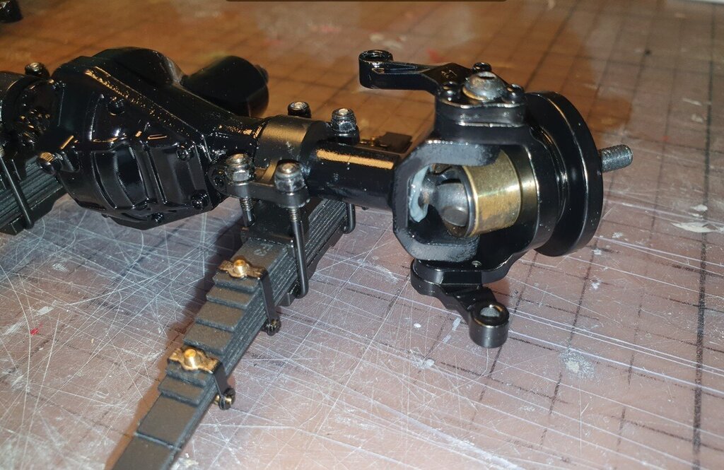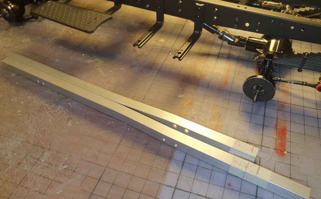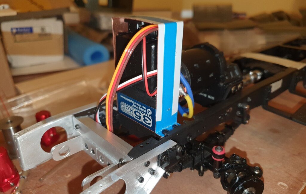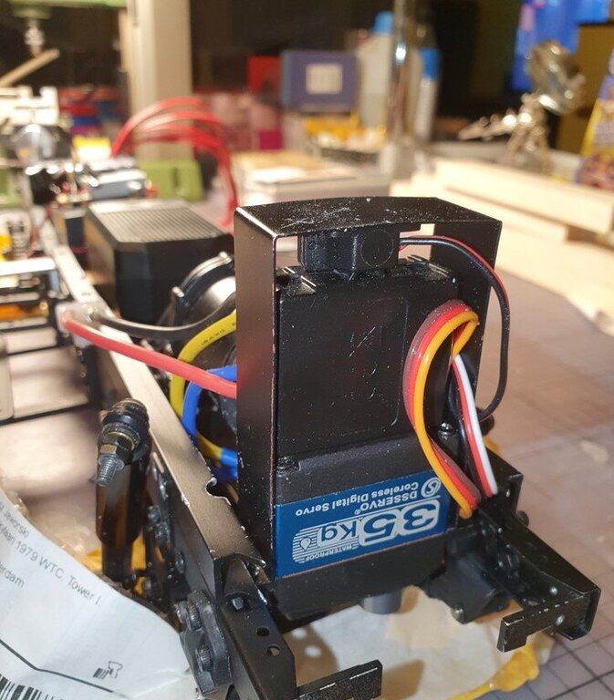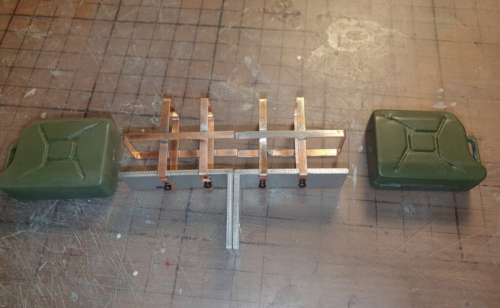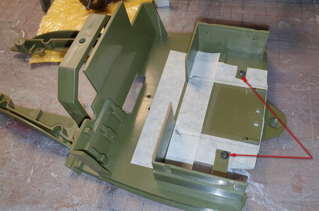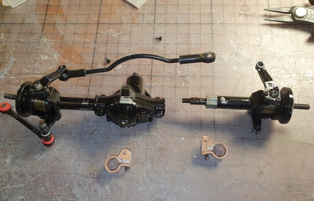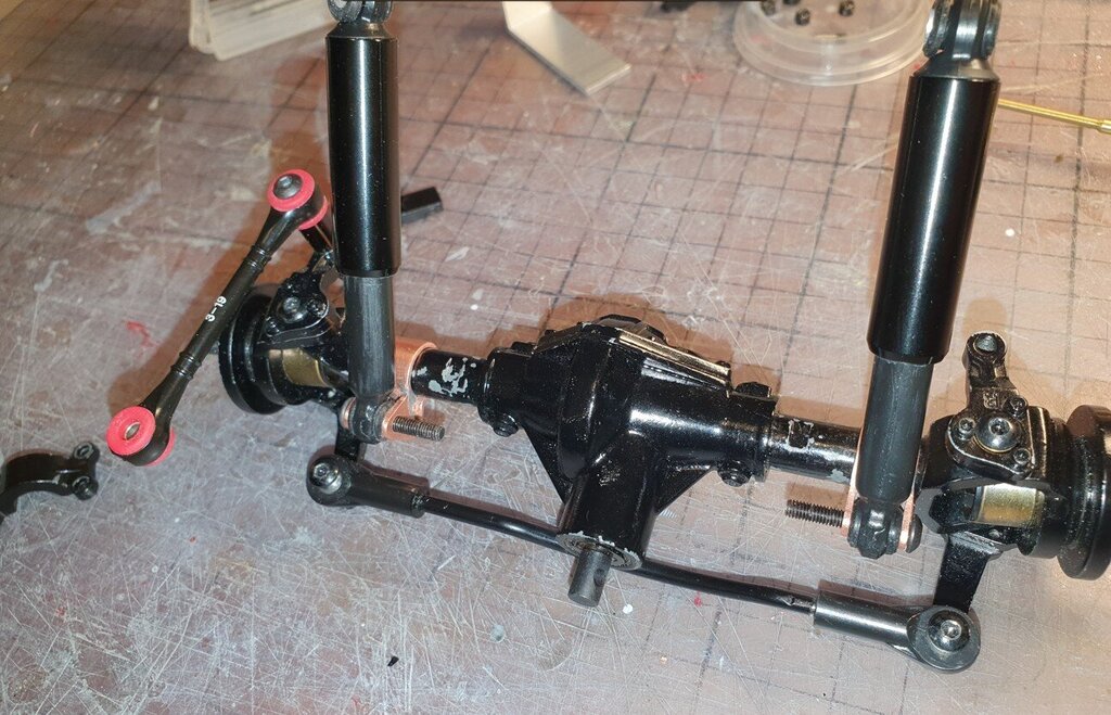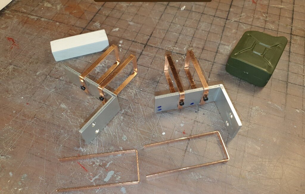 Oczywiście zapraszam do oglądania. W oryginale na wyjściu z przekładni jest wał sztywny. Trudno było to spasować, przez co napęd mocno hałasował... Zamieniłem go na wał z kardanem. Długość wału 45-52 mm... Po zmontowaniu napęd pracuje bezszelestnie. Jest super.... W międzyczasie zobaczyłem co jest w przekładni. Obudowa metalowa, koła zębate metalowe, łożyska kulowe na wałach głównych i pośrednich. wszystko wypełnione smarem. Zmontowałem z powrotem bo wszystko było jak powinno być. Tu drobne elementy, które były odłamane i przez to model był mocno preceniony.... Klamek np są 4 sztuki. Stweirdziłem,że zrobię ziła bardziej bojowego i podniosłem kabinę o 10 mm. W tym celu użyłem aluminiowy profil C. Wygiąłem go w imadle i przyciąłem na wymiar... Dodakowe podłużnice pomalowałem na czarny półmat. Widoczne blaszki do przykręcenia podłużnicy do ramy oraz uchwyt do ESC napędu głównego... Założyłem silnik 6V, 540, 80T. Zależało mi, aby model miał możliwość pełzania. Prędkość maksymalna jest także odpowiednia... Podniesienie szoferki wymusiło dołożenie chlapaczy do błotników przednich. Wykorzystałem chlapacze od modelu HG P801... Dzięki podniesieniu mam miejsce na założenie przednich amortyzatorów... Nabyłem dość dobrze wykonane amortyzatory powitrzne, jako, że będą one w zasadzie dekoracją.... Obudowy pomalowałem na czarno.... Użyte serwo.... Tu wcześniejsze próby z amortyzatorami od HG P801.... Teraz pokażę jak zrobiłem uchwyty do amortyzatorów. Użyłem blachy miedzianej 0,5 mm.... Zdfjęcia z amortyzatorami na wcześniejszem etapie przed zmianą. Wydały mi się one zbyt masywne... Uchwyt do ESC. Skrywa także włącznik ESC. Całość zamontowana na serwie skrętu... Rama w całej okazałości.... Model duży, ale miejscem za bardzo nie mogę szastać, bo jednak wyposażenia planuję troche w niego włożyć. Wprowadzone zmiany dały wolne miejsce pomiędzy szoferką, a skrzynią. Postanowiłem zamontować tam kanistry. Wykorzystałem gotowce. Wykonałem tylko uchwyty. Z blachy miedzianej 0.3 mm pociąłem paski.... -