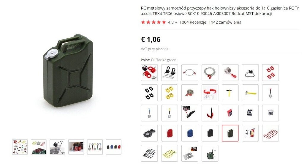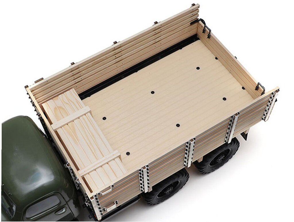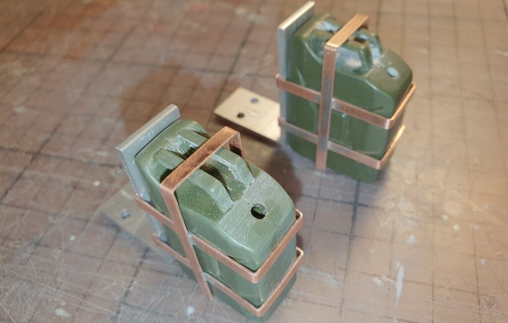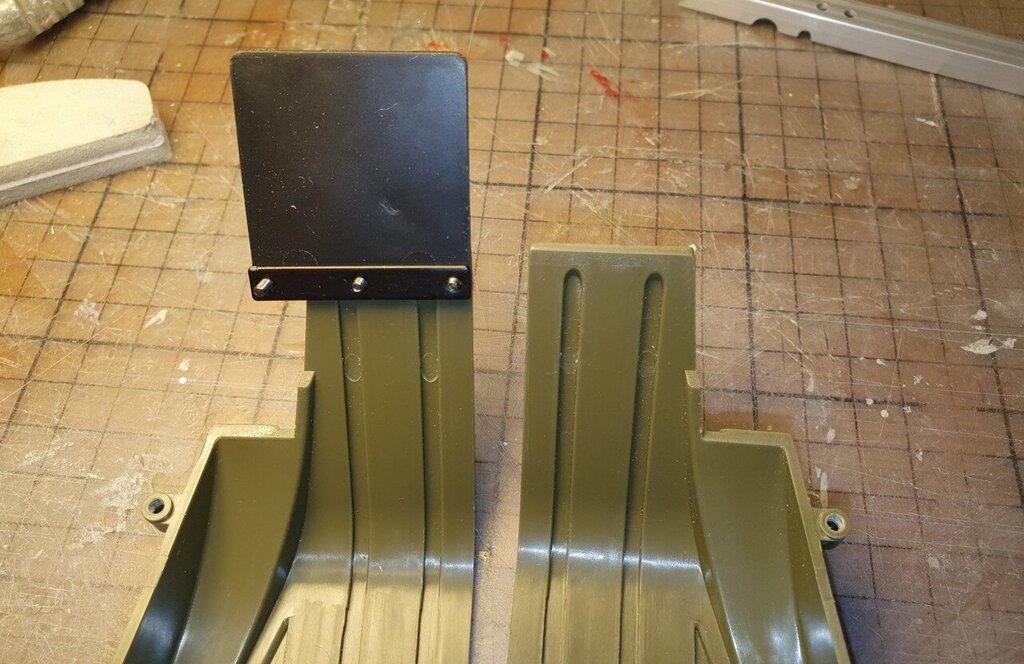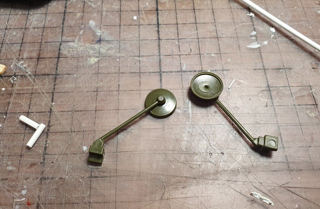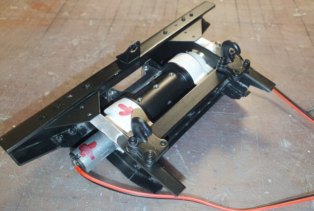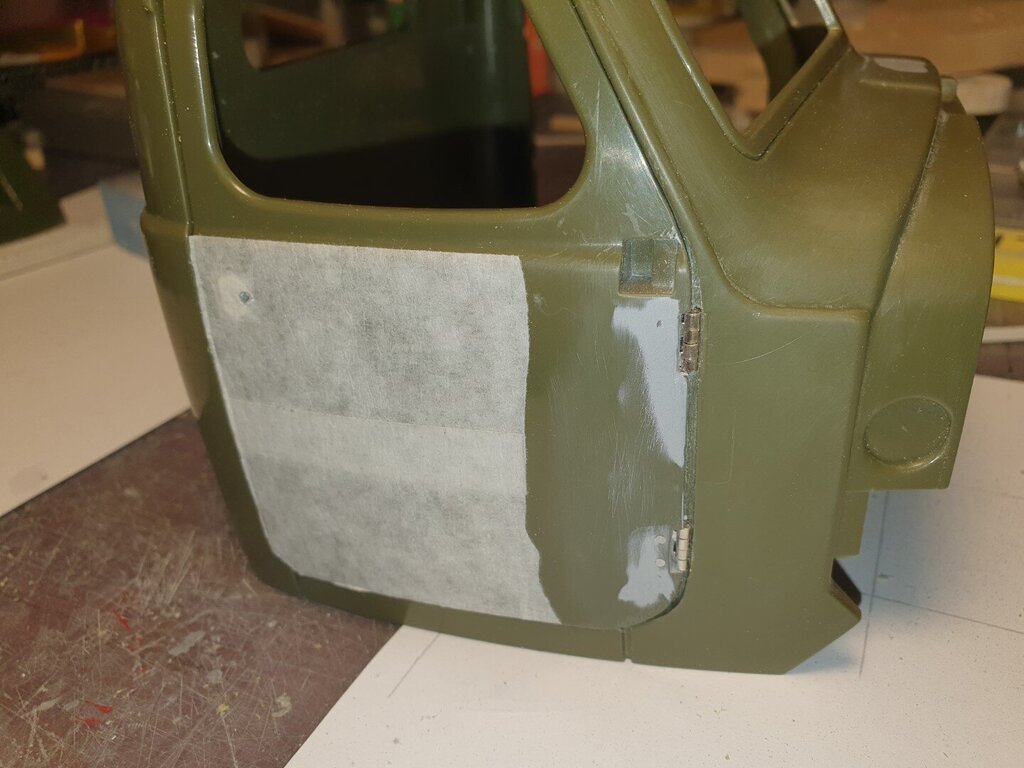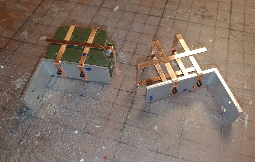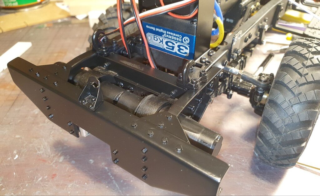 Oczywiście zapraszam do oglądania. W oryginale na wyjściu z przekładni jest wał sztywny. Trudno było to spasować, przez co napęd mocno hałasował... Zamieniłem go na wał z kardanem. Długość wału 45-52 mm... Po zmontowaniu napęd pracuje bezszelestnie. Jest super.... W międzyczasie zobaczyłem co jest w przekładni. Obudowa metalowa, koła zębate metalowe, łożyska kulowe na wałach głównych i pośrednich. wszystko wypełnione smarem. Zmontowałem z powrotem bo wszystko było jak powinno być. Tu drobne elementy, które były odłamane i przez to model był mocno preceniony.... Klamek np są 4 sztuki. Stweirdziłem,że zrobię ziła bardziej bojowego i podniosłem kabinę o 10 mm. W tym celu użyłem aluminiowy profil C. Wygiąłem go w imadle i przyciąłem na wymiar... Dodakowe podłużnice pomalowałem na czarny półmat. Widoczne blaszki do przykręcenia podłużnicy do ramy oraz uchwyt do ESC napędu głównego... Założyłem silnik 6V, 540, 80T. Zależało mi, aby model miał możliwość pełzania. Prędkość maksymalna jest także odpowiednia... Podniesienie szoferki wymusiło dołożenie chlapaczy do błotników przednich. Wykorzystałem chlapacze od modelu HG P801... Dzięki podniesieniu mam miejsce na założenie przednich amortyzatorów... Nabyłem dość dobrze wykonane amortyzatory powitrzne, jako, że będą one w zasadzie dekoracją.... Obudowy pomalowałem na czarno.... Użyte serwo.... Tu wcześniejsze próby z amortyzatorami od HG P801.... Teraz pokażę jak zrobiłem uchwyty do amortyzatorów. Użyłem blachy miedzianej 0,5 mm.... Zdfjęcia z amortyzatorami na wcześniejszem etapie przed zmianą. Wydały mi się one zbyt masywne... Uchwyt do ESC. Skrywa także włącznik ESC. Całość zamontowana na serwie skrętu... Rama w całej okazałości.... Model duży, ale miejscem za bardzo nie mogę szastać, bo jednak wyposażenia planuję troche w niego włożyć. Wprowadzone zmiany dały wolne miejsce pomiędzy szoferką, a skrzynią. Postanowiłem zamontować tam kanistry. Wykorzystałem gotowce. Wykonałem tylko uchwyty. Z blachy miedzianej 0.3 mm pociąłem paski.... -