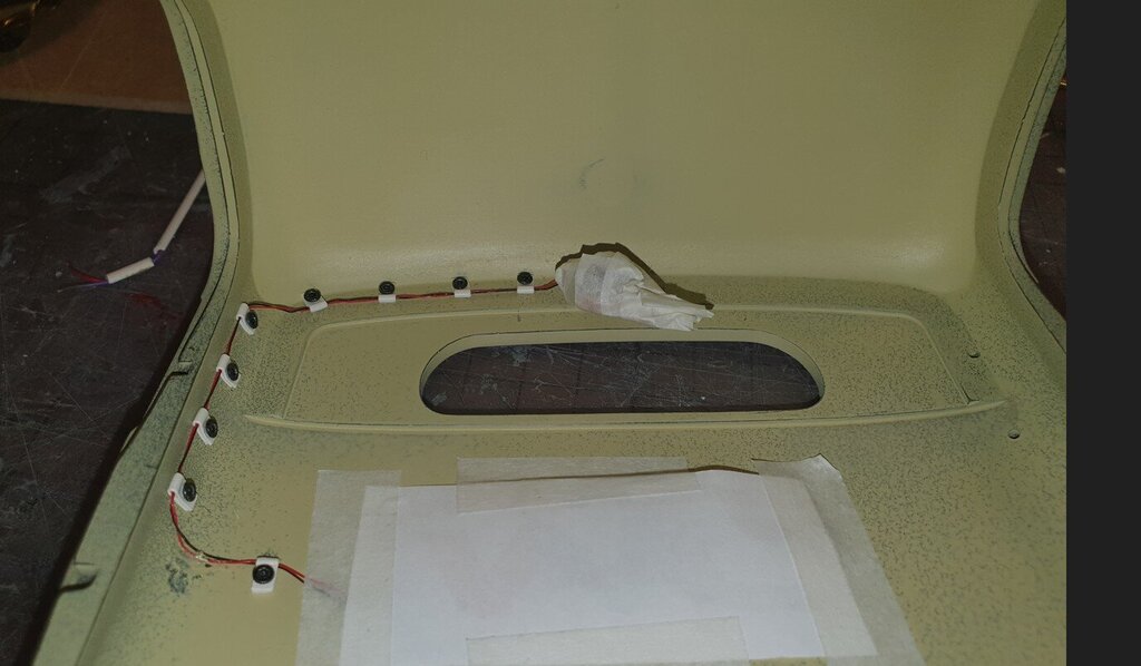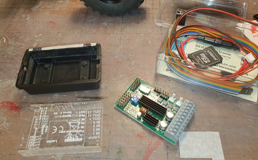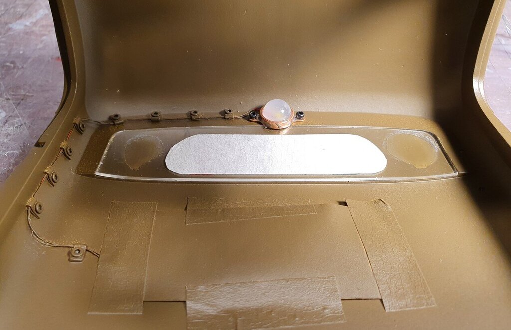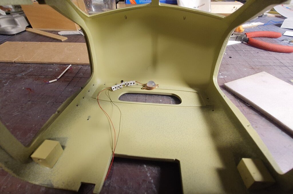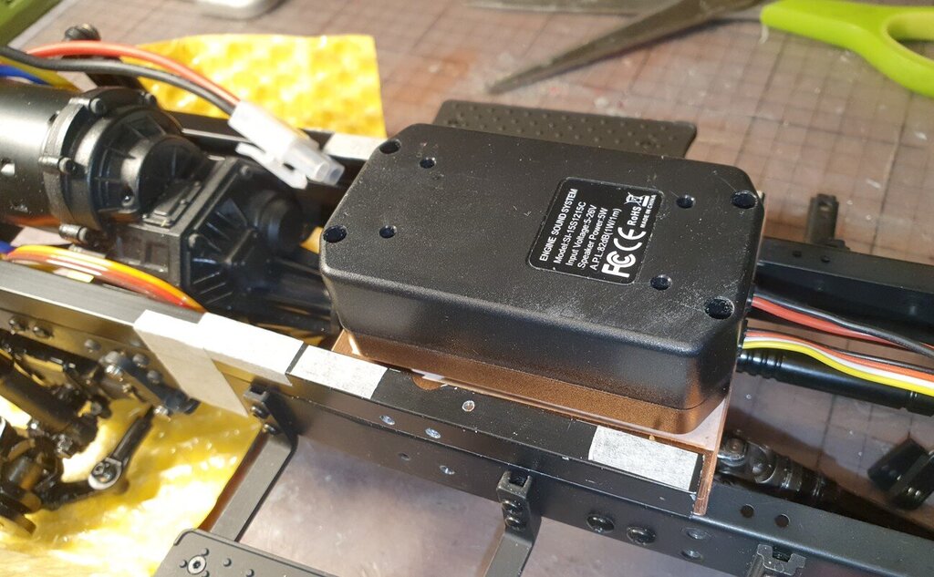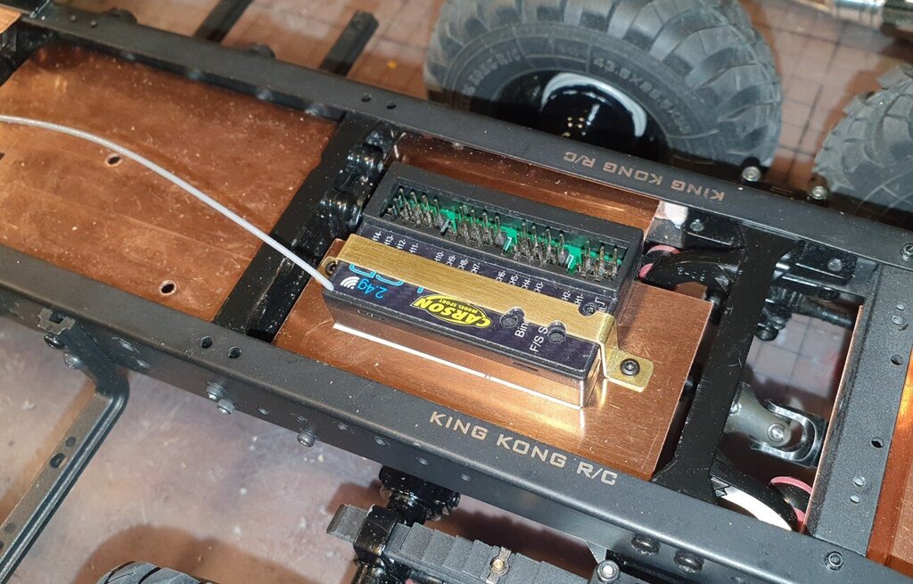 Coś nie tak z tym tematem. Nie wiem czemu nie dzieli się na strony. Przez to jest bardzo trudno oglądać. Nie znalazłem jak skontaktować sie z moderatorem. Może ktoś wie jak? Całe wyposażenie elektryczne schowam pod skrzynią pomiędzy podłużnicami ramy, pod kabiną, maską silnika oraz w zbiornikach paliwa. Dzięki temu cała skrzynia będzie pusta. Planowanie poprzedziłem wielkrotnymi próbami i doborem wyposażenia. Jako, że jest to prototyp, to zmian w międzyczasie było dużo i dalej są. W planie jest do zamontowania: 1. Oświetlenie - bez kierunkowskazów. System oparty na włącznikach RC (5 sztuk). Czyli jeden obwód lamp - jeden kanał na nadajniku 2. Moduł dźwięku, chciałem zainstalować CAR SENSE ES-ONE, nawet go kupiłem i wpasowałem, ale ostatecznie stwierdziłem, że daje on dźwięk zbyt zabawkowy. W ostateczności pokusiłem się o Beier Sound Module UCM-RC-2 3. Moduł dumu. Wykorzystam gotowy moduł od czołgu Heng Long 1:16 + ECS 30A 4. Serwo skrętu kół przednich 35 kg 5. Serwo obrotu kierownicy 0.45 kg/cm + rewerser + wzmacniacz 6. Silnik napędu głównego brushed 6V 540 80T, ESC 60A 7. Głośnik 5W + obudowa 8. odbiornik CARSON Reflex Stick Multi Pro LCD 14CH 9. Moduł nadawania sygnału do świateł przyczepy - G150 Wireless Lamp Control 4CH 10. ESC wciągarki 30A 11. Bateria Li-Ion 7.4V 3700 mAh 2S, 22x42x72 150 g No to po kolei...., albo i nie :)... Tu będzie głośnik... Jedna z przymiarek modułu CAR SENSE ES-ONE, który ostatczenie nie został zamontowany... Wnętrze tego modułu. Programowanie za pomocą kabla USB bezpośrednio z komputera.... W widoku od spodu kolejne osłony. Ni cnie może dodtykać wałów.... Pozostałe miejsca na elementy.... Tu jest miejsce na wszystkie elementy.... wytwornica dymu.... od lewej - wytwornica dymu, odbiornik, nadajnik do przyczepy... w wytwornicy musiałem pzebudować wyjście dymu, oraz ją zeszlifować z dołu i z góry w celu zmniejszenia wysokości. Maksymalna dostępna wysokośc wnętrza to 30 mm... wytwornica dymu wewnątrz.... mocowanie odbiornika.... planowanie rozmieszczenia listew połączeniowych dla bieguna dodatniego i ujemnego... uchwyt na baterię... obok baterii wskażnik z alarmem akustycznym niskiego poziomu napięcia przygotowanie do osadzenia modułu dźwięku w prawym zbiorniku paliwa. W lewym będą włączniki RC.... Ściany zbiornika zostały przefrezowane, aby moduł się ładnie zmieścił.... budowanie obudowy głośnika z twardego PCV grubości 2 mm dla zabawy zrobiłem bardzo długi kanał basowy. ... znalazłem głośnik o odpowiednich parametrach dźwięku, jak i wymiarach zewnętrznych. Głośnik jest od flat TV.... wnętrze głośnika wykleiłem matą głuszącą - ot tak dla zabawy ... u dołu jest podłużne ujście basu ..... Oj będzie grzmot.... głośnik zamontowany pod fotelem w szoferce.... Aby przyjemnie móc używać modelu, trzeba zrobić wyłącznik dla modułu dźwięku i dymu. W końcu nie zawsze chce się tego używać. Chciałem, aby włączniki były, ale aby ich zarazem nie było... Postanowiłem zrobić je w postaci dźwigni dla kierowcy. Użyłem zwykłe włączniki dwpozycyjne. Jako osłony dźwigni użyłem koszulki do linek. Reszta to podstawowe materiały - pręty mosiężne i rurki aluminiowe. Na główki dźwigni użyłem ..... koraliki jakich wiele w pudełku córki ... plastikowe miechy też zostały zastąpione gumowymi... i przymiarka w kabinie... Tylko dwie z czterech dźwigni będą aktywne... na podłogę położyłem gładka wykładzinę gumową grubości 1 mm. Prążkowanej nie udało mi się póki co znależć.... Tu jeszcze w folii ochronnej jak to w nowym aucie w fabryce bywa. Model nie będzie postarzany, jak to robi wielu kolegów. Ten będzie jak spod igły. Ot, takie marzenie robotników w niezaprzyjaźnionym kraju.... Pomalowałem kierownicę i wyposażyłem w drążek stalowy... W lusterkach zmieniłem wysięgniki na metalowe. Lusterka będą miały możlowość regulacji we wszystkie strony... końce od strony lusterek nagwintowałem... Kanapę wyłożyłem gąbką i obiłem skórą... A co, niech szweje mają komfortowo .... do klejenia użyłem butaprenu.... Wykonałem lampkę do oświetlenia szoferki. Obudowa z miedzi, rurka 12x1, a klosz z diody białej mlecznej 10 mm. Wewnątrz włożyłem diodę 1206 warm white. Diodę zalałem żywicą... teraz okablowanie w szoferce. Pasek PCV i wiertło 1 mm.... po wklejeniu szyby tylniej.... to brzydkie będzie za oparciem kanapy .... -