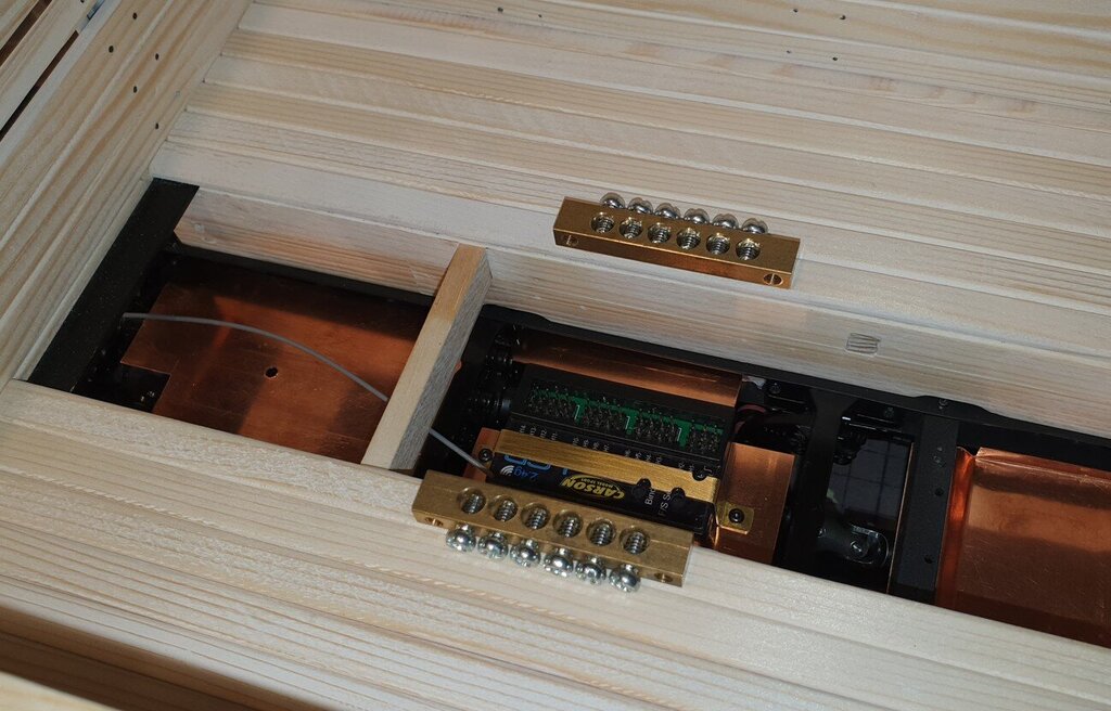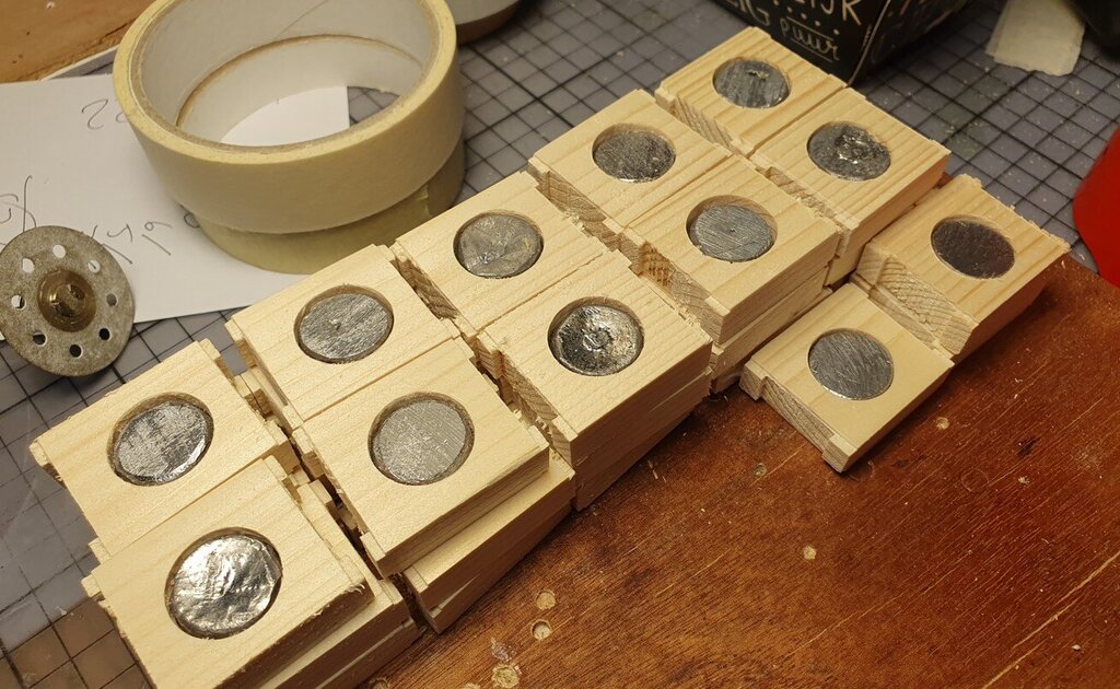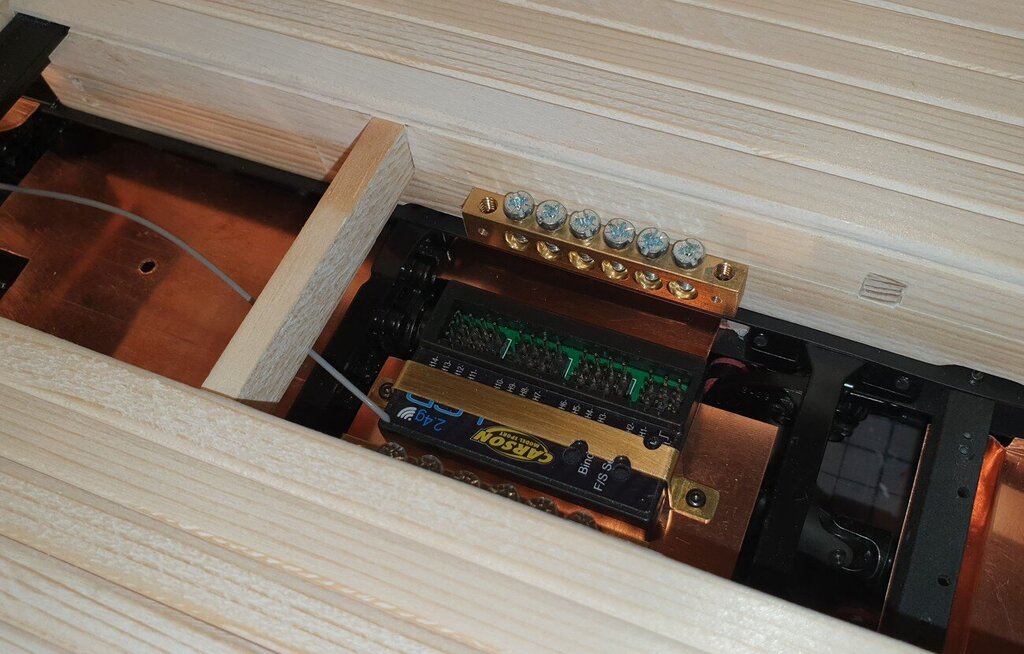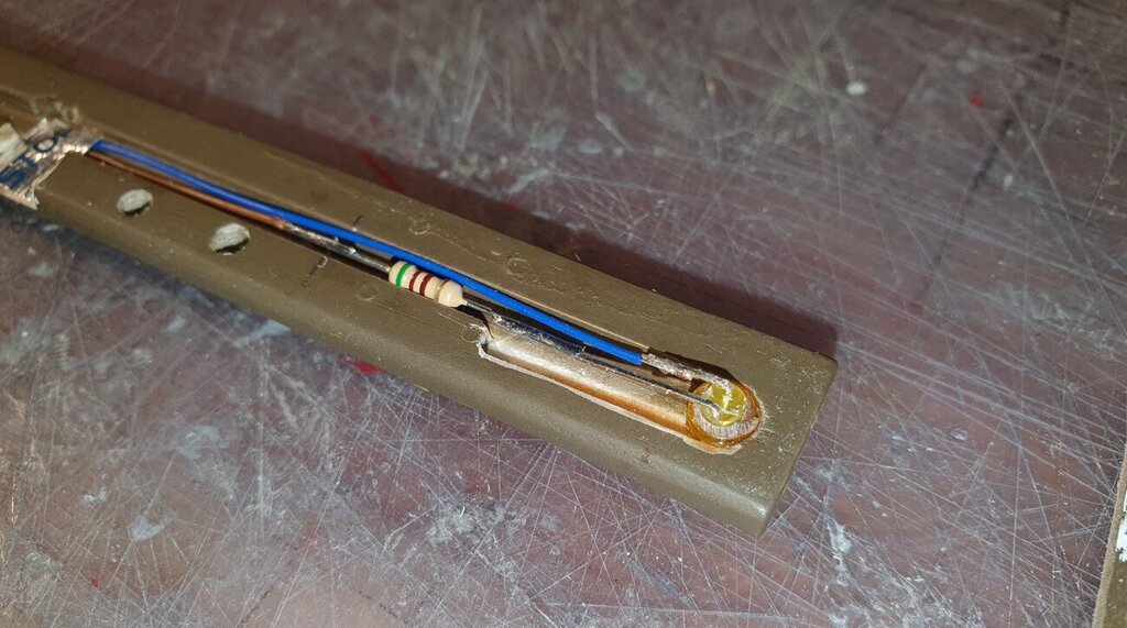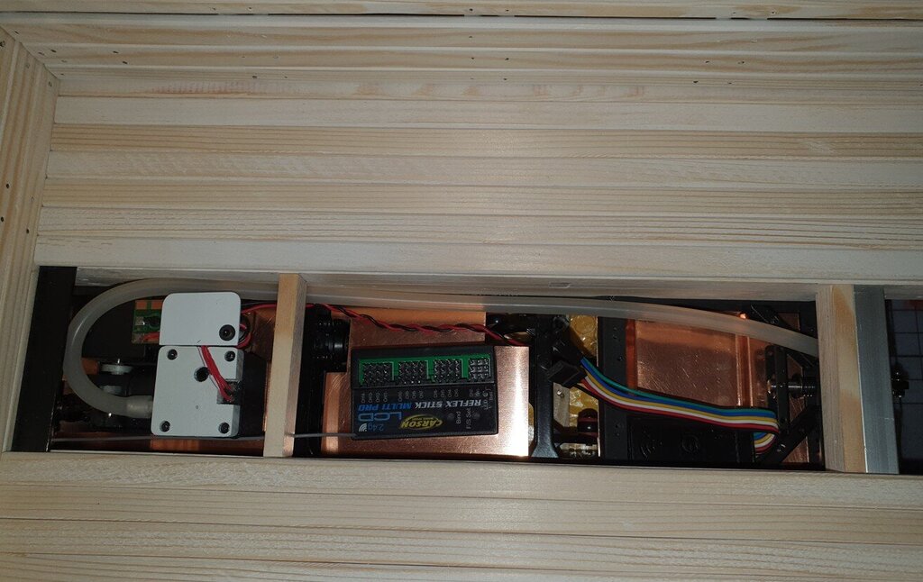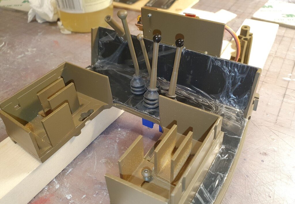 Coś nie tak z tym tematem. Nie wiem czemu nie dzieli się na strony. Przez to jest bardzo trudno oglądać. Nie znalazłem jak skontaktować sie z moderatorem. Może ktoś wie jak? Całe wyposażenie elektryczne schowam pod skrzynią pomiędzy podłużnicami ramy, pod kabiną, maską silnika oraz w zbiornikach paliwa. Dzięki temu cała skrzynia będzie pusta. Planowanie poprzedziłem wielkrotnymi próbami i doborem wyposażenia. Jako, że jest to prototyp, to zmian w międzyczasie było dużo i dalej są. W planie jest do zamontowania: 1. Oświetlenie - bez kierunkowskazów. System oparty na włącznikach RC (5 sztuk). Czyli jeden obwód lamp - jeden kanał na nadajniku 2. Moduł dźwięku, chciałem zainstalować CAR SENSE ES-ONE, nawet go kupiłem i wpasowałem, ale ostatecznie stwierdziłem, że daje on dźwięk zbyt zabawkowy. W ostateczności pokusiłem się o Beier Sound Module UCM-RC-2 3. Moduł dumu. Wykorzystam gotowy moduł od czołgu Heng Long 1:16 + ECS 30A 4. Serwo skrętu kół przednich 35 kg 5. Serwo obrotu kierownicy 0.45 kg/cm + rewerser + wzmacniacz 6. Silnik napędu głównego brushed 6V 540 80T, ESC 60A 7. Głośnik 5W + obudowa 8. odbiornik CARSON Reflex Stick Multi Pro LCD 14CH 9. Moduł nadawania sygnału do świateł przyczepy - G150 Wireless Lamp Control 4CH 10. ESC wciągarki 30A 11. Bateria Li-Ion 7.4V 3700 mAh 2S, 22x42x72 150 g No to po kolei...., albo i nie :)... Tu będzie głośnik... Jedna z przymiarek modułu CAR SENSE ES-ONE, który ostatczenie nie został zamontowany... Wnętrze tego modułu. Programowanie za pomocą kabla USB bezpośrednio z komputera.... W widoku od spodu kolejne osłony. Ni cnie może dodtykać wałów.... Pozostałe miejsca na elementy.... Tu jest miejsce na wszystkie elementy.... wytwornica dymu.... od lewej - wytwornica dymu, odbiornik, nadajnik do przyczepy... w wytwornicy musiałem pzebudować wyjście dymu, oraz ją zeszlifować z dołu i z góry w celu zmniejszenia wysokości. Maksymalna dostępna wysokośc wnętrza to 30 mm... wytwornica dymu wewnątrz.... mocowanie odbiornika.... planowanie rozmieszczenia listew połączeniowych dla bieguna dodatniego i ujemnego... uchwyt na baterię... obok baterii wskażnik z alarmem akustycznym niskiego poziomu napięcia przygotowanie do osadzenia modułu dźwięku w prawym zbiorniku paliwa. W lewym będą włączniki RC.... Ściany zbiornika zostały przefrezowane, aby moduł się ładnie zmieścił.... budowanie obudowy głośnika z twardego PCV grubości 2 mm dla zabawy zrobiłem bardzo długi kanał basowy. ... znalazłem głośnik o odpowiednich parametrach dźwięku, jak i wymiarach zewnętrznych. Głośnik jest od flat TV.... wnętrze głośnika wykleiłem matą głuszącą - ot tak dla zabawy ... u dołu jest podłużne ujście basu ..... Oj będzie grzmot.... głośnik zamontowany pod fotelem w szoferce.... Aby przyjemnie móc używać modelu, trzeba zrobić wyłącznik dla modułu dźwięku i dymu. W końcu nie zawsze chce się tego używać. Chciałem, aby włączniki były, ale aby ich zarazem nie było... Postanowiłem zrobić je w postaci dźwigni dla kierowcy. Użyłem zwykłe włączniki dwpozycyjne. Jako osłony dźwigni użyłem koszulki do linek. Reszta to podstawowe materiały - pręty mosiężne i rurki aluminiowe. Na główki dźwigni użyłem ..... koraliki jakich wiele w pudełku córki ... plastikowe miechy też zostały zastąpione gumowymi... i przymiarka w kabinie... Tylko dwie z czterech dźwigni będą aktywne... na podłogę położyłem gładka wykładzinę gumową grubości 1 mm. Prążkowanej nie udało mi się póki co znależć.... Tu jeszcze w folii ochronnej jak to w nowym aucie w fabryce bywa. Model nie będzie postarzany, jak to robi wielu kolegów. Ten będzie jak spod igły. Ot, takie marzenie robotników w niezaprzyjaźnionym kraju.... Pomalowałem kierownicę i wyposażyłem w drążek stalowy... W lusterkach zmieniłem wysięgniki na metalowe. Lusterka będą miały możlowość regulacji we wszystkie strony... końce od strony lusterek nagwintowałem... Kanapę wyłożyłem gąbką i obiłem skórą... A co, niech szweje mają komfortowo .... do klejenia użyłem butaprenu.... Wykonałem lampkę do oświetlenia szoferki. Obudowa z miedzi, rurka 12x1, a klosz z diody białej mlecznej 10 mm. Wewnątrz włożyłem diodę 1206 warm white. Diodę zalałem żywicą... teraz okablowanie w szoferce. Pasek PCV i wiertło 1 mm.... po wklejeniu szyby tylniej.... to brzydkie będzie za oparciem kanapy .... -