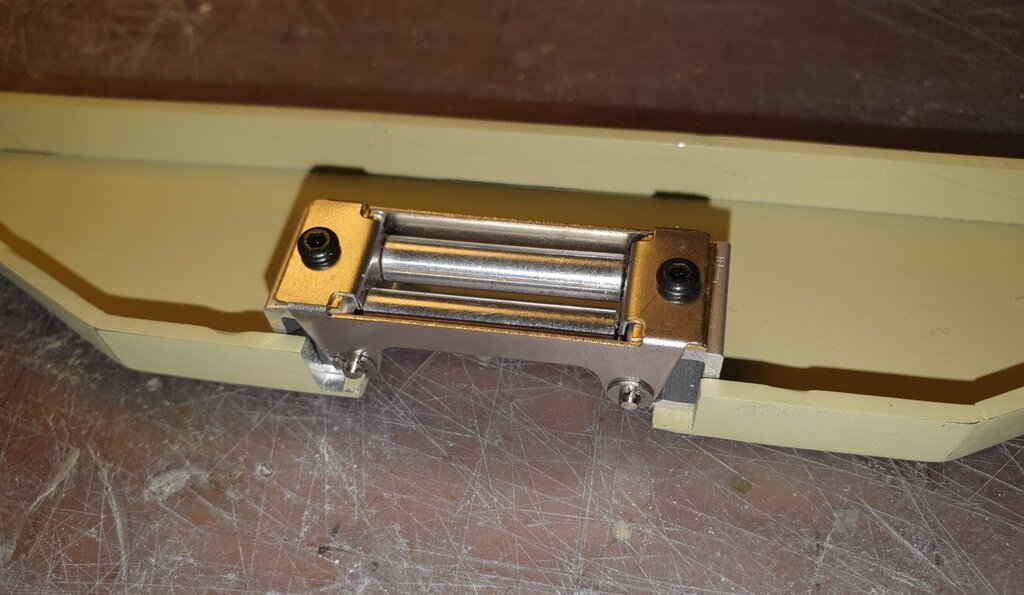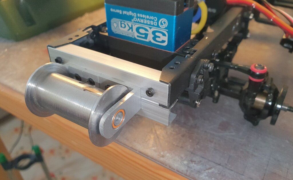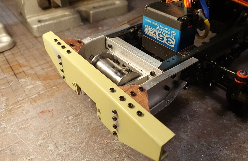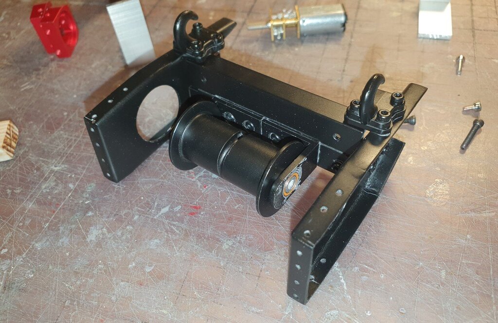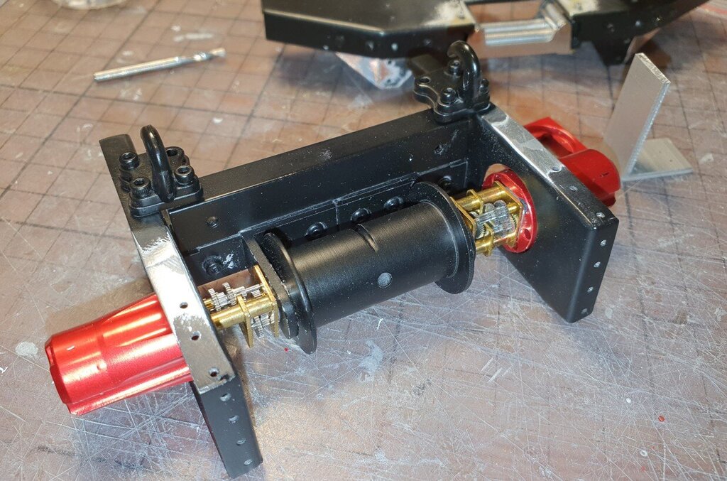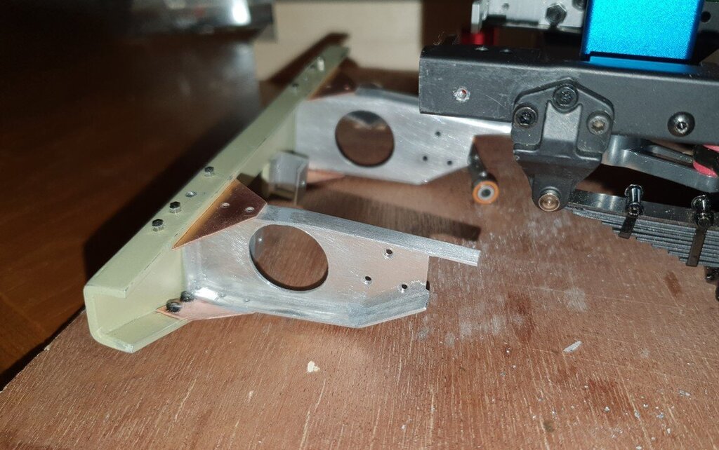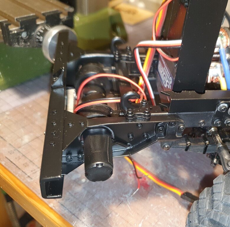 Znalazłem w necie fajne rysunki wciągarki oraz zdjęcia.Zecydowałem, że pokuszę się o zrobienie. Najpeirw zakupiłem gotową wciągarkę, aby wykorzystać to co tylko możliwe. Niestety wykorzystałem niewiele i to też na siłę. No ale poznałem budowe i o co w ty chodzi.... Czas na budowę. Konstrukcja z blachy aluminiowej, a wzmocnienia ramowe z blachy miedzianej. Zrezygnowałem ze zderzaka z zestawu.... Wzmocnienie pod wciągarkę.... Montując nowe elementy starałem się wykorzystywać istniejące otwory w ramie.... Najpierw model z papieru.... Potem trasowanie w metalu... i wycinanie na pile tarczowej.... Elementy gięte nacinałem do połowy grubości blachy.... Pierwsza przymiarka i potem bardzo duż przymiarek... Rolki wykorzystałem od innej wciągarki.... Boczne ściany pomalowane czarnym flamasterm dla lepszego wyobrażenia mocowania.... Wzmocnienia krzyżowe z blachy miedzianej .... Mocowanie na taśmę papierową.... Jako, że to jest prototyp, to przymiarek i korekt jest dużo. Zdjęcia to esencja kilku dni dopasowań.... Widoczne śrubki są tymczasowe. Docelowo będą z łbem sześciokątnym... Otwory na silniki wciągarki. Zamontuję dwa silniki 15 rpm/min.... prowadzenie do korby.... Nowe haki mocowane na 4 śruby. W wersji bez wciągarki były mocowane na dwie śruby... Do malowania użyłem farby TAMIYA TS-29 SEMI GLOSS BLACK.... Bęben specjalnie zaprojektowany... wytoczone ze stali i oparty na dwóch łożyskach kulowych... Dzieki takiemu mocowaniu łożyska silników nie są obciążone jak to jest w oryginalnej wersji wciągarki.. Całą siłę uciągu przeniszą łożyska i ich mocowanie.... Obudowy przekłani wykonałem z 4 wearsw PCV twardego grubości 4 mm każda..... Frezarka Proxxon jest niezastąpiona w takich małych pracach.... Wykonywałem dwia obudowy za jednym razem. Potem je rosdzieliłem.... Wał wciągarki jest wykonany z rurki aluminiowej 5x1. Dzięki takiemu kształtowi obudowy przekładni silników, lina nie będzie miała możliwości przycinać się pomiędzy obudową, a talerzem bębna wciągarki..... Ze zmintowaniem elementów w całość, było trochę główkowania co do kolejności. Ale się udało.... Zasilanie 6V... I tak prezentuje się na podwoziu.... Rózni sie od oryginału, ale i nie ma to być model redukcujny, a jedynie taka wolna ekspresja Ziła..... -