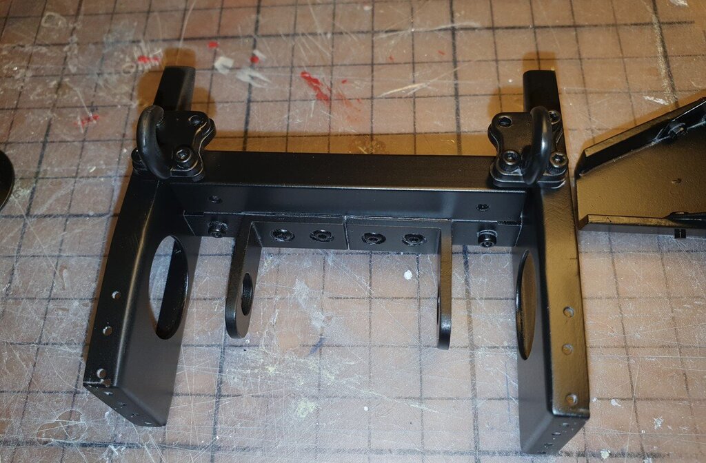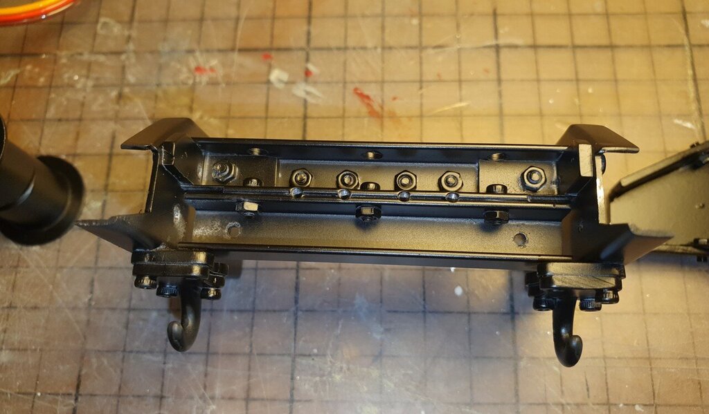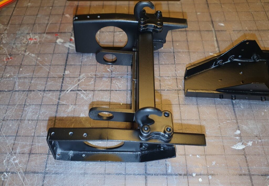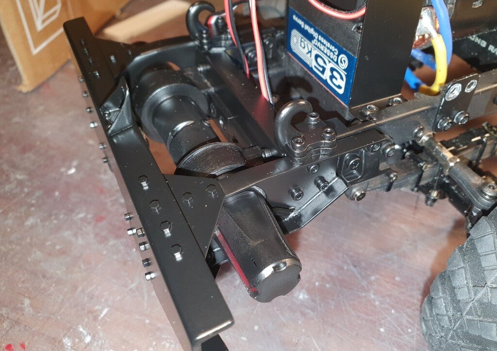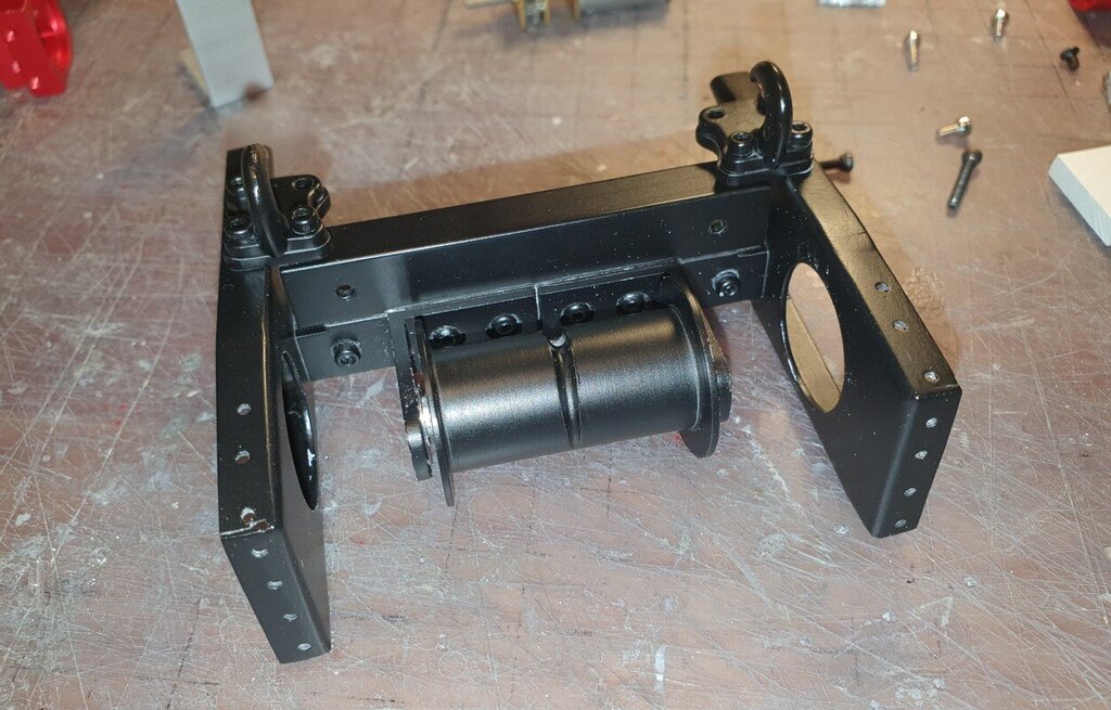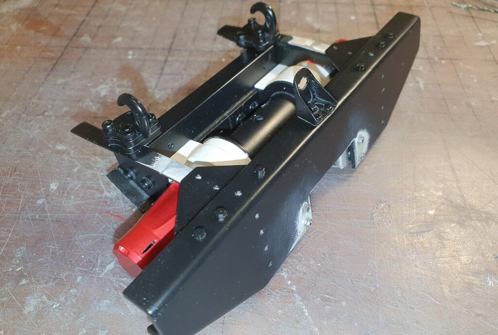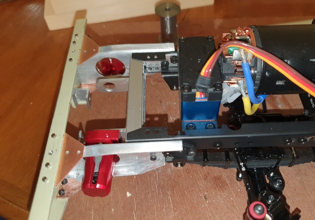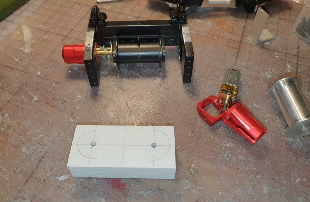 Znalazłem w necie fajne rysunki wciągarki oraz zdjęcia.Zecydowałem, że pokuszę się o zrobienie. Najpeirw zakupiłem gotową wciągarkę, aby wykorzystać to co tylko możliwe. Niestety wykorzystałem niewiele i to też na siłę. No ale poznałem budowe i o co w ty chodzi.... Czas na budowę. Konstrukcja z blachy aluminiowej, a wzmocnienia ramowe z blachy miedzianej. Zrezygnowałem ze zderzaka z zestawu.... Wzmocnienie pod wciągarkę.... Montując nowe elementy starałem się wykorzystywać istniejące otwory w ramie.... Najpierw model z papieru.... Potem trasowanie w metalu... i wycinanie na pile tarczowej.... Elementy gięte nacinałem do połowy grubości blachy.... Pierwsza przymiarka i potem bardzo duż przymiarek... Rolki wykorzystałem od innej wciągarki.... Boczne ściany pomalowane czarnym flamasterm dla lepszego wyobrażenia mocowania.... Wzmocnienia krzyżowe z blachy miedzianej .... Mocowanie na taśmę papierową.... Jako, że to jest prototyp, to przymiarek i korekt jest dużo. Zdjęcia to esencja kilku dni dopasowań.... Widoczne śrubki są tymczasowe. Docelowo będą z łbem sześciokątnym... Otwory na silniki wciągarki. Zamontuję dwa silniki 15 rpm/min.... prowadzenie do korby.... Nowe haki mocowane na 4 śruby. W wersji bez wciągarki były mocowane na dwie śruby... Do malowania użyłem farby TAMIYA TS-29 SEMI GLOSS BLACK.... Bęben specjalnie zaprojektowany... wytoczone ze stali i oparty na dwóch łożyskach kulowych... Dzieki takiemu mocowaniu łożyska silników nie są obciążone jak to jest w oryginalnej wersji wciągarki.. Całą siłę uciągu przeniszą łożyska i ich mocowanie.... Obudowy przekłani wykonałem z 4 wearsw PCV twardego grubości 4 mm każda..... Frezarka Proxxon jest niezastąpiona w takich małych pracach.... Wykonywałem dwia obudowy za jednym razem. Potem je rosdzieliłem.... Wał wciągarki jest wykonany z rurki aluminiowej 5x1. Dzięki takiemu kształtowi obudowy przekładni silników, lina nie będzie miała możliwości przycinać się pomiędzy obudową, a talerzem bębna wciągarki..... Ze zmintowaniem elementów w całość, było trochę główkowania co do kolejności. Ale się udało.... Zasilanie 6V... I tak prezentuje się na podwoziu.... Rózni sie od oryginału, ale i nie ma to być model redukcujny, a jedynie taka wolna ekspresja Ziła..... -