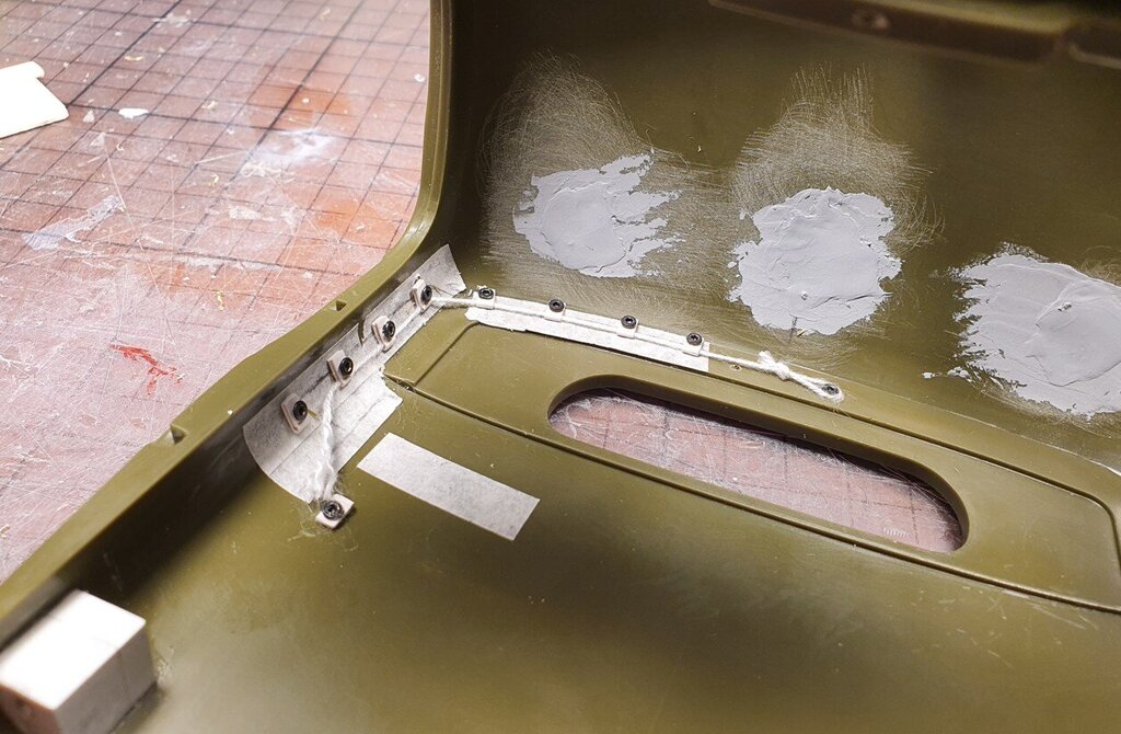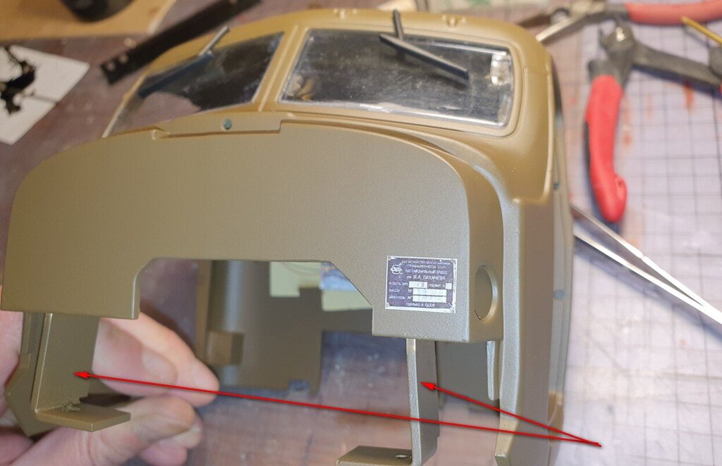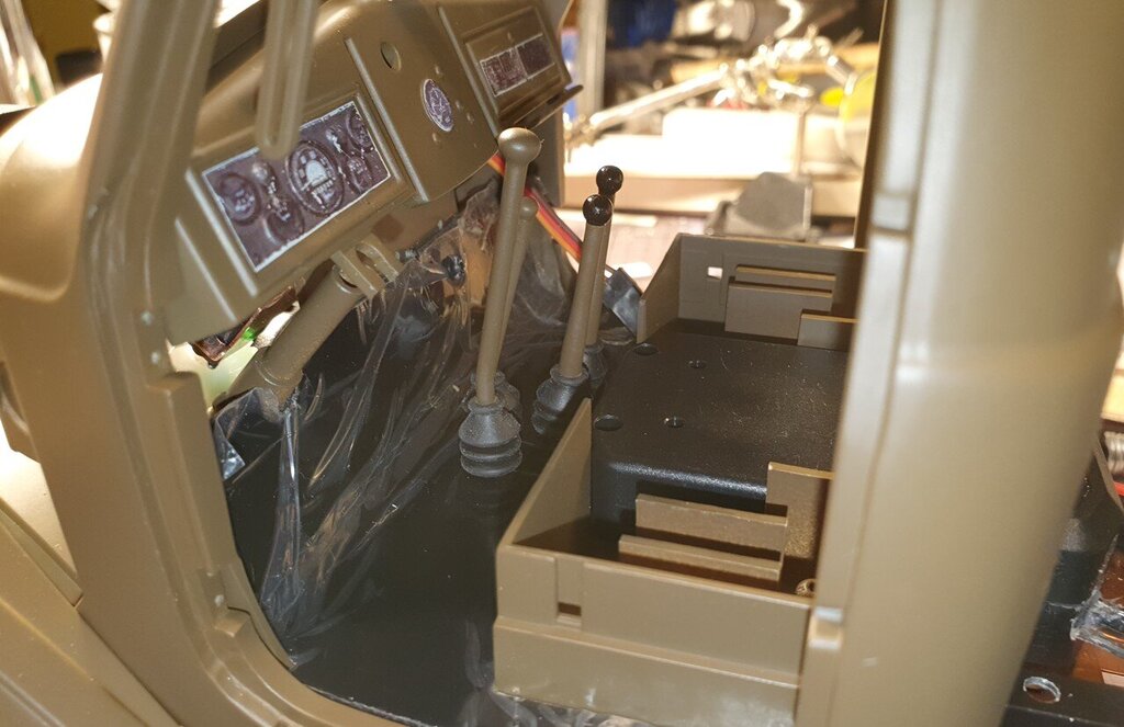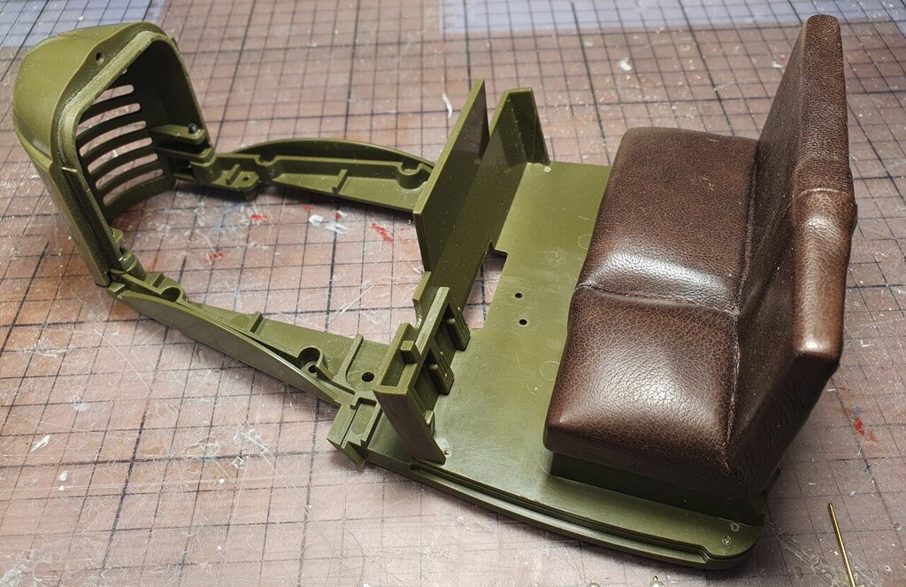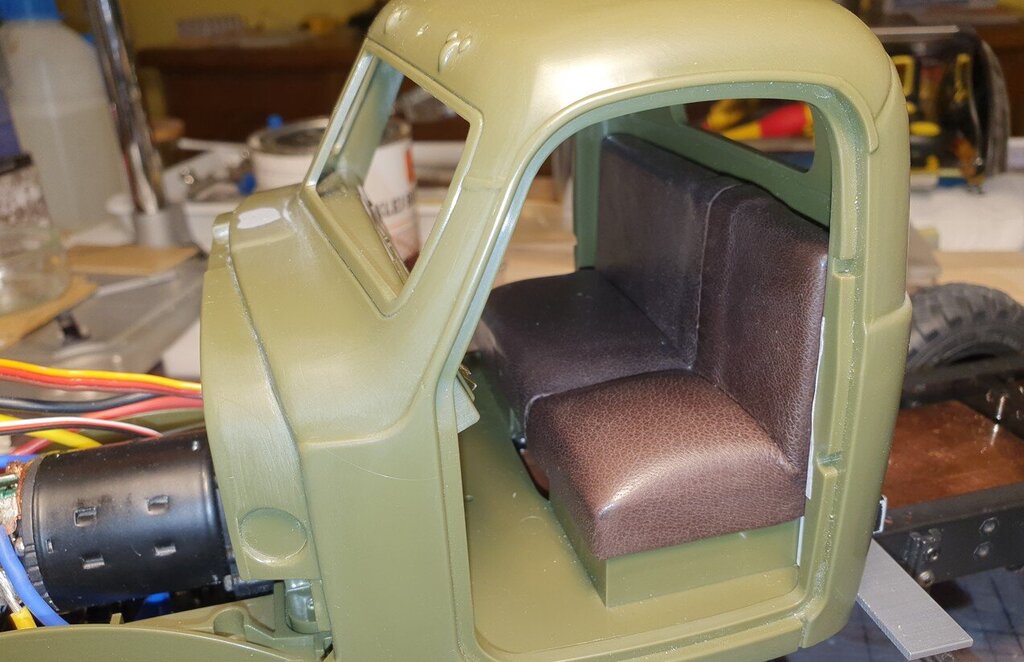 Zdjęcia są zredukowane do max 200-400 kb. Mniejsze by się źle oglądało wg mnie. Napisałem prośbę do administratora, aby coś zaradził na podział wątku na strony. Tu zdjęcie kanapy przed tapicerowaniem i widok oryginalnego mocowania kabiny do ramy. Ze względu na planowane przeróbki musiał ulec zmianie... Kabina wymagała małego szpachlowania. Używałem trochę szpachli TAMIYA. Nie jestem z niej zadowolony, bo ma duży skurcz po wyschnięciu. Trzeba szpachlować wiele razy.... Wewnątrz wyciąłem wszystkie niepotrzebne wzmocnienia.... oraz miejsce na głośnik.... również tył wymagał wycięcia.... Wycięte miejsce na skrzynię biegów. Jako, że kabina została przesunięta do przodu i kilka milimetrów... mocowanie kierownicy, aby mogła się obracać. Potem kolumna zostanie zmieniona na stalową.... kalkomanie niezbyt mistrzowskie.... tabliczka znamionowa i zaznaczone nowe mocowania kabiny do ramy.... w celu montażu silnika V8 zrobiłem wycięcie w przedniej części.... Silnik próbowałem zrobić samemu, ale jakoś wychodziło mi coś co przypominało bardziej trumnę. W originale był silnik R6. W innym wątku kolega wydrukował ładny silnik - brawo!!! No, ale ja nie wydrukowałem i włożyłem gotowca V8. Takie marzenie każdego właściciela prawdziwego ZIŁ-a. Obudowa skrywa też 2 wentylatory załączone odzielnym włącznikiem widocznym na zdjęciu. Umieszczony jest powyżej włącznika ESC... Silnik dostał też atrapę chłodnicy wykonaną z radiatora aluminiowego... dół i górę chłodnicy zrobiłem z pół rurki PCV... pomalowane na srebrno... wyfrezowałem uchwyt.... pomalowałem gril. U dołu widoczne wycięcie na korbę.... i złożyłem.... -