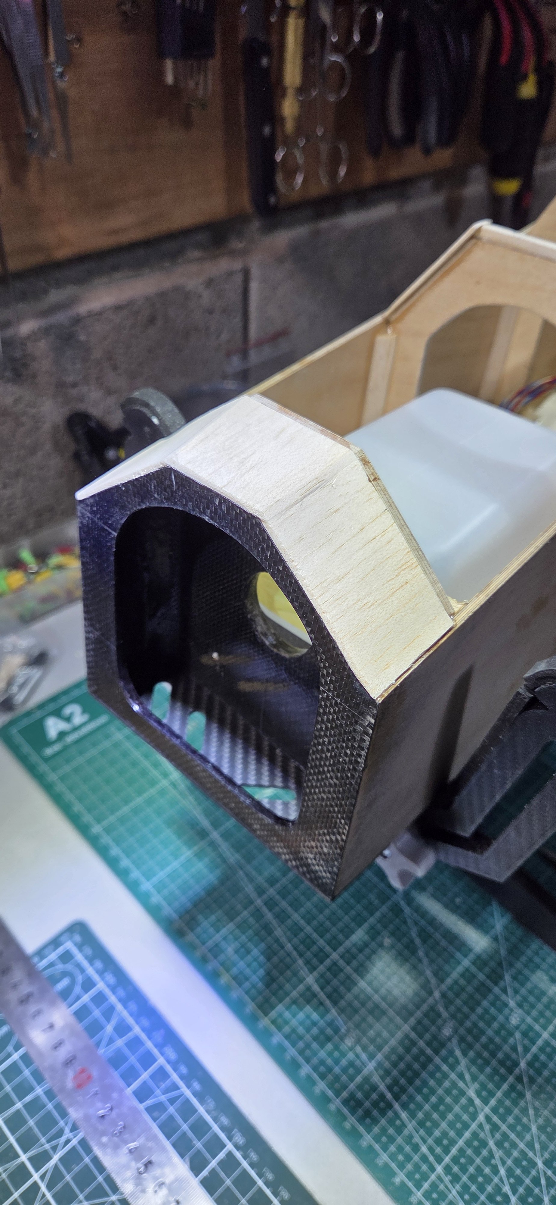 Mały kroczek do przodu... Postanowiłem, że dostęp do osprzętu będzie od spodu kadłuba. Zrobiłem wsporniki z nakrętkami i pokrycie z przodu z "węgla" 1,5mm, z tyłu sklejka 1,5mm.