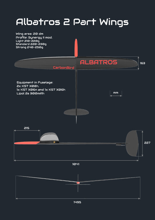 Witam Albators 2 Part Wings to całkowicie nowe wcielenie poprzednika! Przeprojektowaliśmy każdy element, w wyniku czego udało nam się uzyskać: - Pojemny kadłub z super cienką rurką ogonową - Skrzydło o mniejszej cięciwie - Ekstremalne stateczniki o małej powierzchni a dużej skuteczności. Po wykonaniu programu prób w locie mogę powiedzieć, że model dostał sporo możliwości, zarówno jeśli chodzi o penetrację powietrza, jak i precyzję w locie. Zmiany w dziedzinie aerodynamiki dają dużo pewności w sterowaniu i przewidywalności w locie. Dodatkowo poprawiliśmy użytkowy zakres prędkości, co pozwala na lepsze zbadanie terenu. Konstrukcyjnie ułatwiliśmy sposób montowania wyposażenia modelu, tak, żeby każdy użytkownik zmieścił swoje wyposażenie i poradził sobie z mechaniką napędu lotek. Formularz do składania zamówień - KONFIGURATOR
