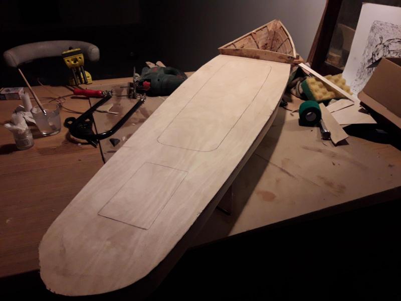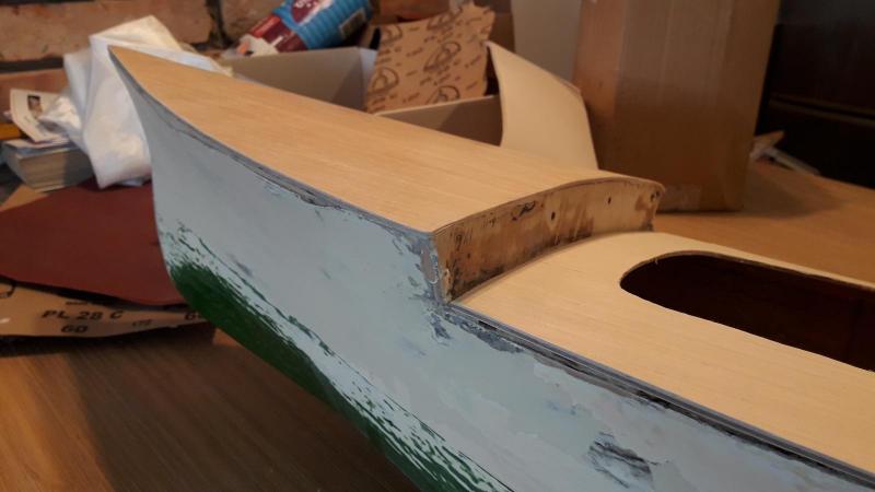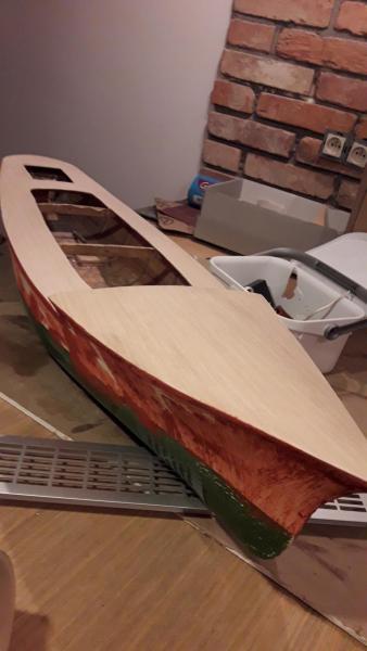 ...po krótkiej przerwie: Przepraszam Kaszalu i resztę że nie kontynuowałem z Wami dyskusji. Czekając na wyschnięcie kolejnej warstwy lakieru na fornirze i dawszy sklejce czas żeby nabrała kształtów,opowiem co robię. Po pierwsze postanowiłem przestać zaniedbywać łódź. Poza tym zrezygnowałem z bejcowania forniru bo po kilku próbach stwierdziłem że pomalowany bezbarwnym lakierem wygląda lepiej niż każda bejca którą mam ( i zgrywa się mniej więcej kolorem z górnym pokładem). Inne czasochłonne metody konserwacji też odrzuciłem. Ze względu na ten czas właśnie. Wyciąłem pokład dziobowy ze sklejki 1mm. Teraz moczy się w wannie żeby choć trochę wygięła się w drugą stronę. Inaczej będę musiał wubrzuszyć ją od spodu jakimś wspornikiem opartym na dnie dzioba. Lakieruję mniej więcej wycięty już fornir, szlifuję go, i maluję ponownie. Między warstwy lakieru myślę że wkradną się jakieś drobne ślady używania pokładu(rdza, plamka oleju lub inne). Pokład główny postanowiłem wyciąć jednak ze sklejki dwumilimetrowej, która po obróbce, stała się przyjemnie wiotka i według mnie dobrze się ułoży( czy łódź jest kobietą? ) Główny pokład czeka na fornir. Trochę zmarnowałem i nie wystarczyło. Idę zerknąć do stoczni. No właśnie...odkładam temat napędu ale w końcu i za to będę musiał się wziąć.. Zostawiam zdjęcia z ostatnich prac Zapomniałem dodać że nie byłem ostrożny w wycinaniu forniru do tego stopnia, że pierwszy kształt wyciąłem w poprzek słoi -