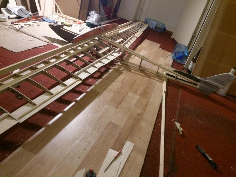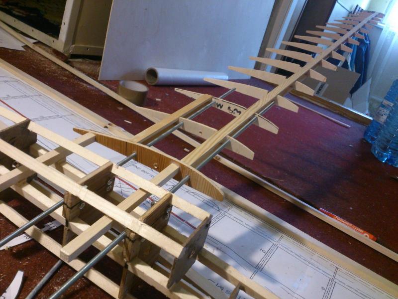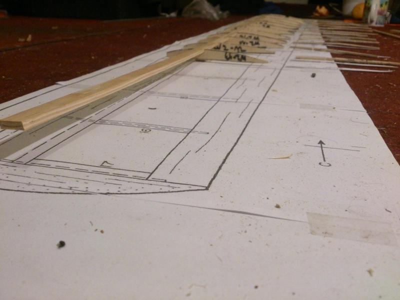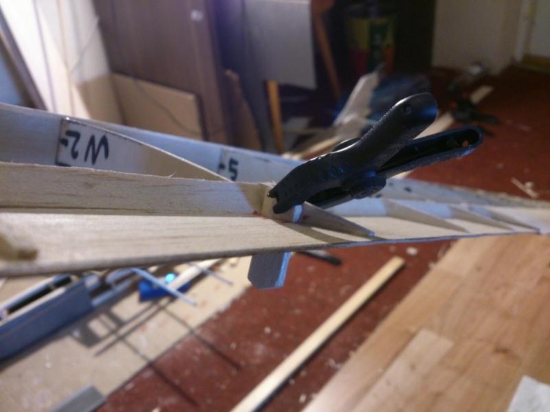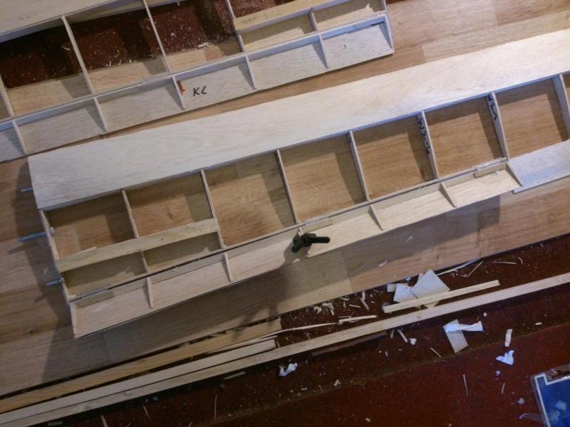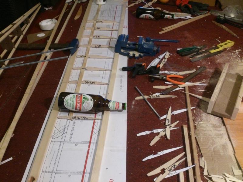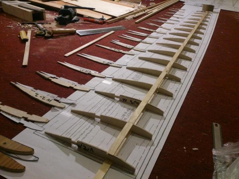 No to już się parę rzeczy nauczyłem , nie wiedziałem ze kierunek wycinania ma znaczenie. Szlifowałem na równo wszystkie żeberka przed montażem także nie powinno być źle. Składając skrzydło zaczynałem od dołu sklejać na równej podłodze także myślę ze tu tez nie powinno być większego problemu, skrzydło nie jest jeszcze dokończone bo mi się materiały skończyły. Co do serwa lotek to wydawało mi się ze nie będzie dużego problemu jak zamontuje jedno serwo centralnie a sterowanie na popychaczach i przekładni. Plany mam powiększone odpowiednio o 40% nie trzymam się ich w 100%, tak jak mówiłem chce sobie zrobić z tego model testowy, duża cześć materiałów jest z mojego garażu. No nie zamierzam przerywać prac na pewno i nawet planuje go skończyć jakoś tak za 2 tygodnie jeśli będę miał wszystkie materiały na skrzydla, miałem robić zupełnie inny model na początek ale ten mi się spodobał i stwierdziłem ze jak mam już coś budować to coś co mi się podoba. Może nie do końca przemyślany wybór, jak dla mnie to jest duuuzy fun ze z kilku kartek płaskiego planu powstaje coś co (może) będzie latać Idę robić ogon