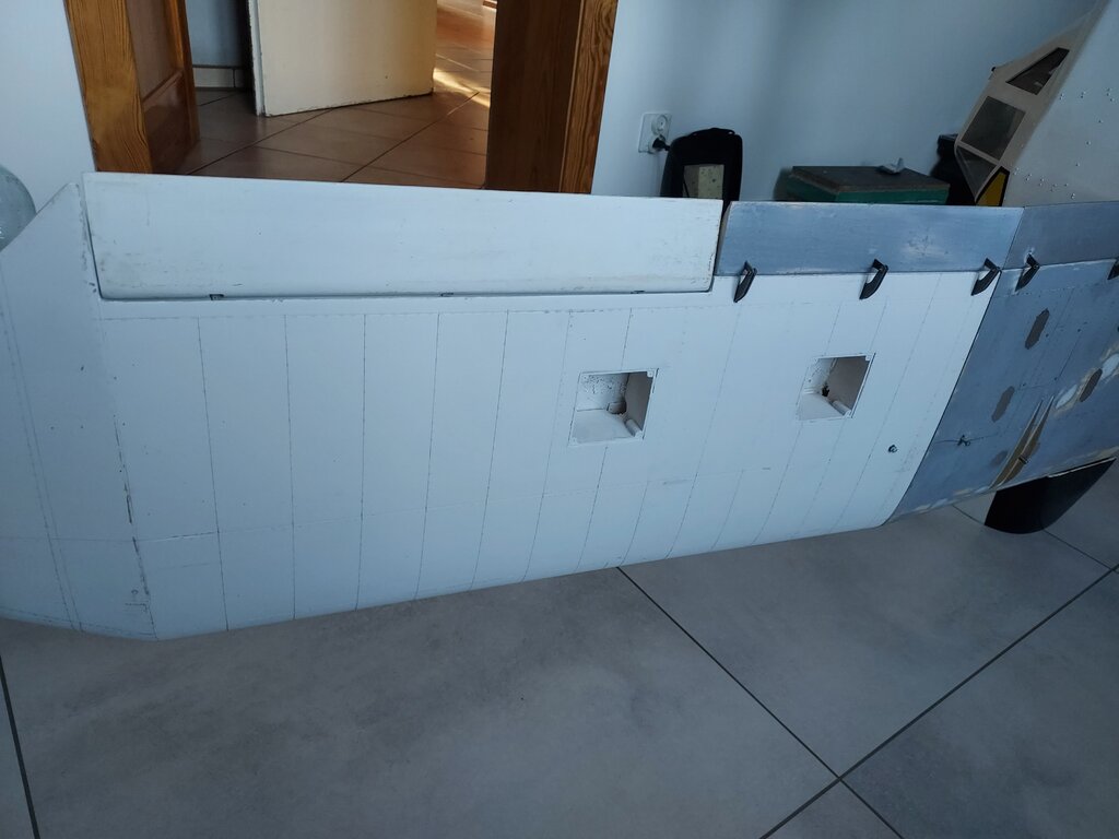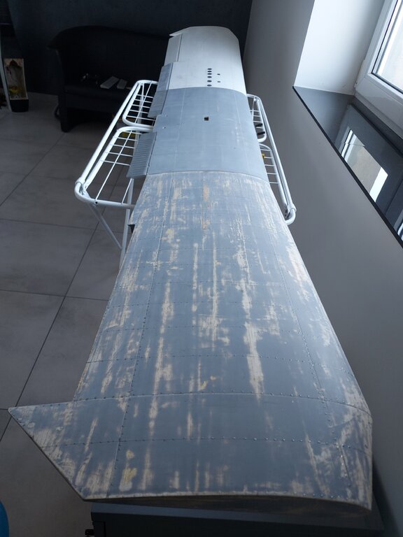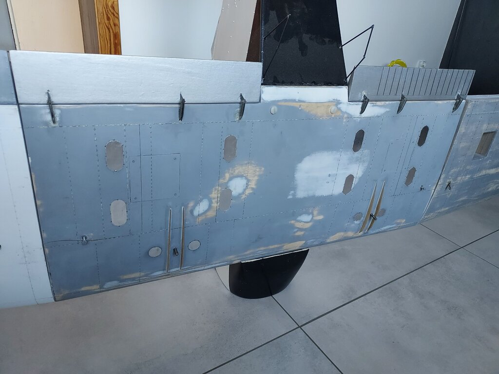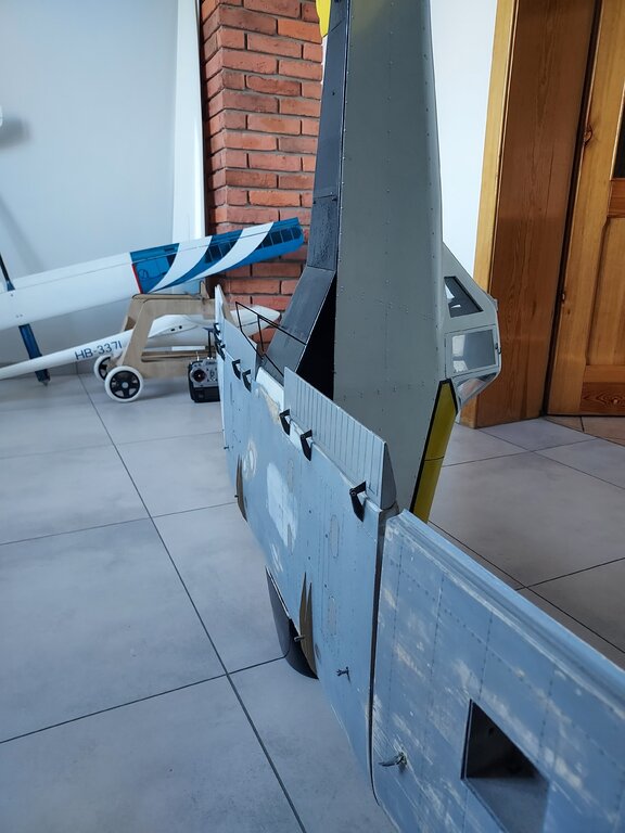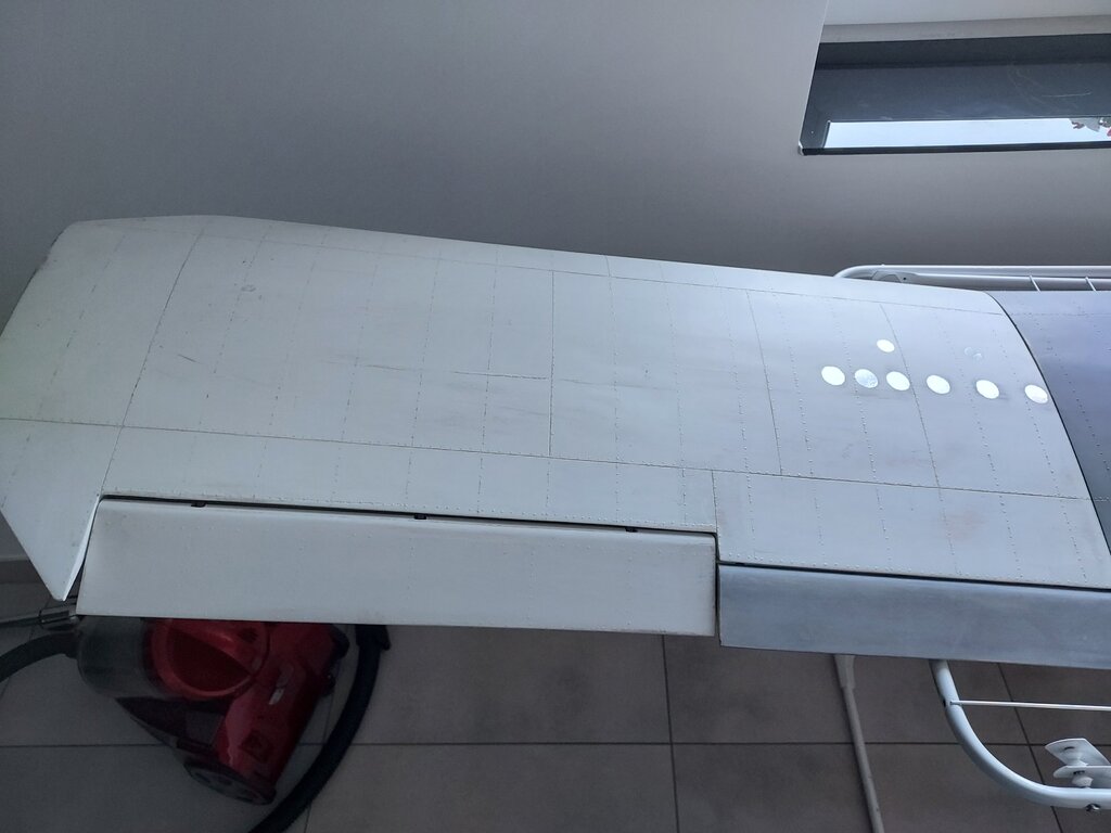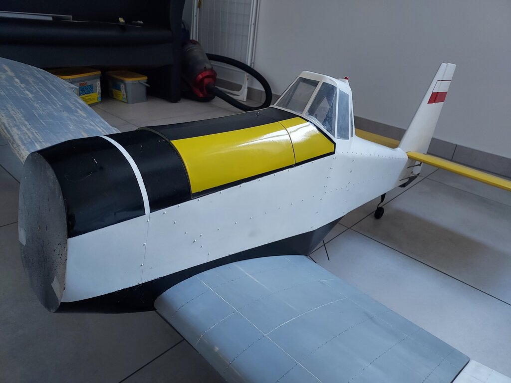 Kadłub jest pokryty balsa 2mm. Wszystko pokryte tkanina szklana 24gm2 i zywicą epoksydową. Szlifowanie i po szlifie wszystko malowane podkładem akrylowym z wypełniaczem. Znowu szlifowanie i dopiero końcowa baza kolorów, na to lakier akrylowy. Skrzydlo to rdzeń styropianowy kryty balsa. A proces ten sam co na klubie, tkanina, zywica, detale, no i pozostało resztę drobiazgów podopinac No i w końcu pomalować. A detale między innymi nity, to dobra i szybka metoda, strzykawaka z małą igła, do strzykawiki zywica epoksydowa w miarę gęsta no i punktowanie na całej powierzchni. Dosyć fajny efekt wychodzi.