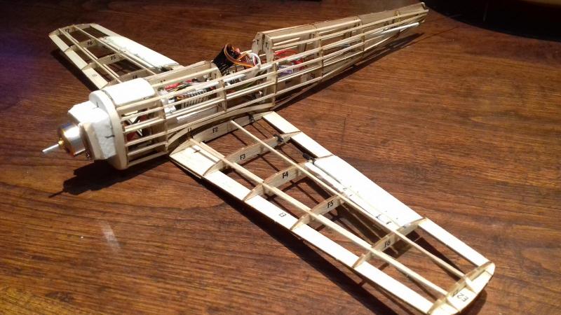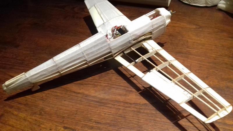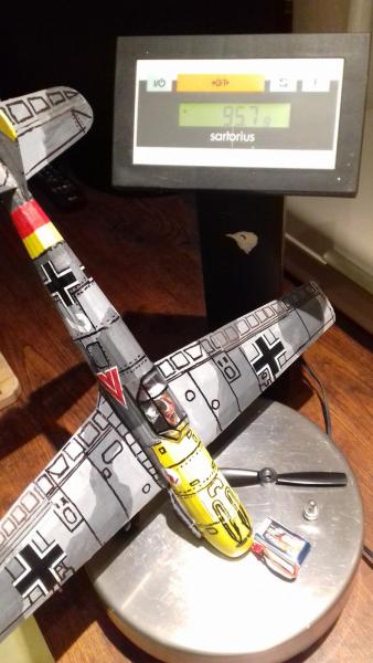 Dziękuję Wam wszystkim za uwagi i spostrzeżenia na temat mojego samolociku. Cieszę się , że Wam się podoba i jeżeli coś wnoszę do tego działu to naprawdę bardzo się cieszę. No a teraz odnośnie tego o co pytaliście. Nie, nie poleciały te samolociki czekam na fajna pogodę , a filmik z oblotu będzie w 100% niezależnie od efektu końcowego. Podział linii na samolocie nanosiłem /rysowałem/ mazakiem do płyt CD. Co do wagi modeliku ,to jest ona taka ,jak podałem /dokładniejszej wagi już nie znalazłem/ z czego jestem niesłychanie dumny. Dowód na zdjęciu. Wyposażenie może mieć dużo do życzenia można znacznie lżejsze zastosować. Silniczek kupiłem w fajnym sklepie "Gammodel" , a jest to silniczek A1504 /mają go na stanie/.Regulator -Turnigy Plush 6A. Dwa serwa . Jedno do lotek turnigy TGY 1440A, ono jest mocniejsze niż serwo steru wysokości /zdjęcie/ Niestety nie dysponuję małym odbiornikiem więc musiałem mocno odchudzić posiadany FS-IA6.Wiem doskonale ,że można lżej. Można użyć innej balsy, popychaczy z węgli itd.... tak będzie w przyszłości. Co do zastąpienia nitrocellonu saugal-em 64a / ważny ten numer , bo zasycha-twardnieje po 4 minutach/ nie jestem w stanie Wam odpowiedzieć jednoznacznie. Myślę że ciężar właściwy lakieru jest większy niż rozpuszczony saudal. Nie sprawdziłem. Stosunek wody do kleju 2do 8 jest umowny, sprawdzony dla bibuły znajdującej się w zestawie. Nie sprawdzałem tego na papierze japońskim , bo go nie miałem. Ważne jest, aby ten bardziej "ekologiczny" lakier nanosić na małe powierzchnie bardzo miękkim pędzelkiem. Stosunkowo szybko to schnie i tu trzeba uważać , bo w wilgotnym pofalowanym papierze klej spływa w bruzdy i gdy już prawie przysycha tym samym miękkim pędzelkiem rozprowadzamy go równo po całym fragmencie poszycia. Jedno jest z tego fajne , że nie trzeba przypinać modelu do deski , bo tak robiony samolot nie wichruje się. Jeszcze malowanie ,tu już mogę podać dokładnie różnicę wagi przed i po. Malowałem pigmentami wodnych lakierów samochodowych. Wodne lakiery mają to do siebie , że po wyschnięciu tracą bardzo dużo na wadze . Cały samolot pomalowałem 3 gramami pigmentów. Niestety to bardzo drogi interes . Te pigmenty są bardzo drogie i nie wiem czy gdybym nie miał dostępu do lakierni samochodowej pomalowałbym mój model. Przepraszam ,że się rozpisałem , ale mini modele są bardzo pasjonującą dziedziną modelarstwa. Pozostaje w tym dziale na bardzo długo.