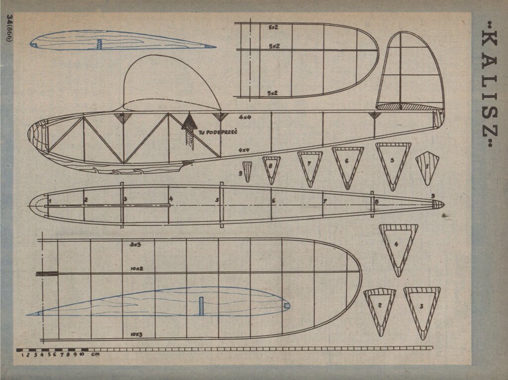 Przeglądając stare numery czasopisma "Skrzydła i Motor" natknąłem się się na plany szybowca "Kalisz". Od razu bardzo mi przypadł do gustu, mocna, zwarta konstrukcja, troszeczkę przypominająca przedwojenne szybowce, decyzja mogła być tylko jedna, buduję. Od samego początku plan był na wersję z napędem. Po rekonstrukcji planów postanowiłem powiększyć model o 50 %, oryginał miał 1 m rozpiętości. Nie wdając się w szczegóły rekonstrukcji, można prześledzić ją na forum ADW, finalnie model ma 150 cm rozpiętości i został przerysowany jako zestaw pod ploter laserowy. Wprowadziłem kilka zmian w stosunku do modelu oryginalnego: mniejsze rozstawy żeber skrzydła i statecznika poziomego, płat dwudzielny który jest montowany na łączniku do wieżyczki na grzbiecie kadłuba, wzmocnienie kadłuba dodatkowymi rozpórkami. Oczywiście wydzieliłem powierzchnie sterowe /ster kierunku i wysokości/, zaplanowałem montaż napędu - silnik elektryczny wielkości 28xx. Na potrzeby szybowca za pomocą programu TracFoil po wprowadzeniu danych wygenerowałem profil ClarkY 12 % do skrzydeł i ClarkY 10 % do statecznika poziomego. Moim zdaniem i według moich pomiarów takie profile były w oryginale. Chciałbym nadmienić, że w ten sposób wyrysowane profile w dość zdecydowany sposób różnią się się od ogólnie dostępnego w sieci profilu ClarkY 11,7% sm. W modelu po raz pierwszy zastosowałem do pokrycia materiał o nazwie Vlies. Jedną warstwę na skrzydłach w hybrydzie z folią Kavana i statecznikach, oraz dwie warstwy położone diagonalnie na kadłubie. Powstały dwie wersje modelu. Pierwsza ze standardowych materiałów /kadłub/, czyli sklejka Panama 3 mm, sosna i balsa, druga, odchudzona, sklejka Ceiba 3 mm, mniejsze przekroje podłużnic i mniejszej średnicy łącznik, reszta to samo. W pierwszej wersji kadłub pokryty Koverallem. W drugiej wersji odchudziłem skrzydła: inne przekroje dźwigarów. Aktualnie model "lata" na silniku Kavan 2830 1100 kV, pakiet 3S 860 mAh, serwa typu "9g", śmigło składane 10x6 cali Foxy. Waga do lotu drugiej wersji to ok 780 g. Więcej informacji i moje zmagania z "Kaliszem" na w/w forum. Jeszcze jedno na koniec. Model jest wielkości "Wicherka 15", również go eksploatuję mocno. Jednak latanie jest o wiele bardziej efektywne i przyjemne. Wiem, wiem, wsadzam "kij w mrowisko". Wicher to Wicher, kultowy i ponadczasowy model, ale proszę mi uwierzyć. Wichrem na termice słabo polatacie, na górce również, a Kaliszem tak😀. Ekonomia lotu - pakiet 0,86 Ah 3S - prostota pilotażu i swoista"oldtimerowa" toporność na błędy w pilotażu naprawdę czynią model dającym mnóstwo radochy i zadowolenia podczas lotów. Model jest prosty w budowie, pozwala na przypomnienie sobie, lub nauczenie się typowej modelarskiej "stolarki", wszyscy wiemy że to ginąca umiejętność. Kilku modelarzy z mojej "wsi" latało nim, nie zawsze byli to doświadczeni modelarze , radzili sobie świetnie, a wyraz ich twarzy po locie jest dla mnie niezapomniany. Poniżej kilka zdjęć z budowy i gotowego modelu. Filmu jak na razie nie mam, brak operatora kamery, ale postaram się coś nakręcić w najbliższym czasie.