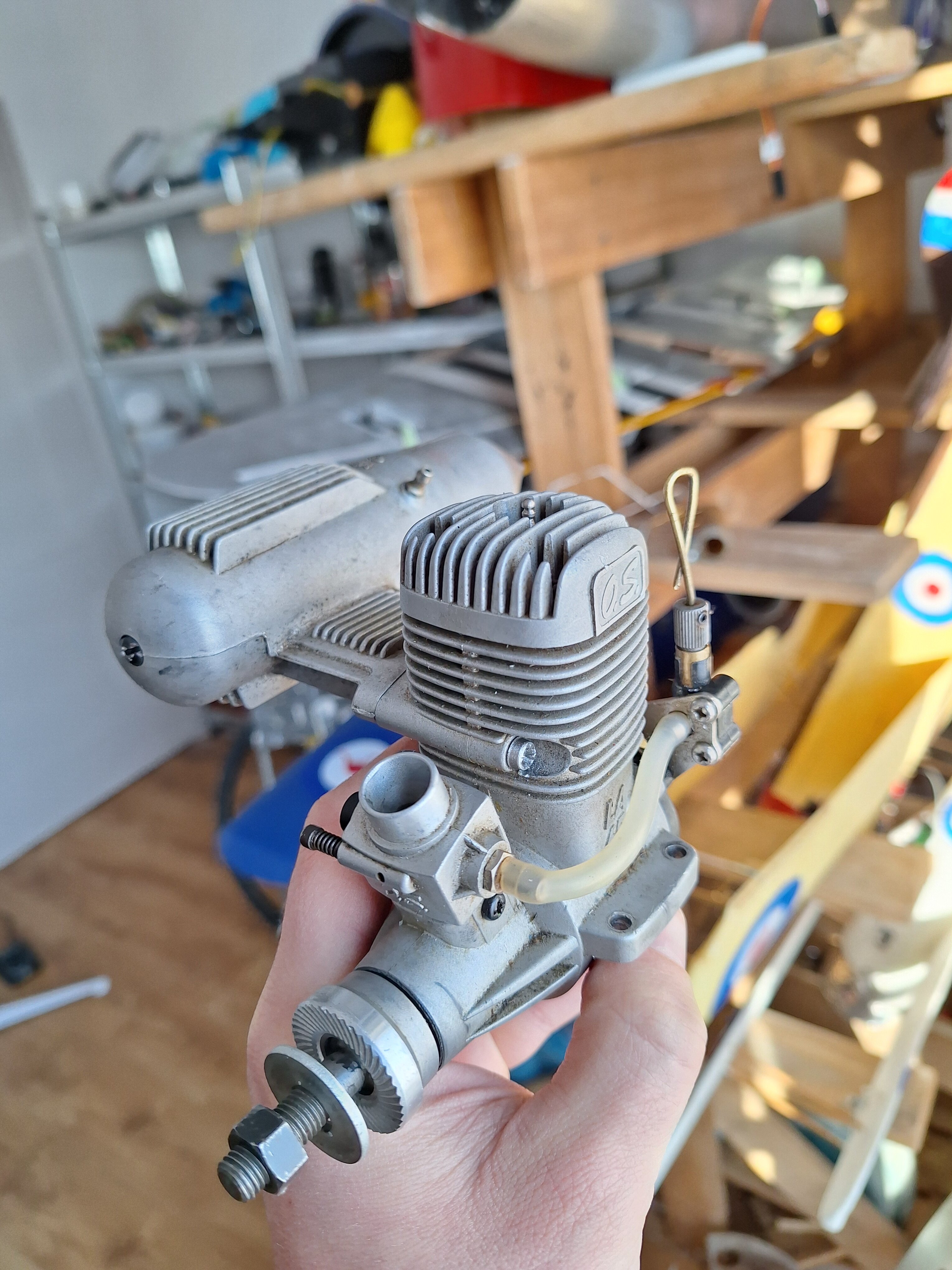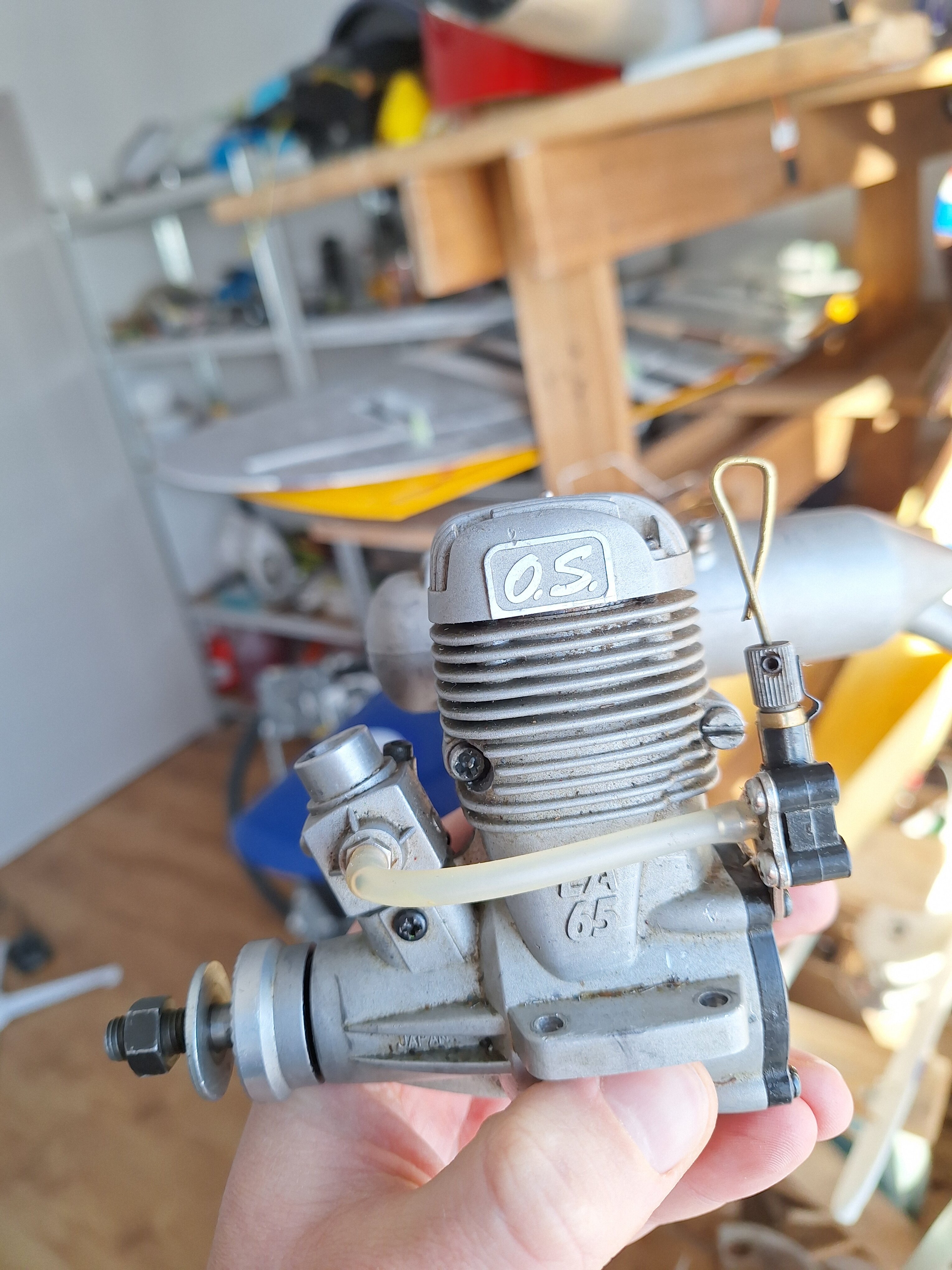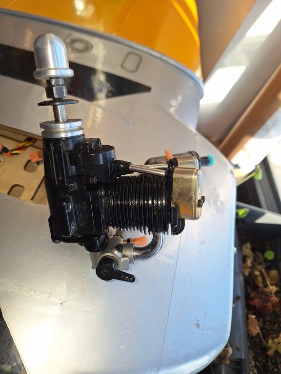 Dzieki Marcin, uświadomiłem sobie ze działa to jak przy ściąganiu paliwa z baku gdzie po zaciągnięciu paliwo jaz samo leci i ta moja pętelkę jest bezsensowna. Zamontowałem silnik na stanowisku testowym i ruszył normalnie choć po odjęciu zarżenia świecy dosyć mocno faluje obrotami wiec muszę jeszcze pokombinować, może nawet zamontuje podkładowy podgrzewacz świecy a to co widoczne na zdjęciu to akurat wyprowadzenie żarzenia świecy. Enya ma tak usytuowana świecę ze po założeniu zwykłej fajki jest ona koło 1 cm od smigła wiec po rozruchu silnika trzeba by bardzo uważać żeby ja zdjąć i nie dotknąć śmigła. Baku w modelu nie obniżę, nie ma takiej możliwości wiec pozostaje mi jedynie zamontować silnik bokiem akurat gaźnik będzie na wysokości górnej ścianki baku wiec będzie ok. Szkoda mi tylko ciąć maskę bo w pozycji odwróconej ładnie się enya chowała ale nic lepszego nie wymysle i tak musze zrobić.