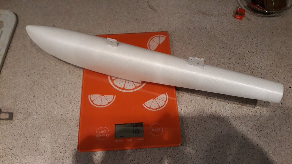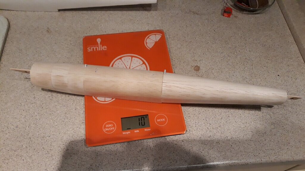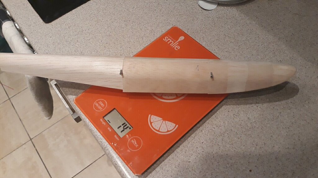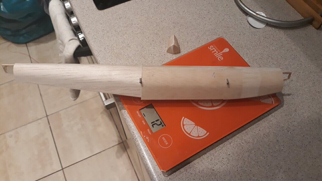 Dobry wieczór, Pierwszy pływak oklejony oprócz dna (jeszcze muszę przemyśleć połączenie z zastrzałami). Wyszedł dostatecznie prosto (chociaż gdzieniegdzie mogłoby być lepiej). Waga niestety już dwucyfrowa...:( na zdjęciu widać porównanie wagi pływaka z pianki z modelu Decathlona - ten z balsy po pokryciu i pomalowaniu na pewno wyjdzie cięższy niestety. Cdn. Pzdr, M