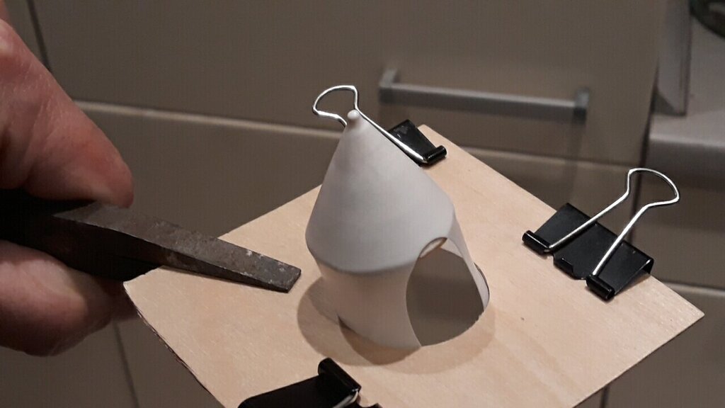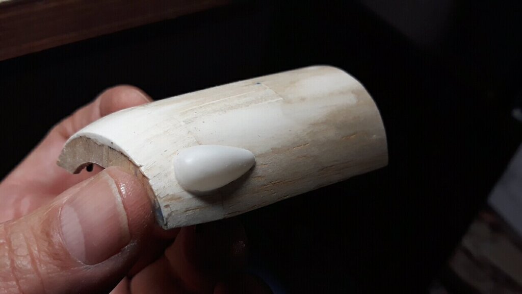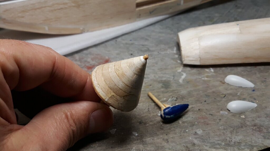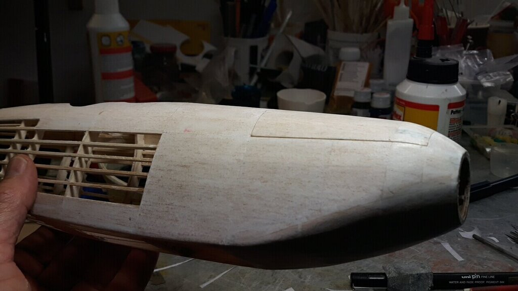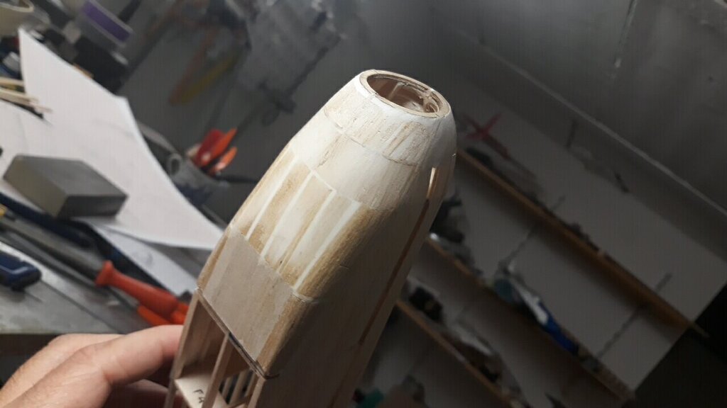 Dobry wieczór, Kadłub na balsowym pokryciu oklejony, wyszlifowany i pokryty podkładem; mam nadzieję że linie podziału blach będą widoczne; Zrobiłem też nowy kołpak - kurczę ten plastik to bajka - pierwsza próba i jest! Coś te pudla od sushi to zły pomysł byl:(cdn Pzdr, M