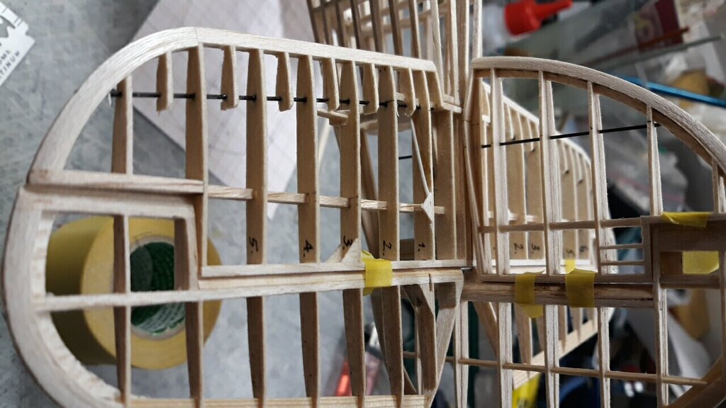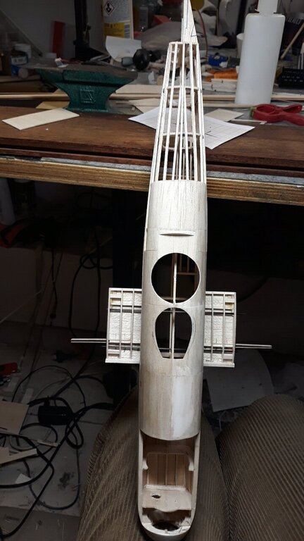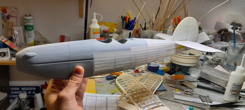 Dobry wieczór, Trochę było zabawy z przewlekaniem linek przez poszycie kadłuba ale w końcu się udało. Całość pocellonowana i prawie gotowa do malowania; no to teraz zabrałem się za oklejanie dolnych skrzydeł.cdn. Pozdrawiam, M