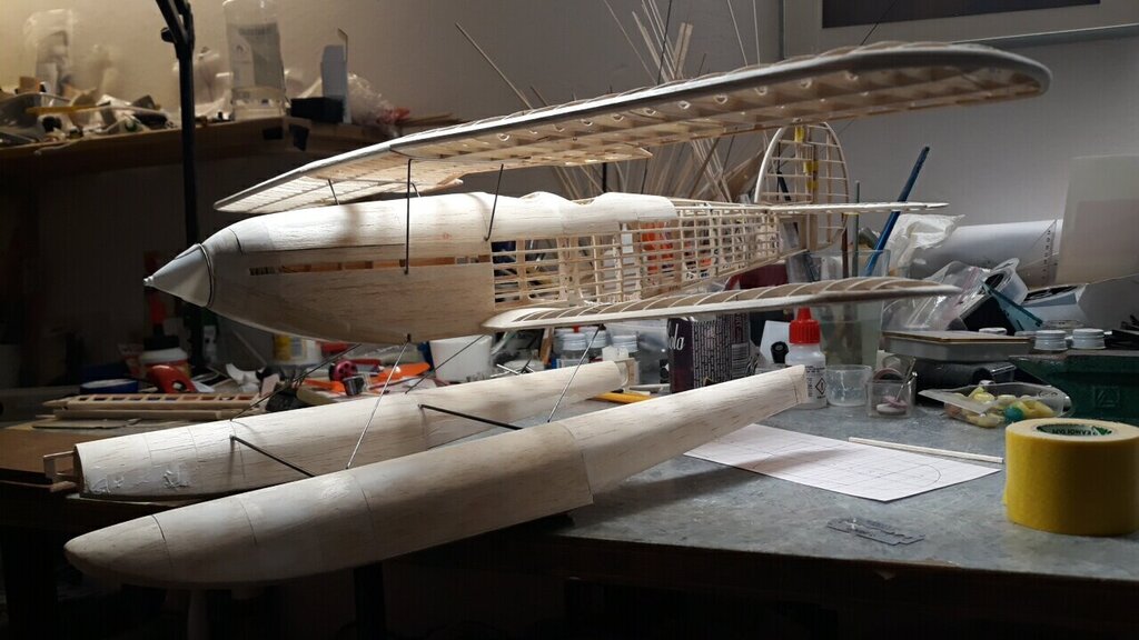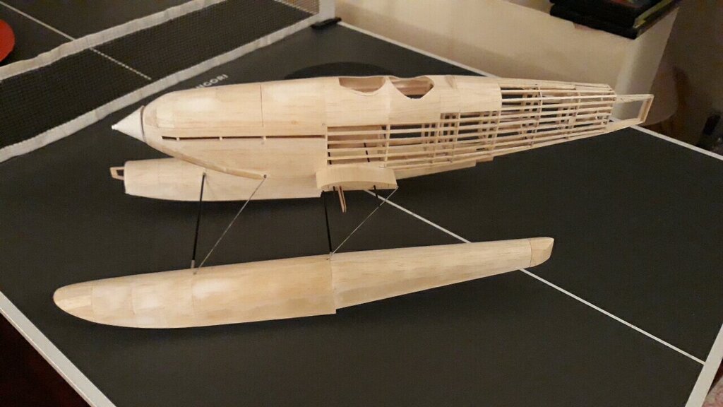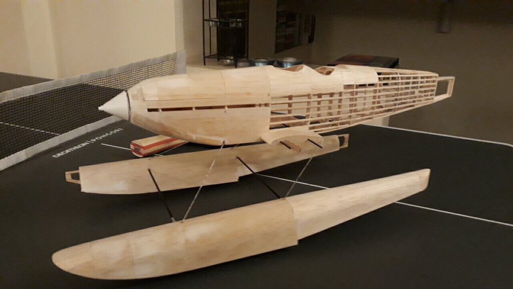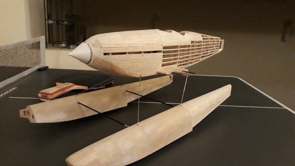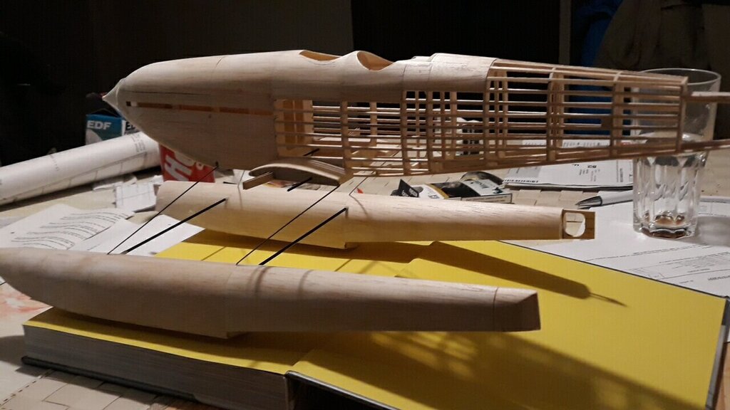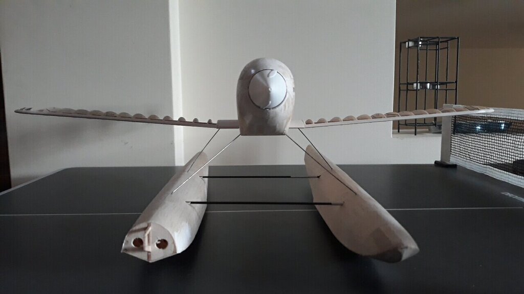Dobry wieczór, Po małych kombinacjach i patrzeniu w kryształową kulę (bo planów z pływakami porządnych nigdzie nie ma) udało się jakoś wyrysować zastrzały i postawić kadłub na pływaczkach. Na razie 50g, ale to sama balsa, hmm.. może jakoś się uda. No to teraz już skrzydełka pójdą.cdn Pzdr, M