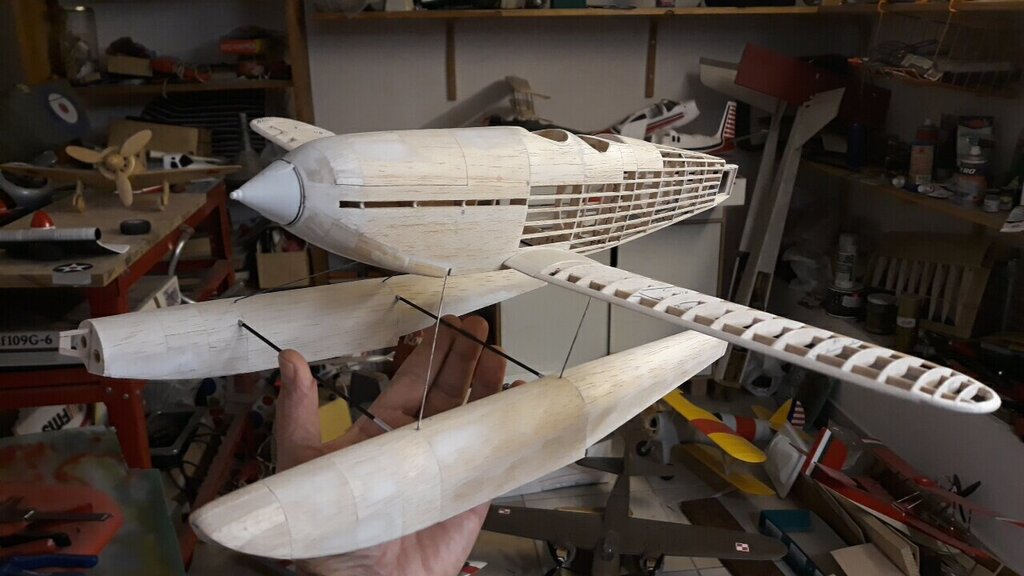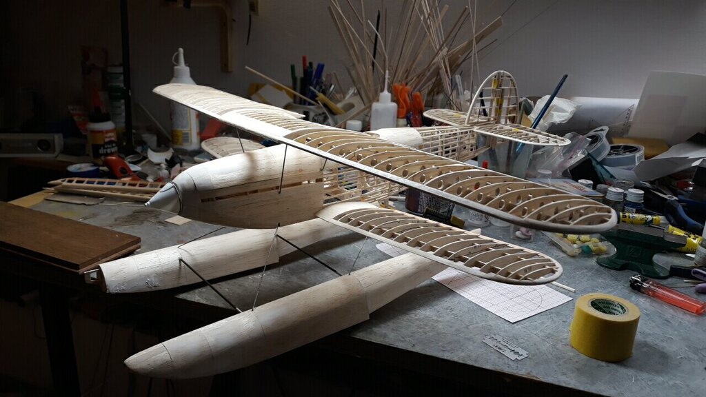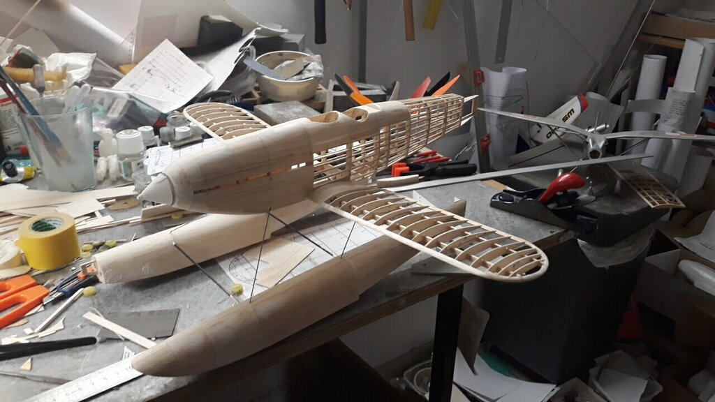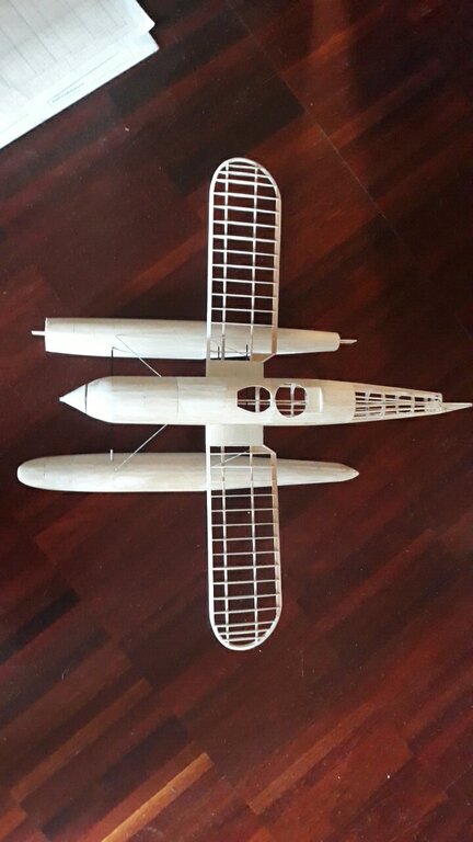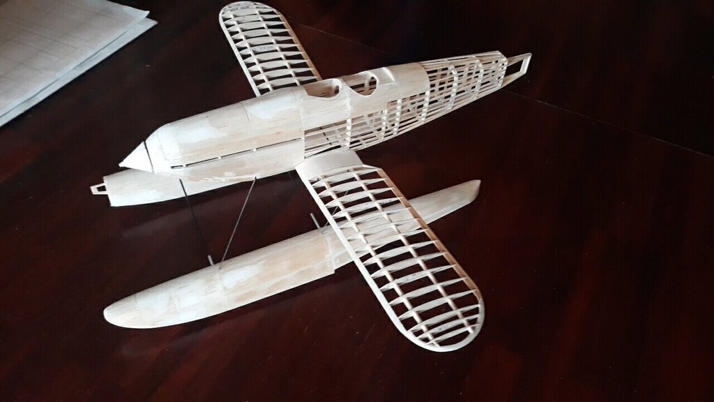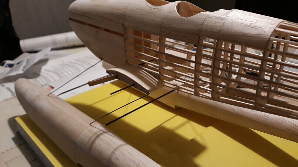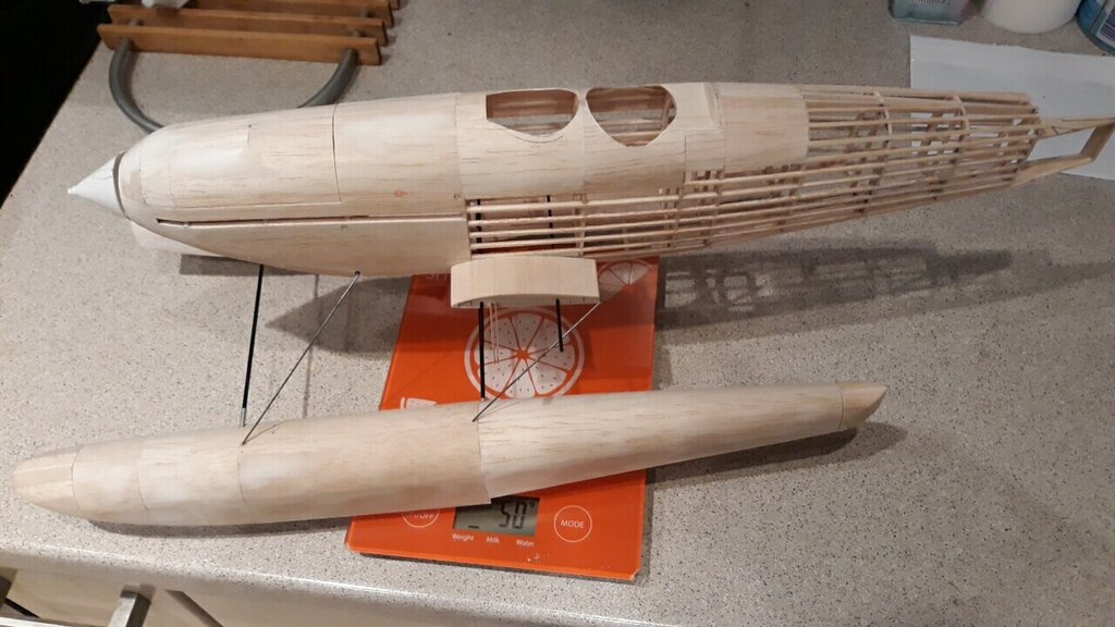 Dobry wieczór, Po małych kombinacjach i patrzeniu w kryształową kulę (bo planów z pływakami porządnych nigdzie nie ma) udało się jakoś wyrysować zastrzały i postawić kadłub na pływaczkach. Na razie 50g, ale to sama balsa, hmm.. może jakoś się uda. No to teraz już skrzydełka pójdą.cdn Pzdr, M