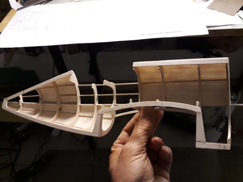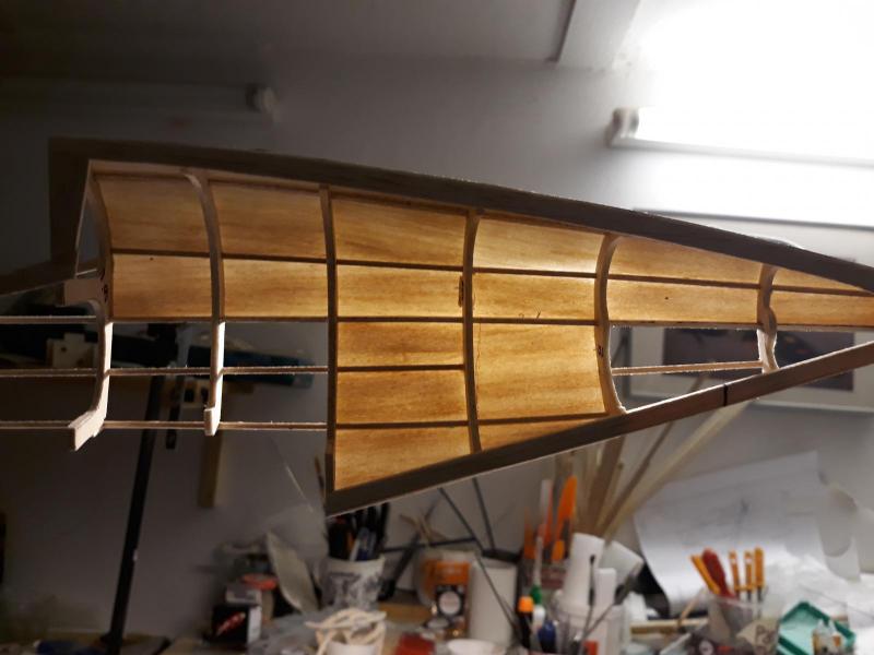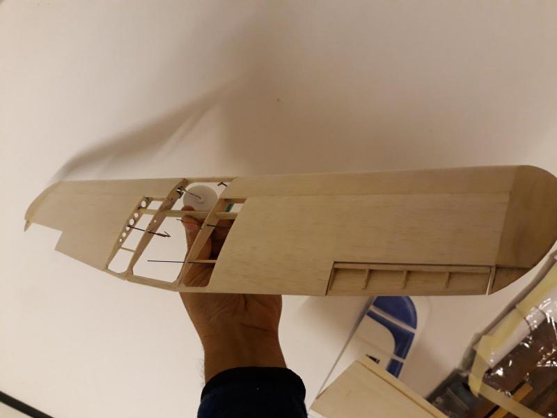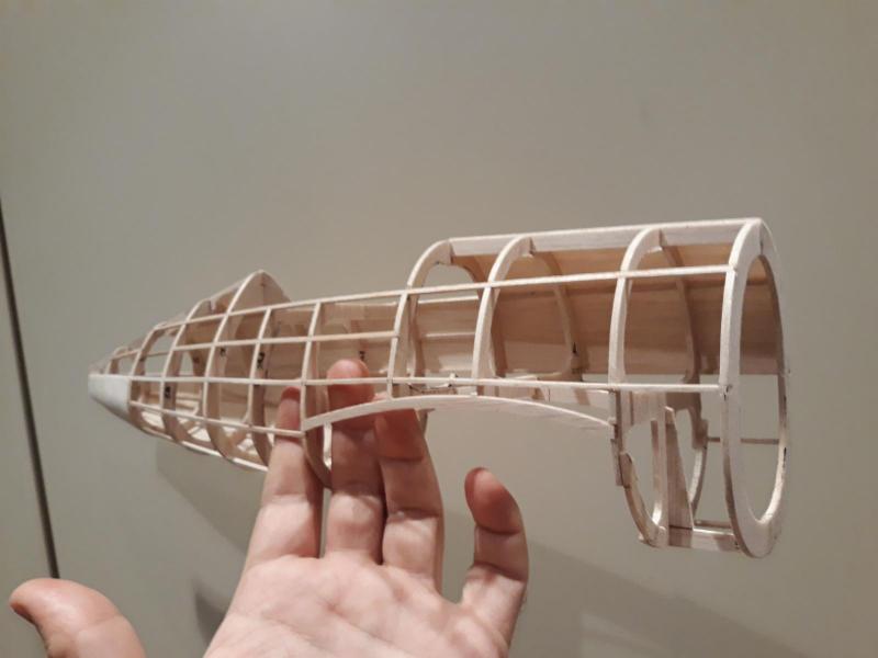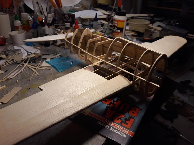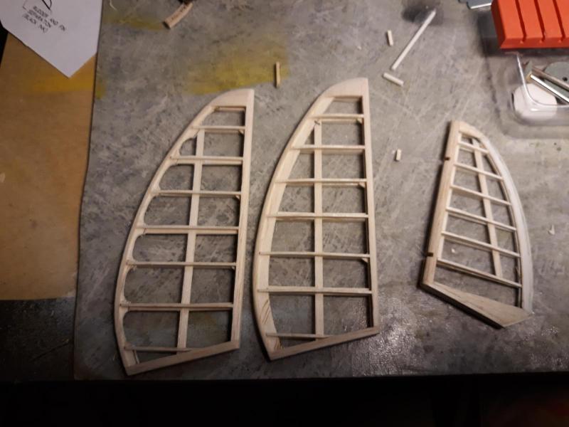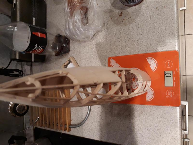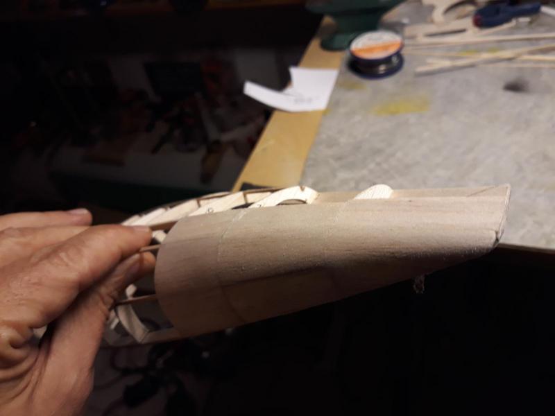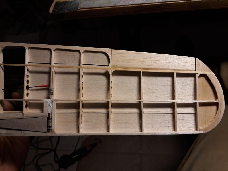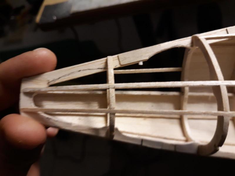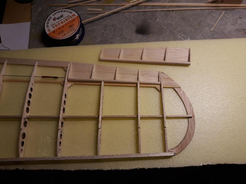 Dobry wieczór, Prac nad kadlubem ciąg dalszy. Duzo czasu poszło na poprawki malych niedoróbek powierzchni wręg i pasowanie podłużnic aby bylo porzadnie i symetrycznie. Postanowiłem też maksymalnie pocienić kil w ogonie. Zeby zapewnić jak najmniejszą wage zamontuję napęd linkowy obu sterów. Ponieważ dziób modeliku jest raczej krótki gros masy będzie max z przodu tj w i na domku silnika (2 serwa i bateria). Jeśli to bedzie za duzo, zrobię też "awaryjne" miejsce na baterię za silnikiem. Teraz muszę wykończyć "scianę ogniową", zaprojektować drogi dla linek sterów i będę mógł dokończyć poszycie kadłuba. Pozdr. M