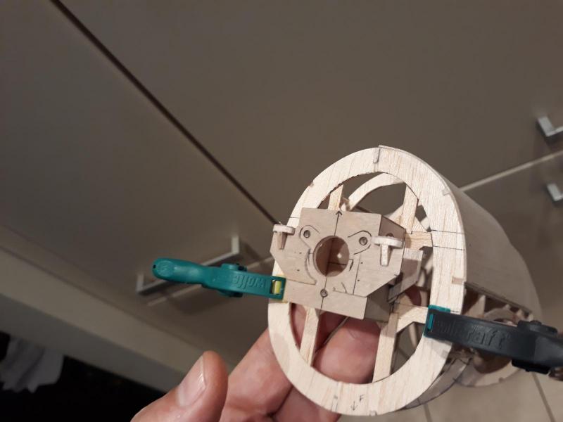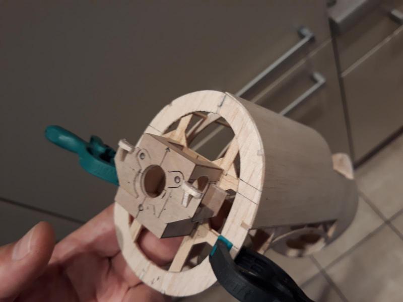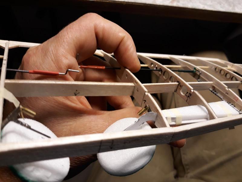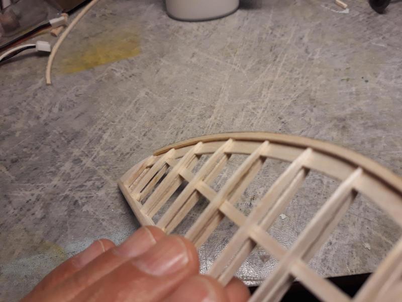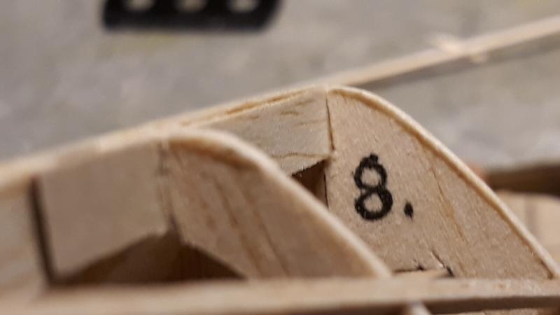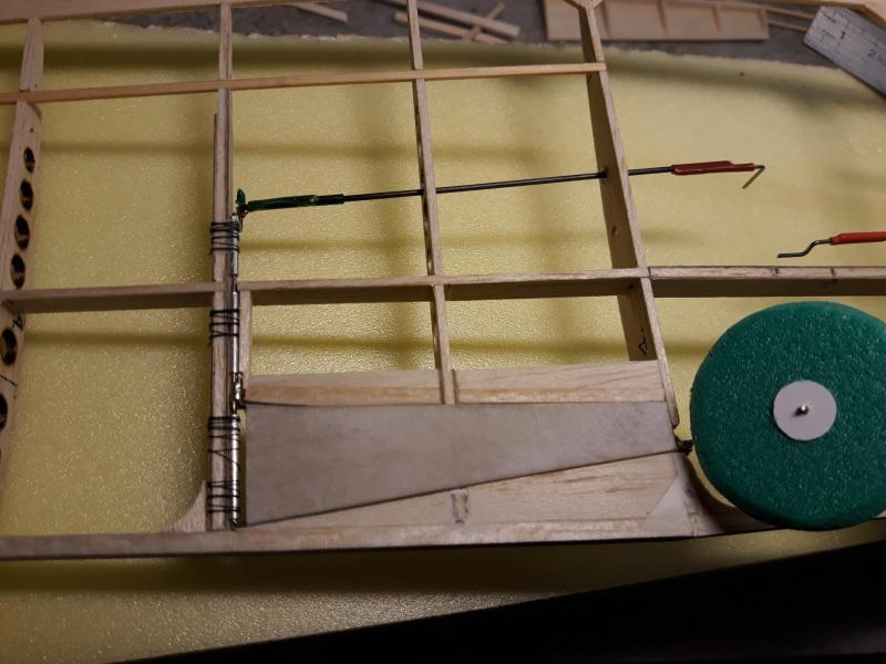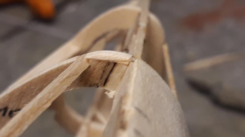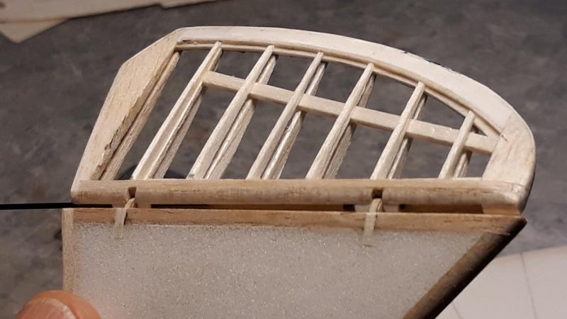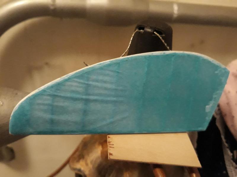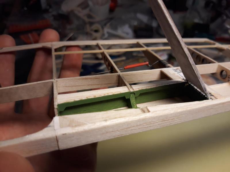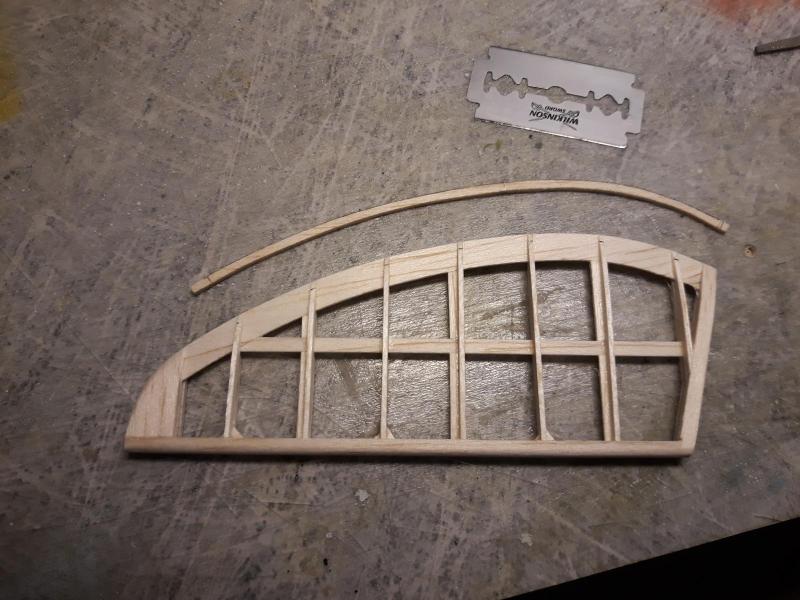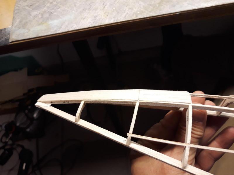 Dobry wieczór, Prac nad kadlubem ciąg dalszy. Duzo czasu poszło na poprawki malych niedoróbek powierzchni wręg i pasowanie podłużnic aby bylo porzadnie i symetrycznie. Postanowiłem też maksymalnie pocienić kil w ogonie. Zeby zapewnić jak najmniejszą wage zamontuję napęd linkowy obu sterów. Ponieważ dziób modeliku jest raczej krótki gros masy będzie max z przodu tj w i na domku silnika (2 serwa i bateria). Jeśli to bedzie za duzo, zrobię też "awaryjne" miejsce na baterię za silnikiem. Teraz muszę wykończyć "scianę ogniową", zaprojektować drogi dla linek sterów i będę mógł dokończyć poszycie kadłuba. Pozdr. M