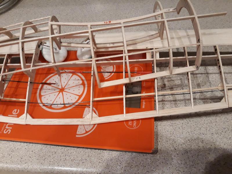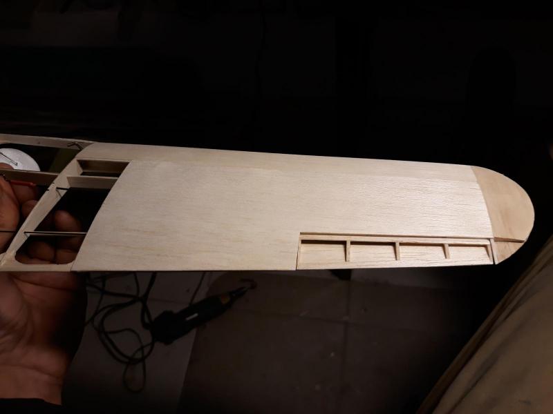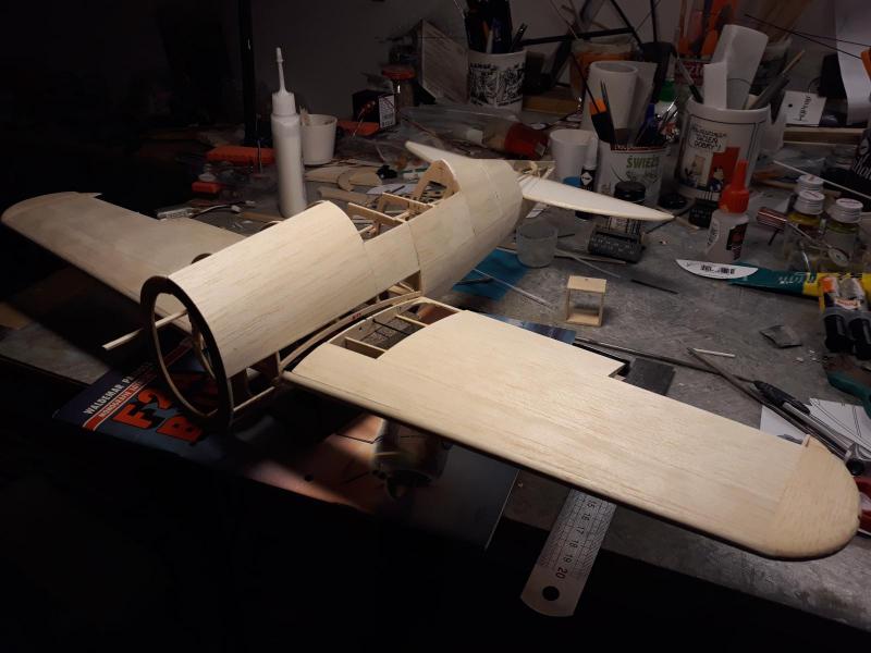 Dobry wieczór, Zrobiłem początek oklejania kadłuba balsą 0.6 mm. Nie wygląda jakoś specjalnie ale trudno, chyba jednak lepiej niż krycie papierem. Ten kształt cygara jest w tej skali trudny do osiągnięcia. Trochę kompromisowo podzieliłem pokrycie na sekcje i próbuję je nakladać tak aby "złapać" jak najwięcej krzywizn. Prawdziwe mikro klepki dałyby lepszy rezultat ale kleju by poszło mnóstwo i ciężar by na pewno mocno wzrósł. Teraz zabrałem się za lotki, bo muszę podgonić skrzydła zanim skończę kadłub bo taki ciąg technologiczny się zrobił. Cdn. Pozdr M
