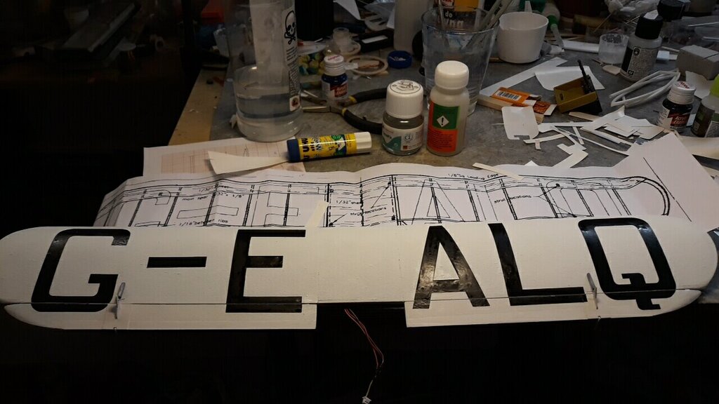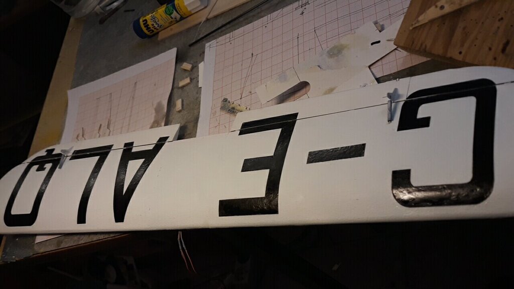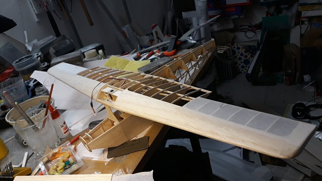 Dobry wieczór, To skrzydła już w całości, serwo lotek stestowane, wydaje się działać:) No to teraz, mam nadzieję, będę mógł pomierzyć czy płat "równo" leży i w końcu wkleić ten rurkowy wihajster i okleić kadłub. Lotki w oklejaniu. Wznios płata "oszukany" zmniejszoną grubością profilu i górna pow płata ma wznios 0st. Cdn. Pzdr, M