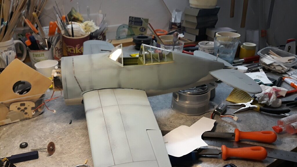 Dzień dobry, No to budowa już właściwie dobiegła końca. Miałem nadxieję że w tym tyg zdążę z szachownicami etc ale mój "dostawca" projektów kalkomanii niestety zaniemógł i będę musiał czekać:( Modelik ma całą elektrykę w środku, wszystko wydaje się grać i bateryjka też na miejscu. Trochę prób wyważania poczyniłem i też mam nadzieję że będzie ok - waga całości 185 g - zatem szansa że poleci raczej jest (dawca mial ok 160g wagi, ok 1/4 mniejsze skrzydla i olbrzymi nadmiar mocy). Jeszcze pewnie wrzucę zdjęcia po naklejeniu znaków i żubra na burcie i dozo przy oblocie. Pzdr, M