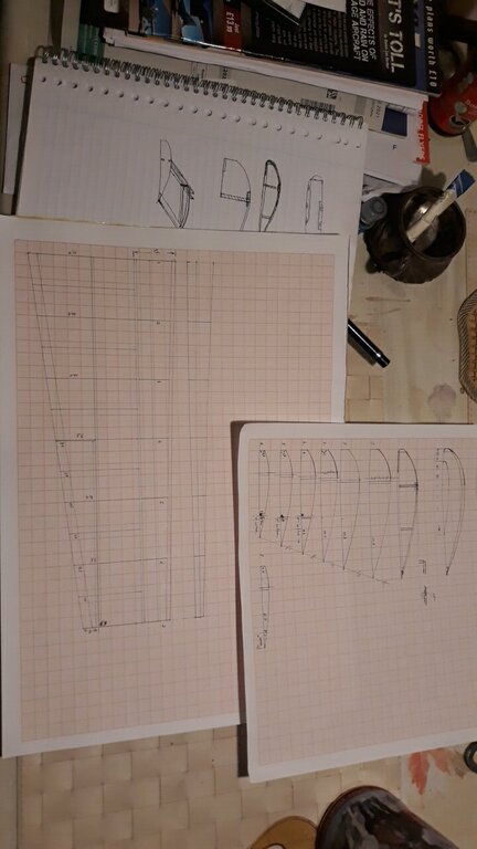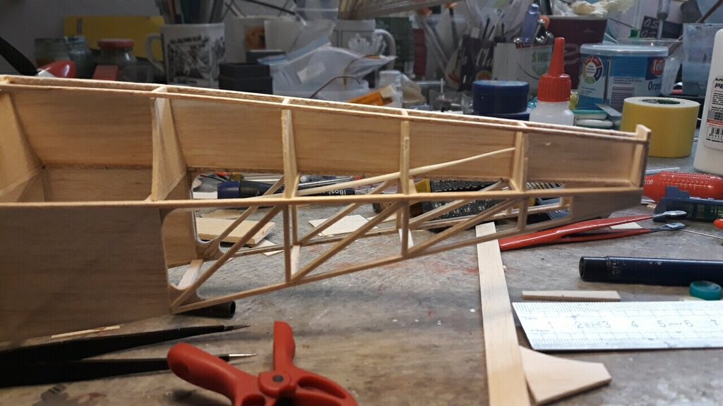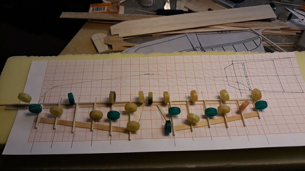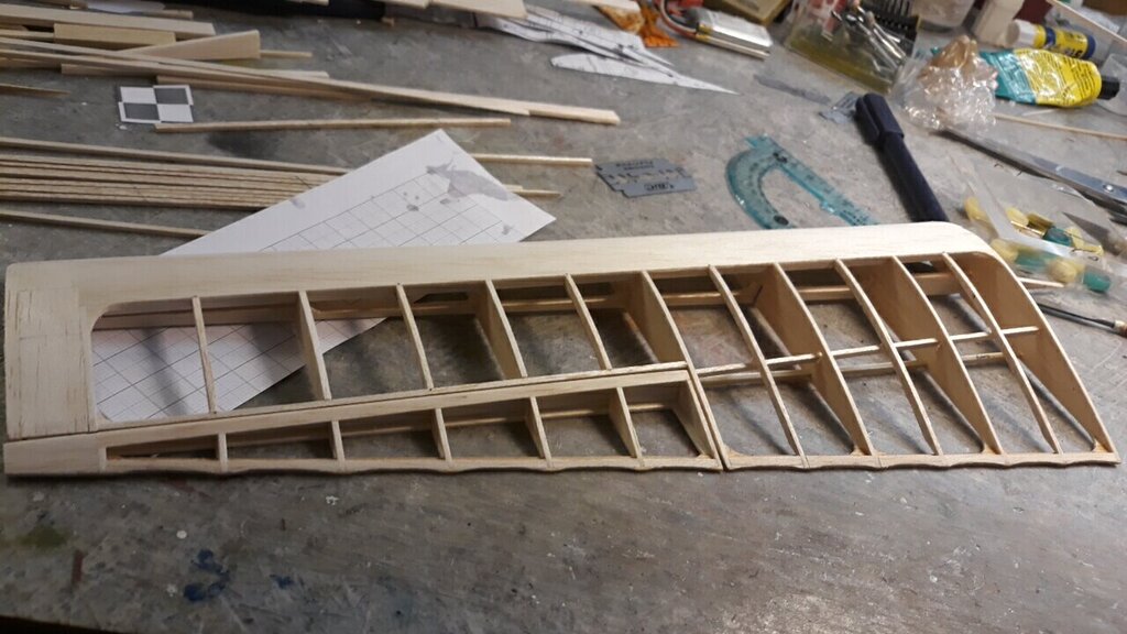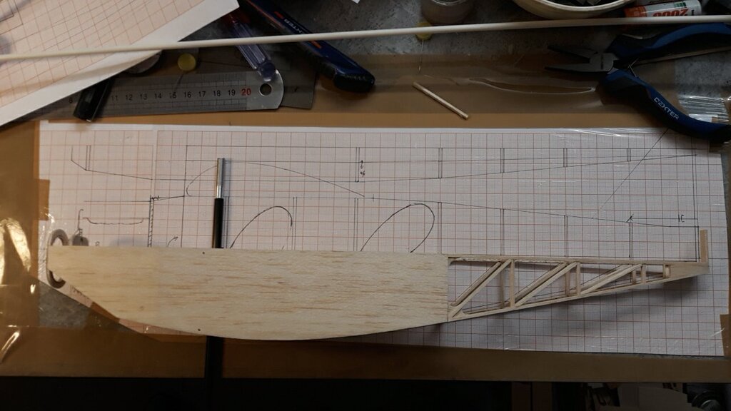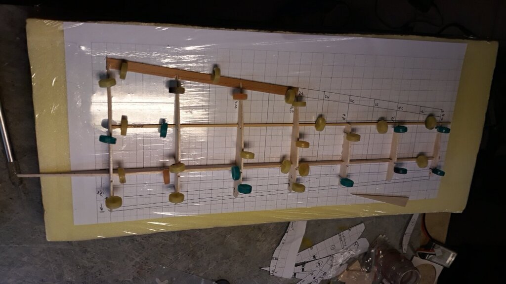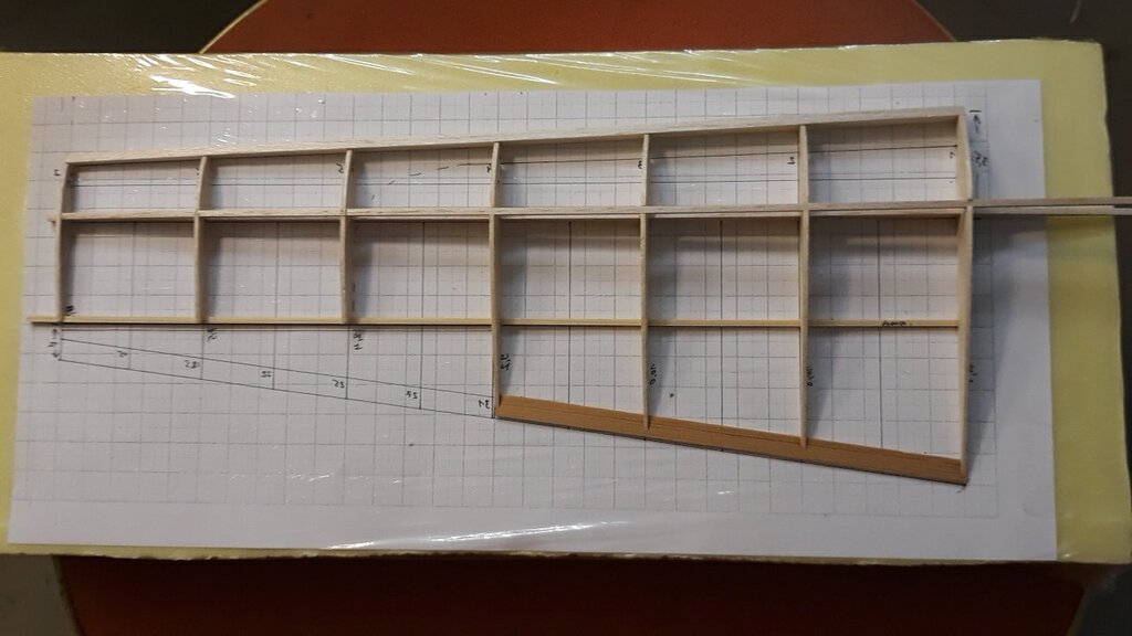 Dobry wieczór, Dalszy ciąg pracy nad skrzydełkami. Myślałem że będzie szybciej, ale trochę niestety czasu lotki mi zajęły i te półżeberka też trochę pracy będą wymagały. Na planie widać że trochę z żebrami i lotkami "oszukałem" -ale to w zbożnym celu... Mam nadzieję, że od weekendu uda się rozpocząć kadłub.