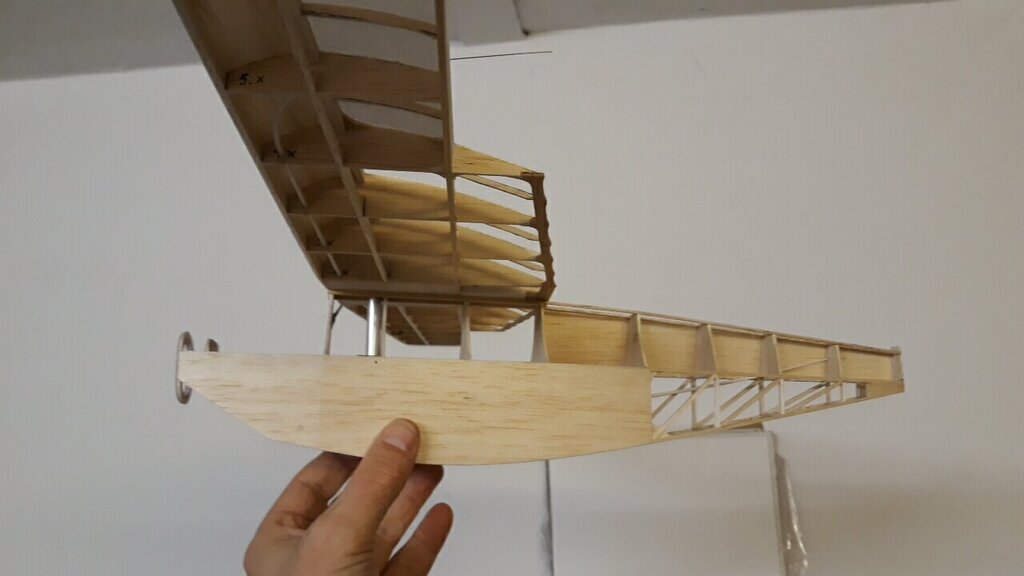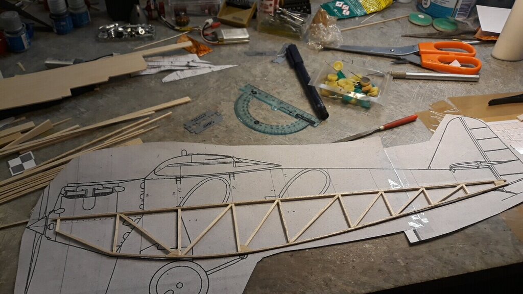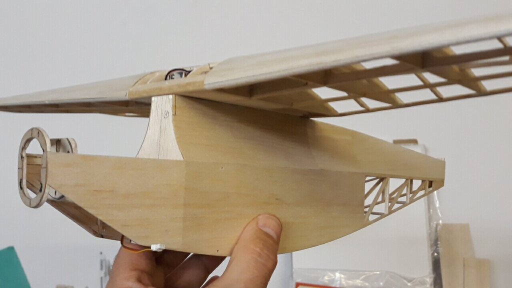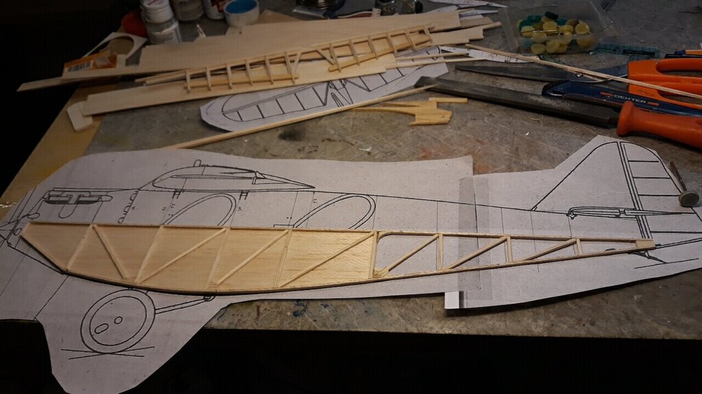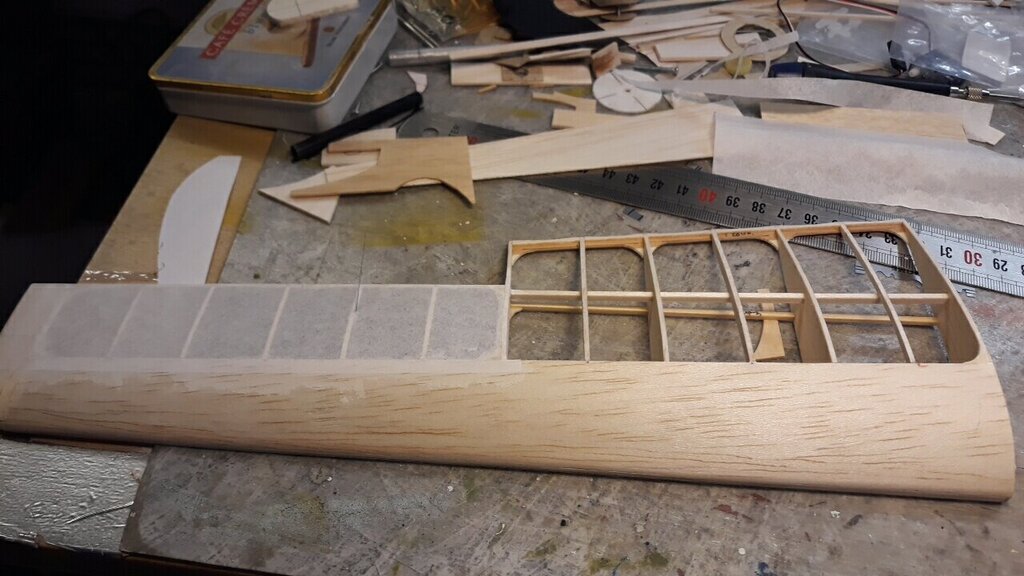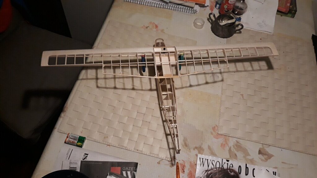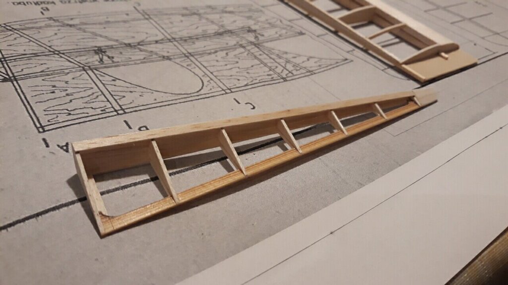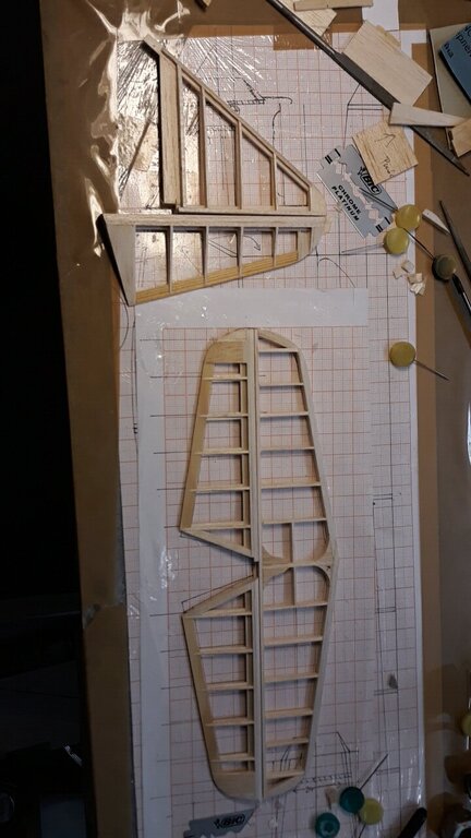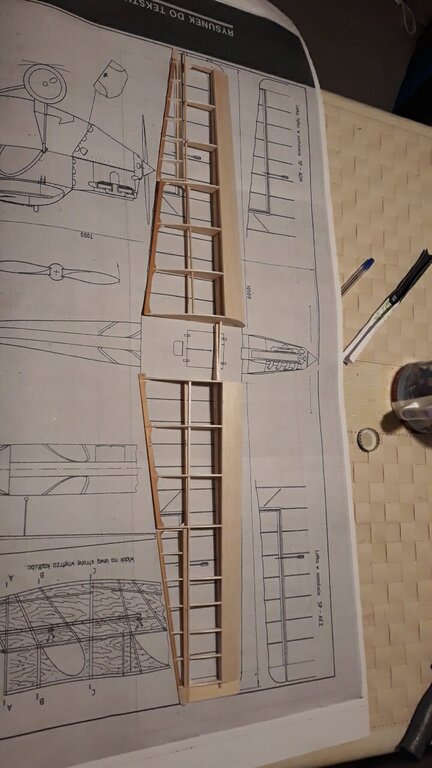 Dobry wieczór, Konstrukcja usterzenia prawie gotowa. Stat pion na planach wygląda jakby był kryty sklejką, ale na zdjęciach (niektórych) wygląda bardziej na płótno. Na zdj "mojego" sp-aek słabo widać ale założę że płótno, to pokryję go papierem. Cdn. Pzdr, M