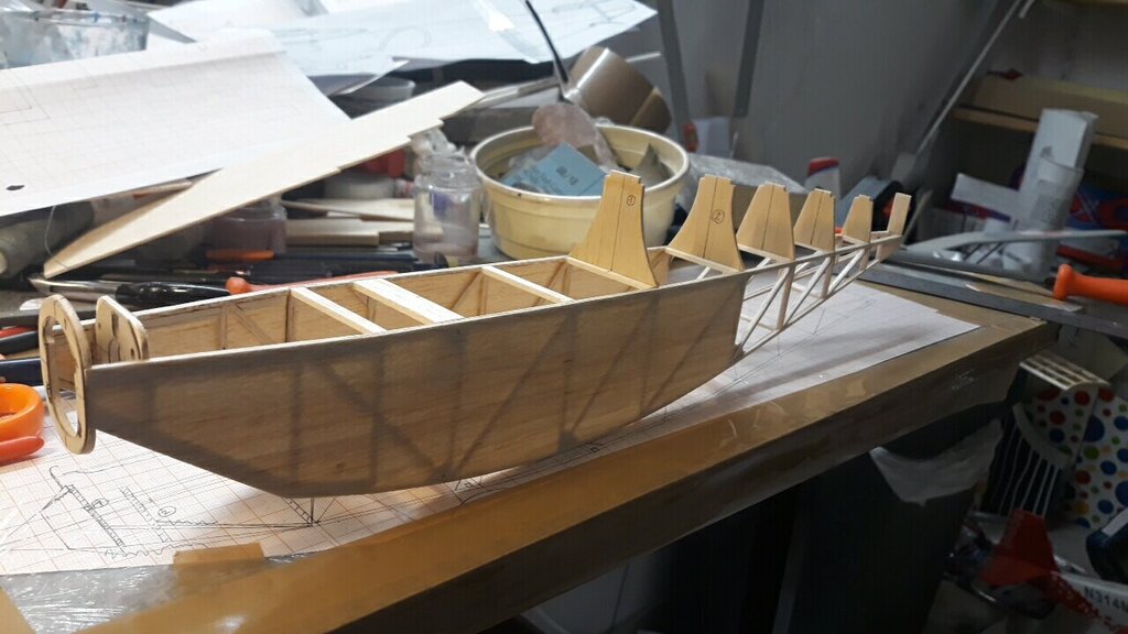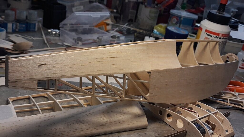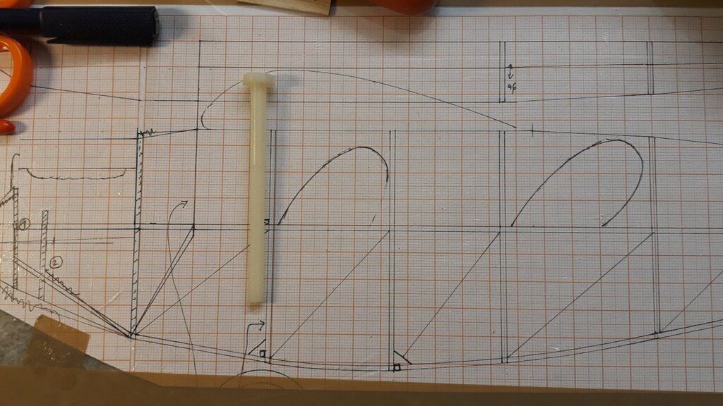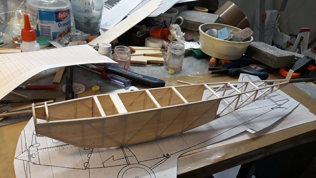 Dobry wieczór, Trochę wolno ale idę jakoś... Listwy spływu dostały "łezkowe" wcięcia i nakleiłem tam też cienkie odcinki balsy żeby papier jap możliwie równo i bez wgięć do listwy przylegał. W czwartek, po niejakich mękach, wyrysowałem kadłub i od wczoraj kleję kratownicę z listwek gr 1.5 mm; circa połowa kratownicy będzie oklejona jeszcze balsą 0.6mm. Mam nadzieję, że nie będzie za ciężko. Na razie postanowiłem że będę jednak montować mały silniczek 1504 (klasa park 180) - i pod niego narysowałem dziób. Jeśli z wagą będzie słabo to trochę przerobię na park 250. Cdn. Pzdr, M