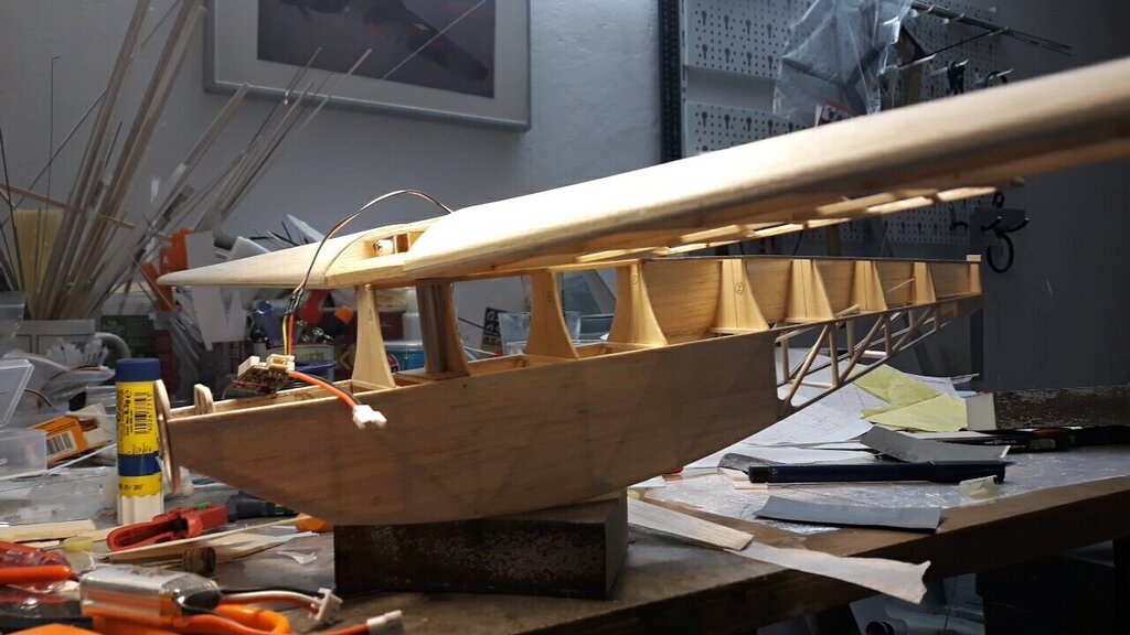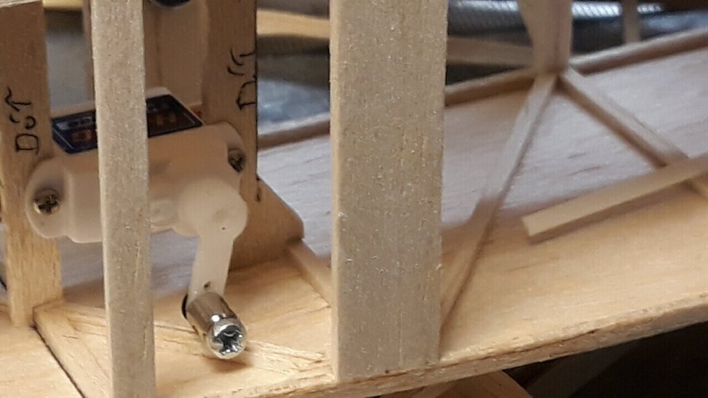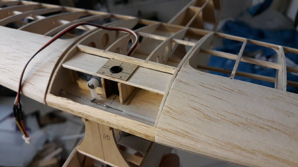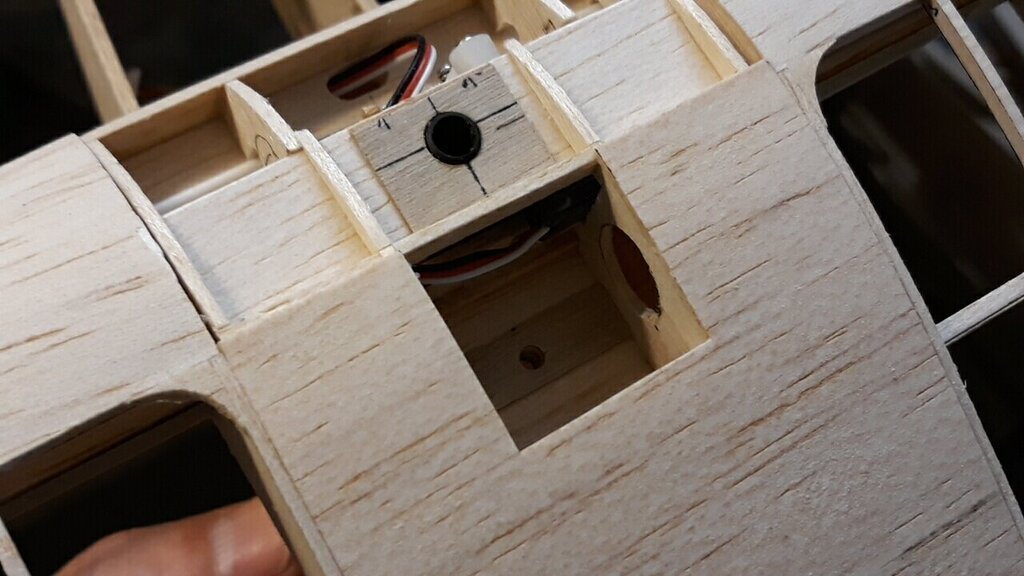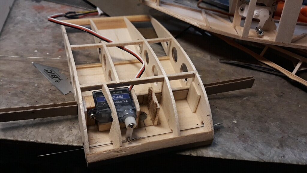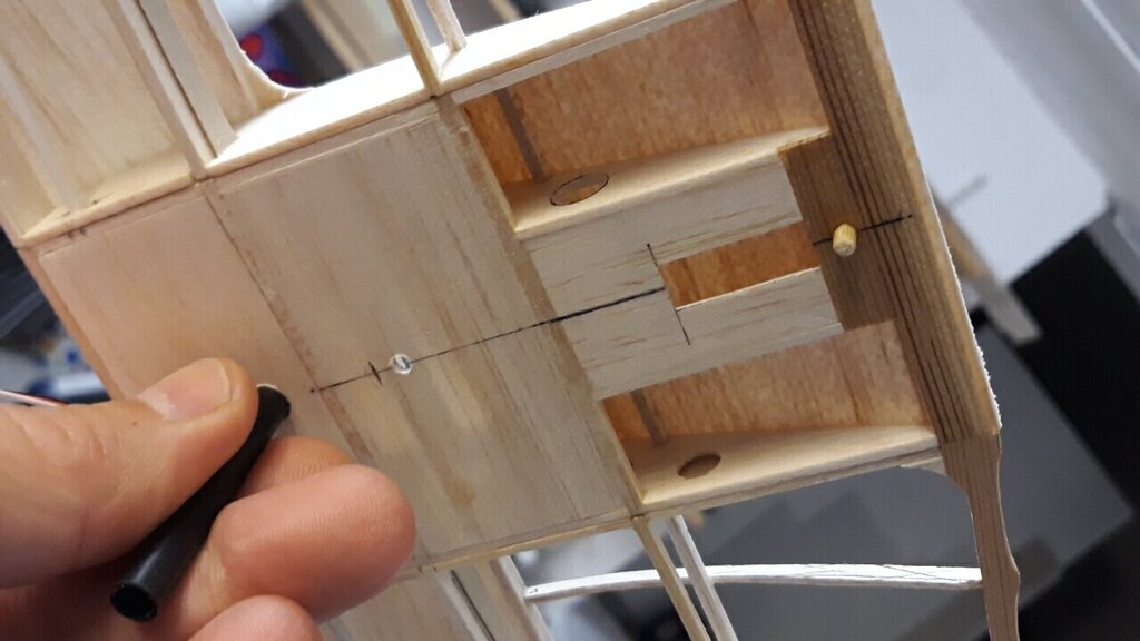Dobry wieczór, Małych prac ciąg dalszy. W centropłacie ledwo się udało zmieścić serwo. Drut popychacz lotek 0.3mm będzie w jednym kawałku a na środku będzie doń przylutowana pętelka przez którą srubka połączy je z ramieniem serwa - na zdj jest testowy kawałek; rozwiązanie ma ten minus, że trzeba miejsca wylotów bowdenów w płatach pokryć przed montażem bo inaczej nie da rady napiąć papieru jap. Mam nadzieję że w weekend połączę płaty to w końcu będę mógł podgonić prace przy kadłubie. Cdn.pzdr. M