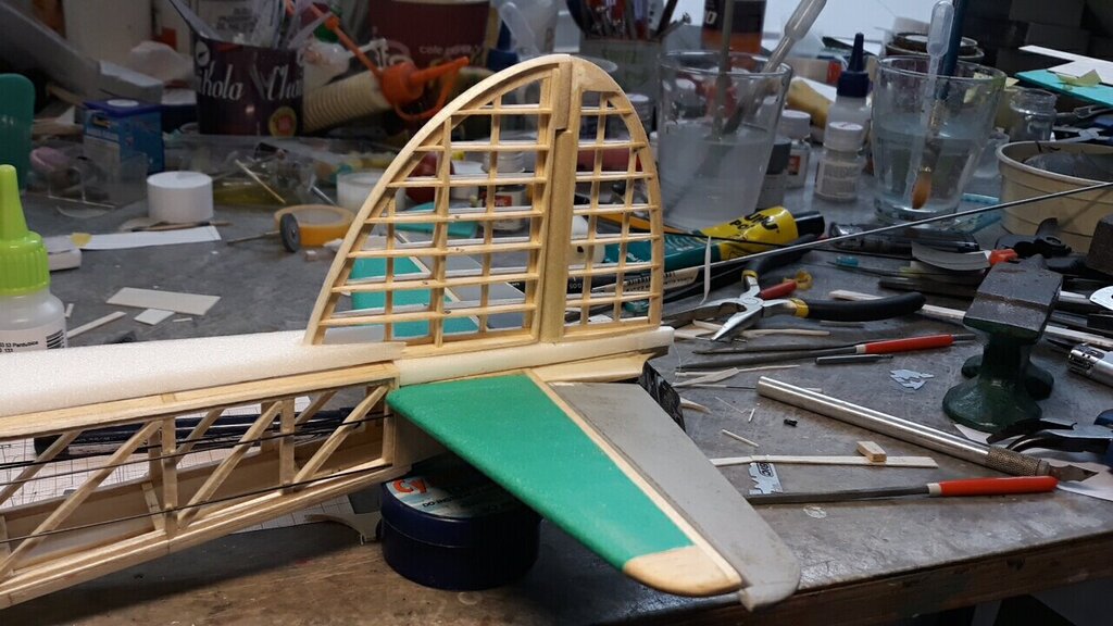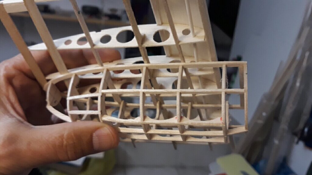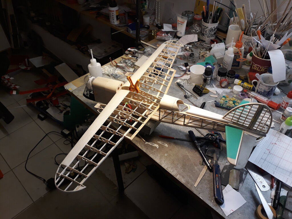 Dzień dobry, Okazało się, że nie mogę oklejać zanim nie zrobię wszystkich elementów końcówki kadłuba. A tutaj jest kurcze trochę słabo bo w jednym miejscu spotykają się orczyk SW, goleń kółka ogonowego i oś z orczykiem SK. Wyszło na to, że goleń kółka muszę poprowadzić poziomo bo na inne ustawienie nie ma miejsca. Ta końcówka już mnie dosyć umęczyła i zanim posprzątam cały bałagan po krojeniu tych wsxystkich drobiazgów postanowiłem całość urobku rzucic na wagę, no kurczę źle nie jest (na razie!) [dla precyzji, w kadłubie są 2 serwa!] :).cdn. pzdr, m