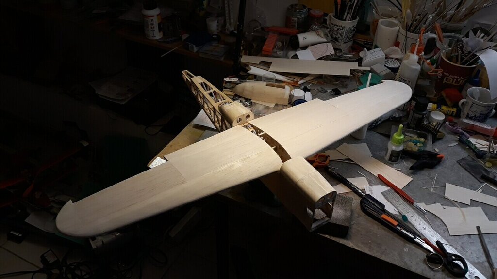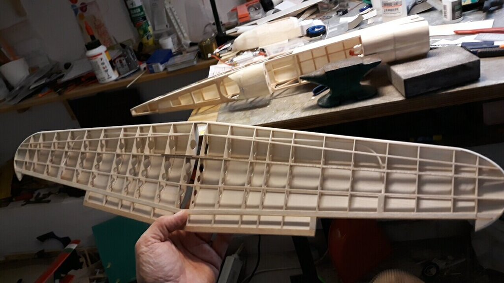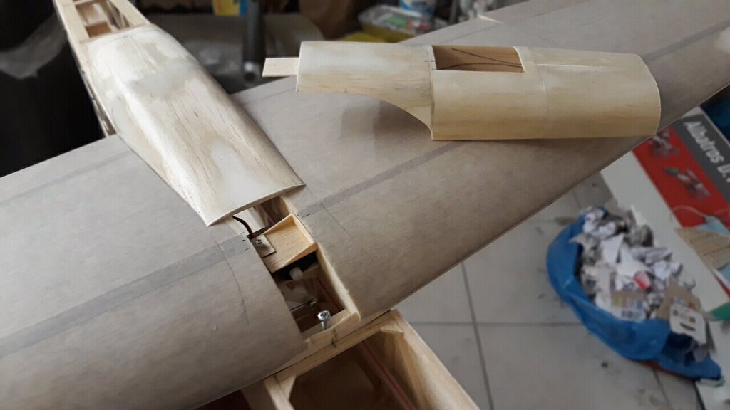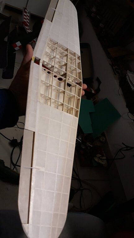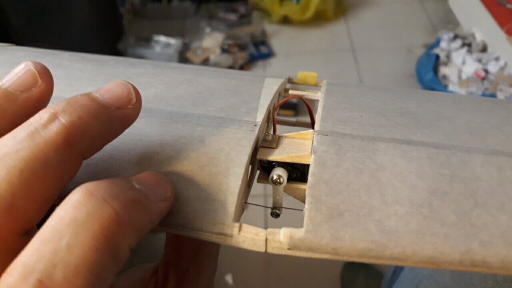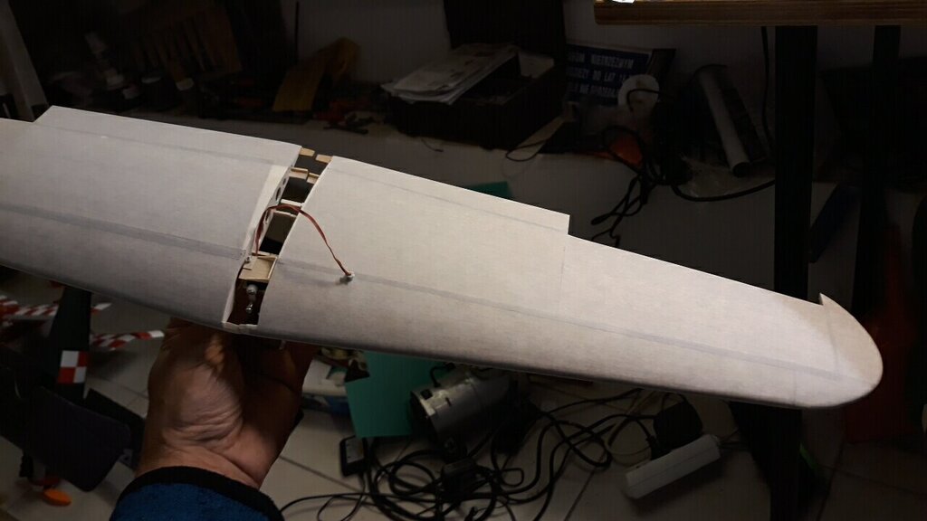 Dobry wieczór, Po niestety długich kombinacjach mam nadzieję, że płaty gotowe. Dół częściowo nie jest jeszcze pokryty bo muszę mieć dostęp do wnętrza dla położenia kabelków silników. Lotki działają ale z montażem napędu zeszło dużo czasu bo za mało trochę miejsca przewidziałem na manewry śrubkami. Na zdjęciach widać końcówki bowdenów zakończone pętlami i przyśrubowane do ramienia serwa. Cdn. Pzdr, M