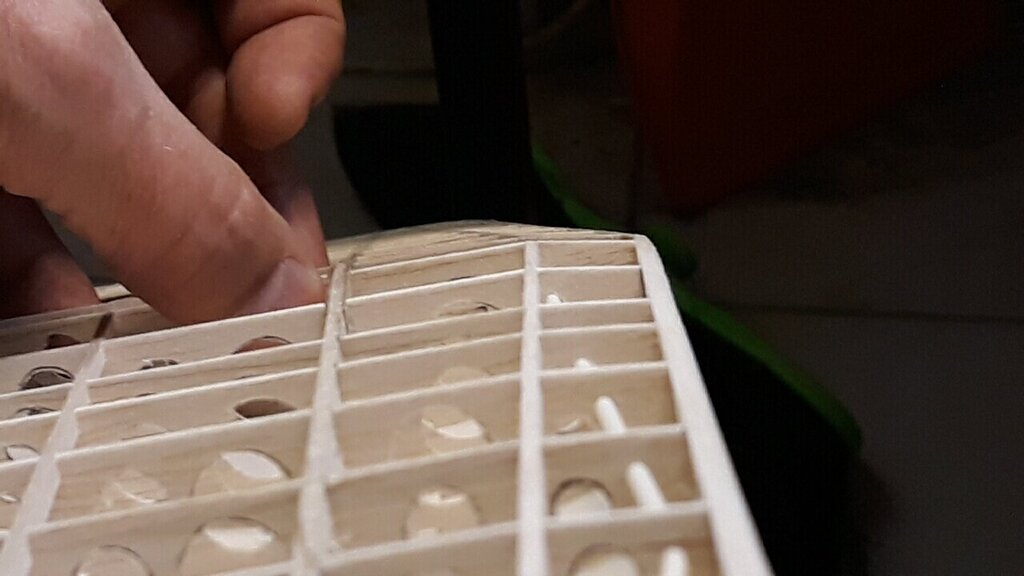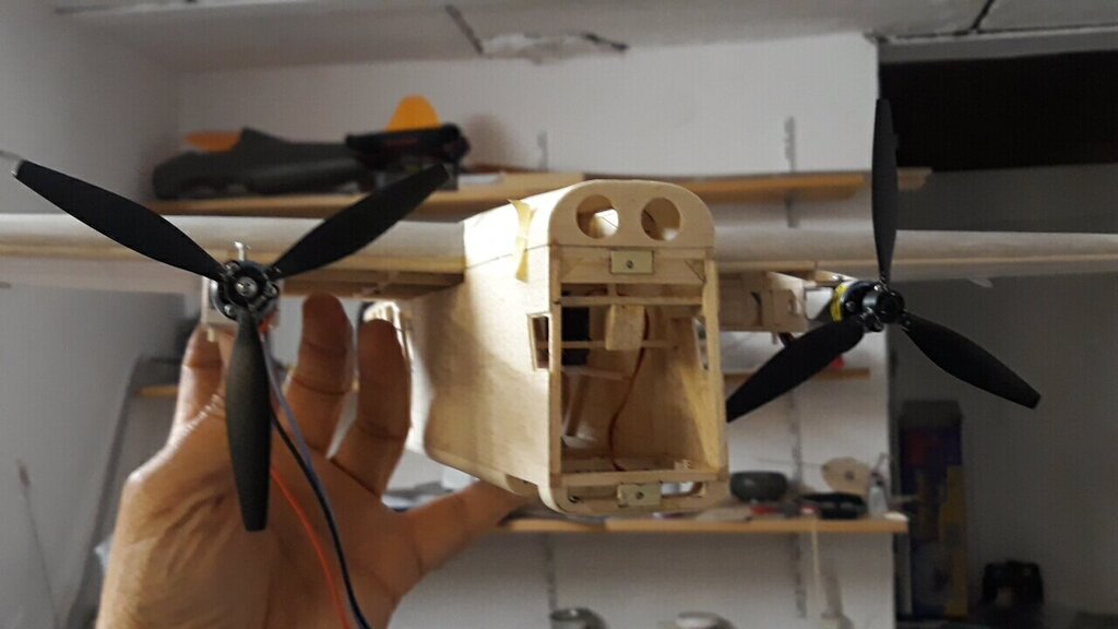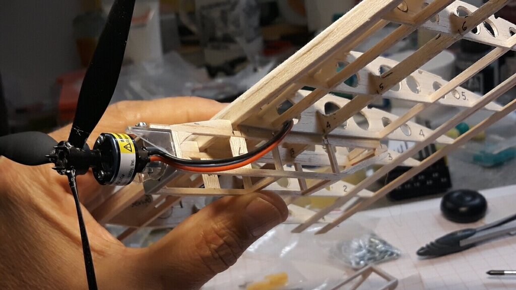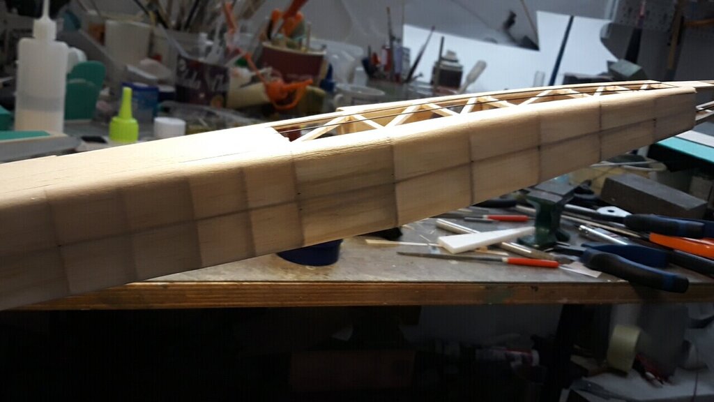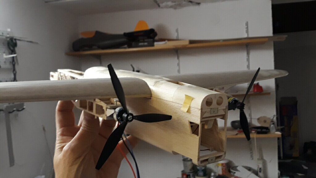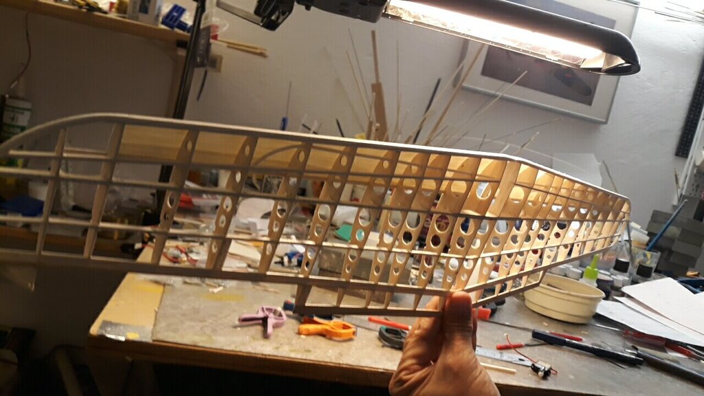 Dobry wieczór, Po niestety długich kombinacjach mam nadzieję, że płaty gotowe. Dół częściowo nie jest jeszcze pokryty bo muszę mieć dostęp do wnętrza dla położenia kabelków silników. Lotki działają ale z montażem napędu zeszło dużo czasu bo za mało trochę miejsca przewidziałem na manewry śrubkami. Na zdjęciach widać końcówki bowdenów zakończone pętlami i przyśrubowane do ramienia serwa. Cdn. Pzdr, M