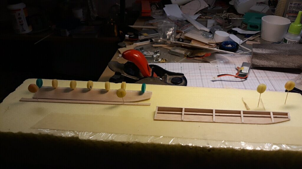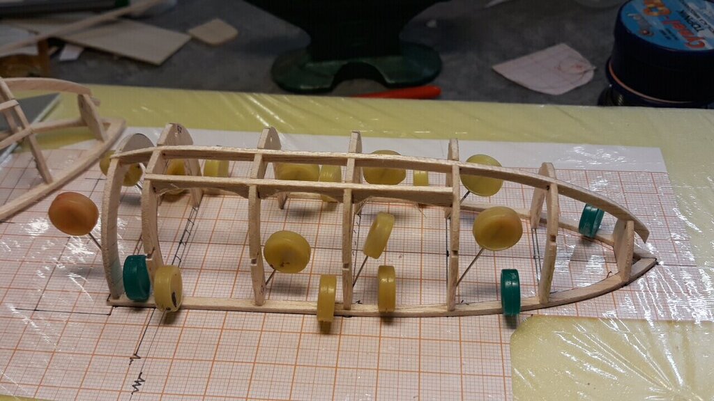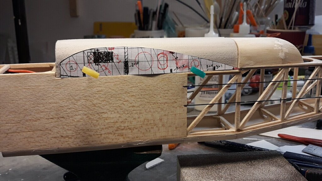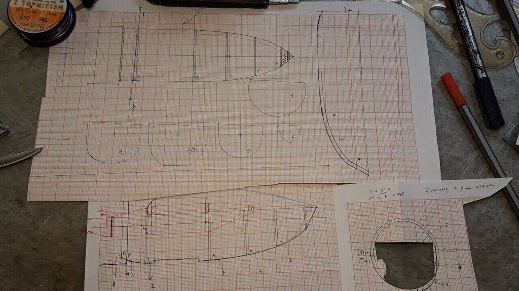 Dobry wieczór, Żeby móc dopasować dokładnie poszycie dołu kadłuba i dziobu wkeiłem 2 magnesy i mogę już calość kadłuba jakoś widzieć i możliwie dokończyć kadłub. Zrezygnowałem jednak z krycia kadłuba folią w miejscach okienek i będę wszędzie robił ramki i "oszklenie" z plastiku; więcej pracy ale mam nadzieję łatwiej będzie wszystko pokryć japonem , bo łączenia folii i papieru mogą słabo trzymać i wolę już mieć z tym spokój. Kombinuję też z podwoziem i chyba zrobię składane mechanicznie, czyt.ręcznie - golenie są tak długie że boję się żeby ich nie wyrwało przy ląd w trawie, ale to jeszcze się zobaczy.cdn. Pzdr. M