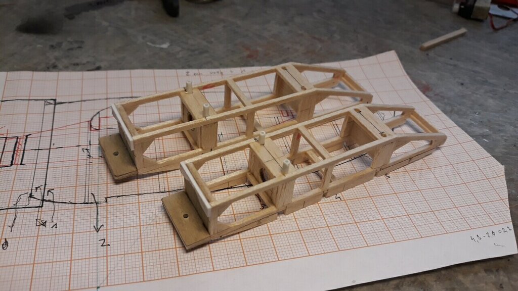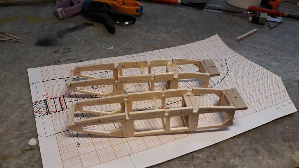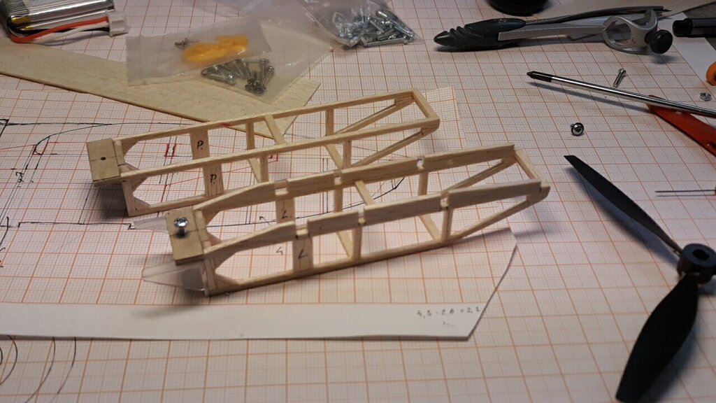 Dobry wieczór, Te "pylony" zabrały jeszcze sporo czasu (wklejenie możliwie pionowo rurek do podwozia, ich wzmocnienie etc) i jeszcze wymagają pary części-wzmocnień:(. W ramach odpoczynku wykroiłem wzmocnienia sklejkowe (0.4 mm ) dźwigarów aby móc na razie na sucho złożyć skrzydła i kombinować jak je uzbroić ( dostęp do kabli silników, montaż serwa lotek, zamocowanie gondol) zanim będzie pokryte. Pokrycie z góry będzie balsowe bo z wagą udało się całkiem nieźle i w ramach nagrody na chwilę złożyłem większość elementów - trzeba się ciągle domyślać, ale prawie żubr!:) Cdn. Pzdr, M