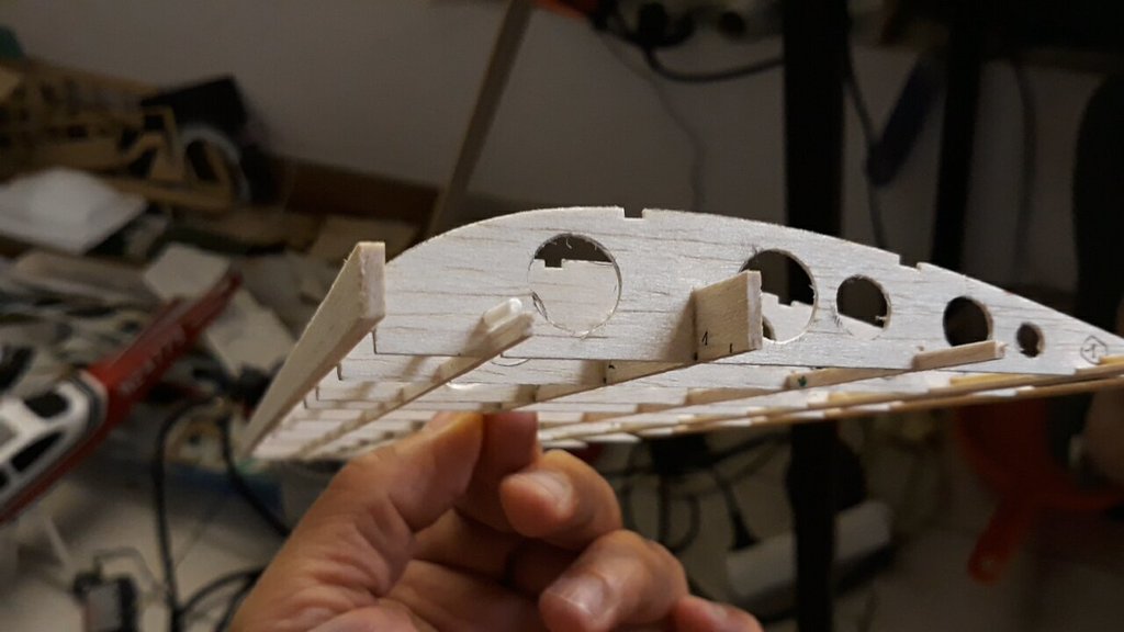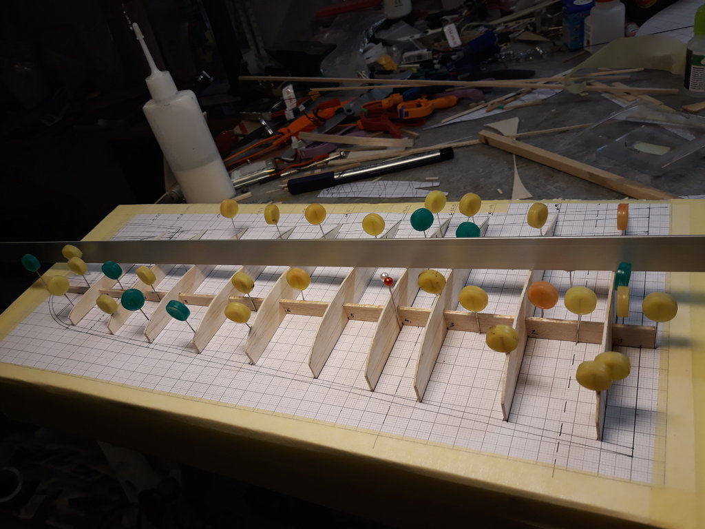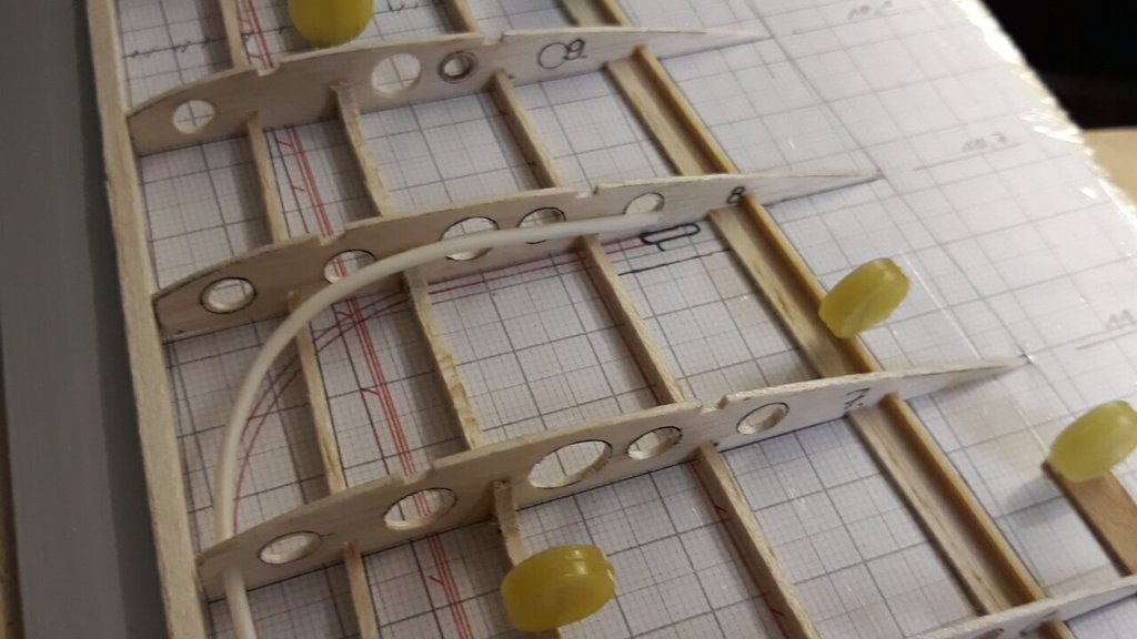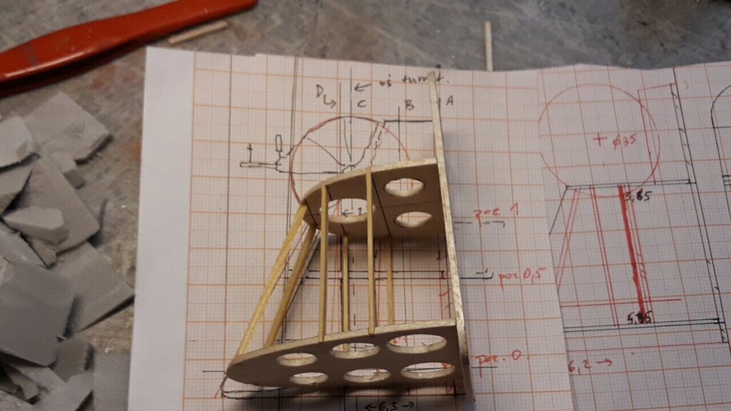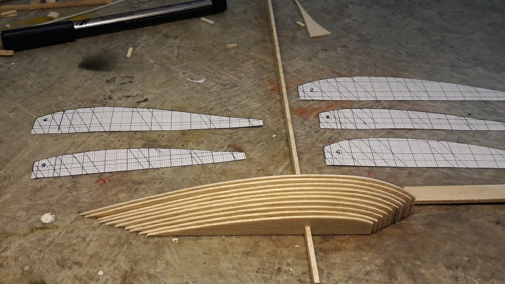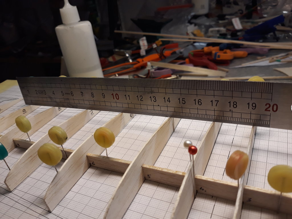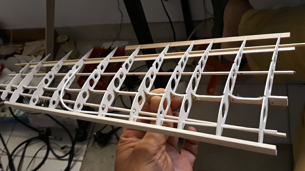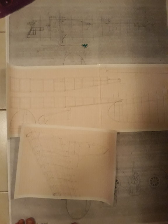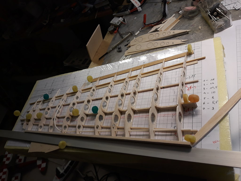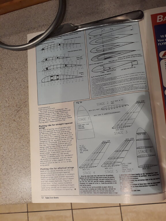 Dobry wieczór, Skończyłem ramkę stat pion ale zaprzestałem dalszej pracy bo okazało się (po przymiarce), że sk i sw mogą zachaczać o siebie jeśli zrobię to dokł wg planów (na zdjęciu niżej widać jakie prawdziwy samolot miał małe kąty wychyleń); czyli trzeba będxie tu dalej kombinować. Dlatego zacząłem produkcję płatów żeby coś ruszyło do przodu; żeberka wycinałem bardzo (jak na mnie) precyzyjnie, nie obyło się jednak bez malych poprawek; w sumie jednak jak na pierwszy raz wyszło nieźle, odchylenia nieliczne i chyba mniej niż 0.5mm; czyli chyba mogę jechać dalej (resztę bedę szlifował na gotowym płacie); teraz muszę wyrysować dźwigary pomocnicze, wyrysować i zrobić ażury każdego żebra, potem przygotować 2gi zestaw i można zaczynać montaż. Cdn. Pzdr. M