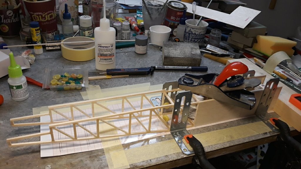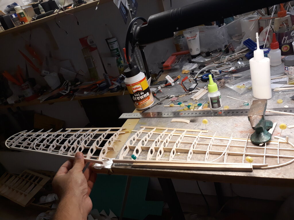 Dobry wieczór, Konstrukcja jednego płata sklejona. Wycięcia na wszystkie dźwigary pasowały ładnie i montaż w miarę szybko poszedł. Długość drucika napędzającego lotki /od wylotu ze skrzydła do ramienia orczyka/ skopiowałem z Albatrosa (mniej więcej) i mam nadzieję że niespodzianek nie będzie. Chciałem ten mój profil skrzydła lekko zaokrąglić z dołu tak aby jego cięciwa lekko się podniosła (ca 2-3 stopnie) i tak przykleiłem listwę natarcia aby przy początku płata była trochę wyżej niż poziom( będzie łatwiej przód spodu żeberek szlifować). I kiedy tak rozmyślałem o tym i patrzyłem na płat z profilu to dotarło do mnie dopiero że ponieważ tak uniesiona u nasady skrzydła listwa natarcia (która u jego końca będzie spoczywać na poziomie , czyli będzie niżej) spowoduje iż płat będzie miał skrzywienie aerodyn (tj washout)!!! Niby dobrze, ale kurczę, nie widziałem żeby ktoś tak to robił ( wszędzie widziałem washout robiony poprzez podniesienie listwy spływu na końcu płata. Na moj nie ksztalcony technicznie rozum to efekt jest /może być/ ten sam, czy jednak coś ni się pomyliło? Bardzo bym poprosił kolegów o poradę, bo jakby co to mogę jeszcze wszystko "odwrócić". Cdn. Pzdr, M