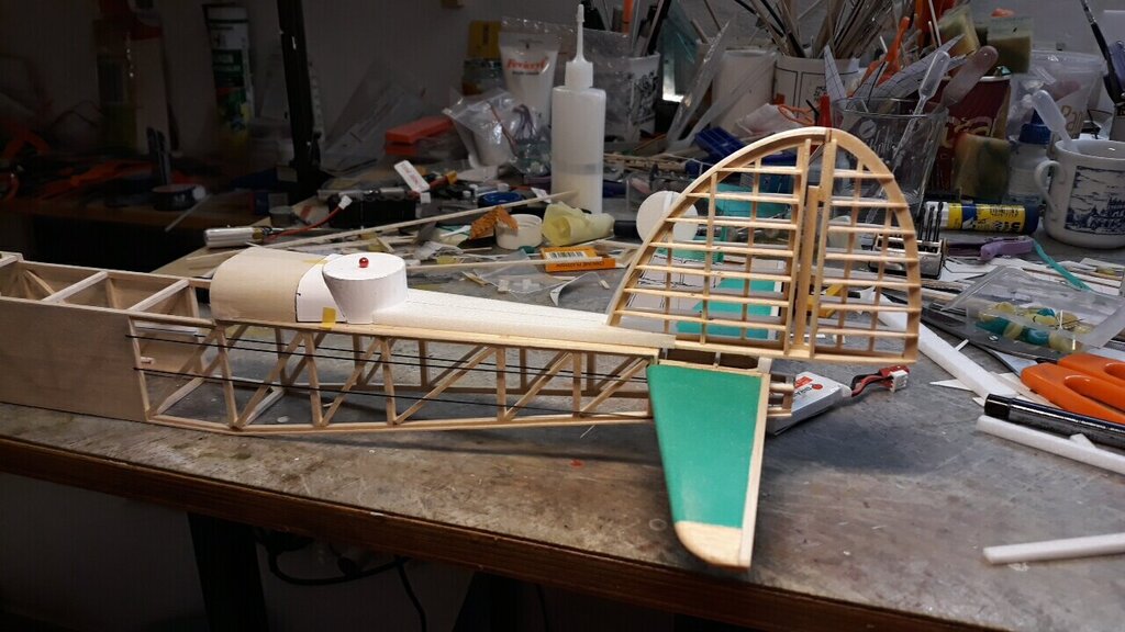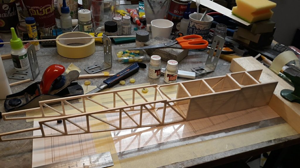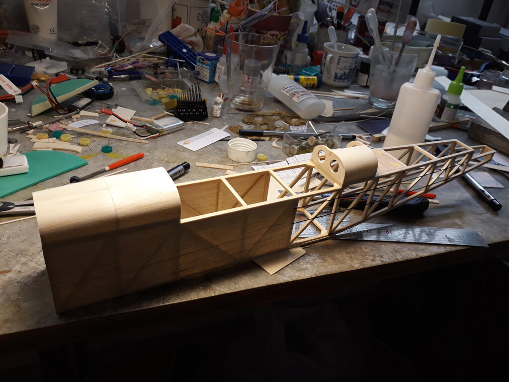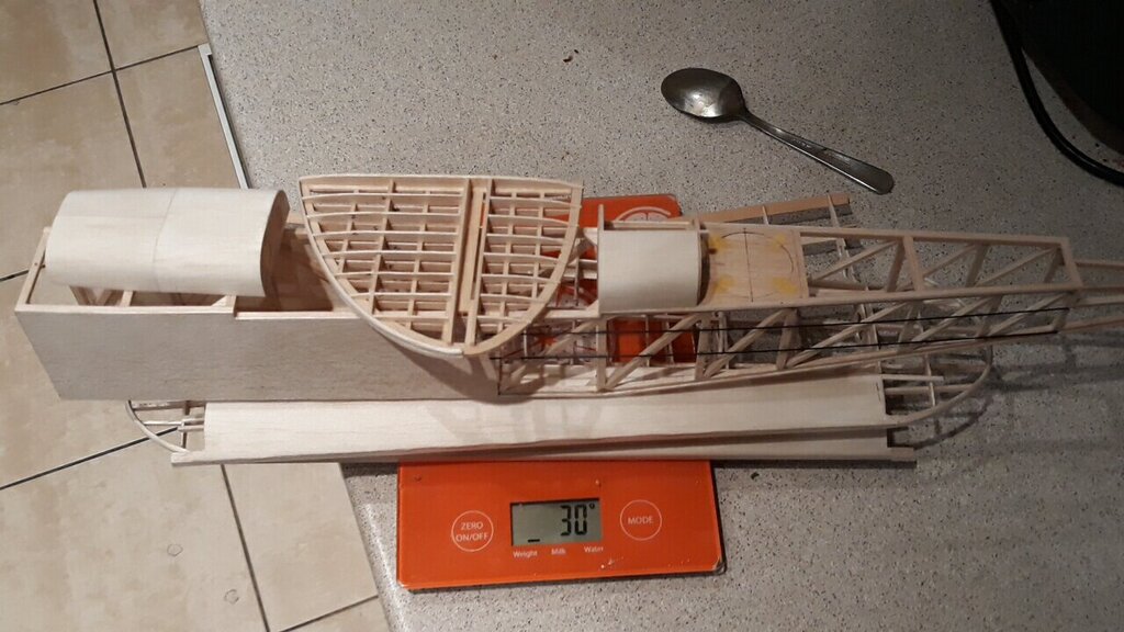 Dobry wieczór, Chyba po raz ostatni polatałem aerocommanderem-dawcą organów i już wiem, że jeśli Żubr ma latać dostojnie to muszę z wagą być bardzo ostrożny. Dlatego na razie tylko pokryłem płaty balsą do ca 1/4 szerokości i poczekam z dalszą pracą na wyniki wagowe ja będę miał już większość kadłuba i usterzenie. Jak będzie słabo to zeszlifuję zeberka na plasko i resztę pokryję tylko japonką. W tyle kadłuba chciałbym żeby ładnie było widać napięcie pokrycia na podłużnicach i nakleiłem na krawędzie kratownicy malutkie (ca 1x0.6mm) listeweczki które mam nadzieję zapobiegną przyleganiu folii do boków kratownicy (tego nie miałem w tiger moth'cie i roboty i stresu było sporo żeby tego przylegania nie było). Okienka na bokach kadłuba mam zamiar zrobić tak, że poszycie będzie z przezroczystej folii a same okna zamaskuję przed malowaniem, zobaczymy jak wyjdzie. Dziób kadłuba ma być zdejmowany, żeby w razie kreta móc go naprawić ew zmienić no bo to będzie ""szklarnia". Cdn. Pzdr, M