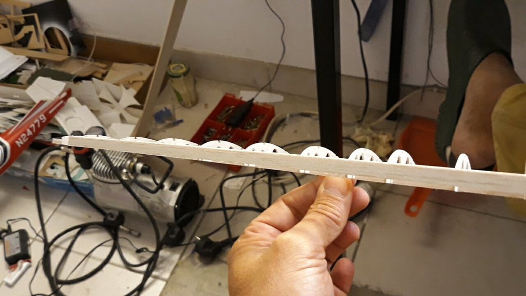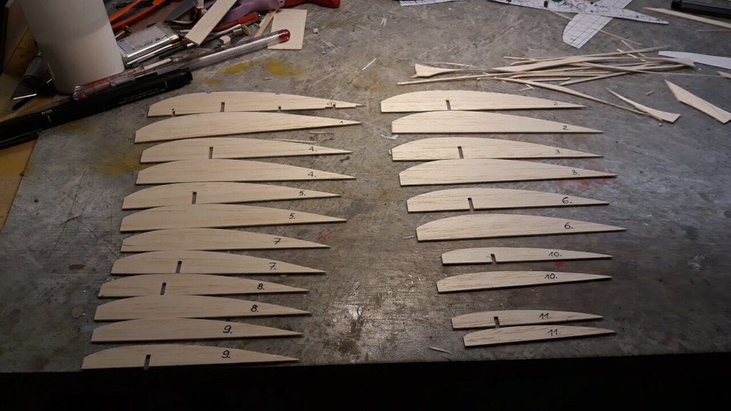 Dobry wieczór, Dziś rzeźba żeberek. Jak policzyłem ile tych wszystkich nacięć na dźwigary będxie trzeba nawycinać i naprzymierzać to jednak w chwili słabości pomyślałem o kompie i laserze, ale to jednak chyba nast razem:) Napęd lotek planuję zrobić drucikami 0.3 mm, super się sprawdxiły w Albatrosie, lekko chodzą i mam nadzieję luzów dużych nie będzie a wagowo to wychodzi super (mimo że rureczek cieńszych niż 2 mm /zewn średnicy/ nigdzie dostać nie mogę. Cdn. Pzdr. m