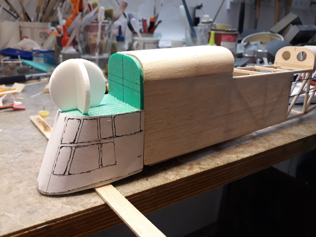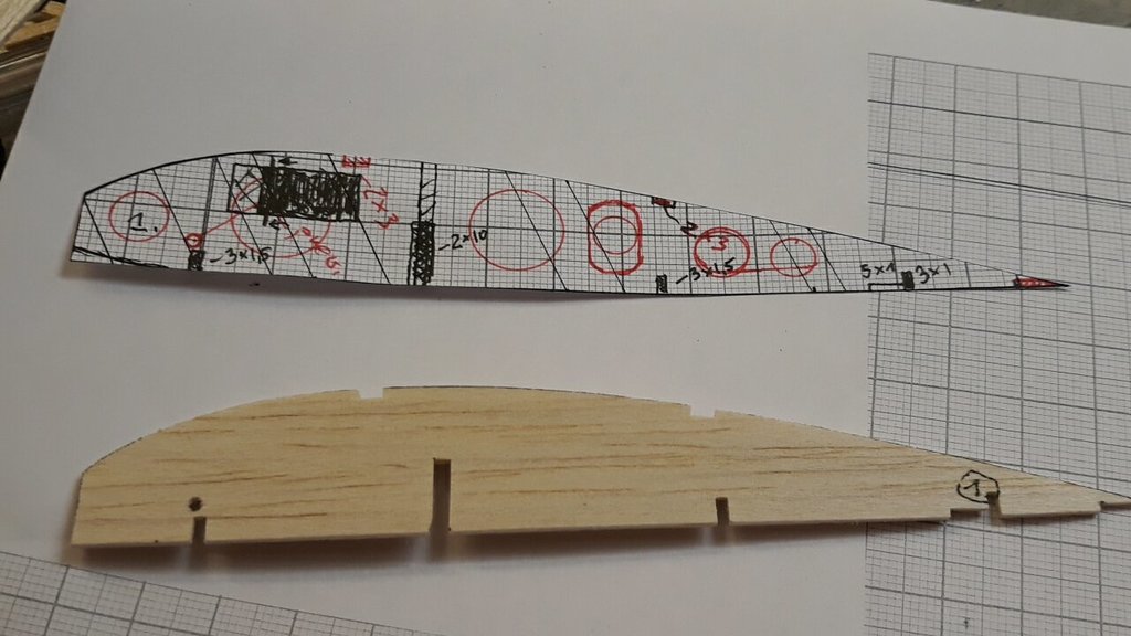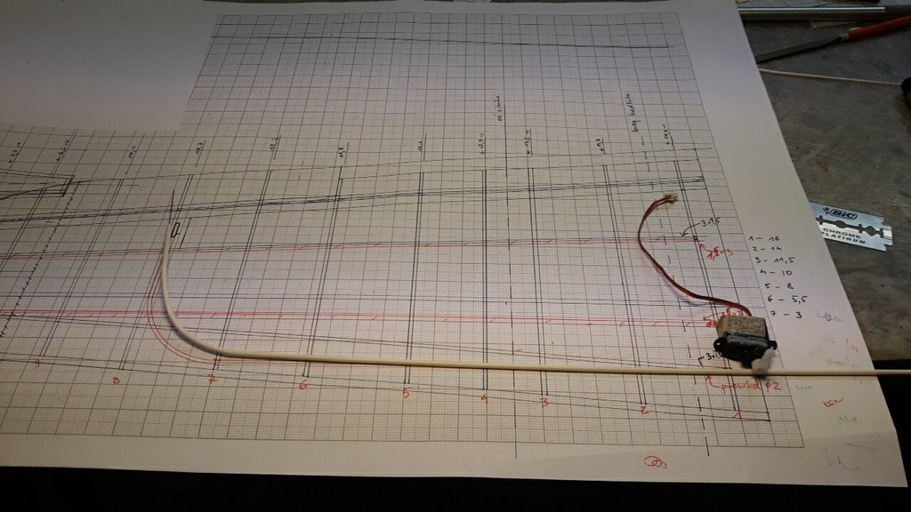 Dobry wieczor, Troche mnie nie bylo gdyz niestety moj telefon padł ofiara amatora cudzej wlasnosci i troche mi zajelo aby uzyskac łączność ze swiatem na powrót (ciagle nie umiem ogarnac nowego tel:( ) Z budową trochę poszło naprzód. Wyrysowałem plany dziobu i zbudowałem trochę toporną makietę żeby zobaczyć jak będzie można go finalnie zbudować. Rozplanowałem rozmieszczenie serw i płytki rx/esc, wszystko poszło tak daleko naprzód jak tylko mogło. Na razie niby wyważa sie (kadłub) z zapasem na dziób, ale pewnie i tak bedzie problem bo skrzydła dość ciężkie a silniczki b lekkie są! Płytka wcale z kolei taka lekka nie jest ale ma już zamontowane regulatory i to powinno znacznie uprościć montaż. Zrobiłem też usterzenie, ale wyszło dość ciężkie i nie wiem czy nie będę musiał robić drugiego, ale to się okaże po zmontowaniu większości części modelu. Napęd sw będzie za pomocą pręcika węglowego a sk ciègnami z linek. Pzdr M