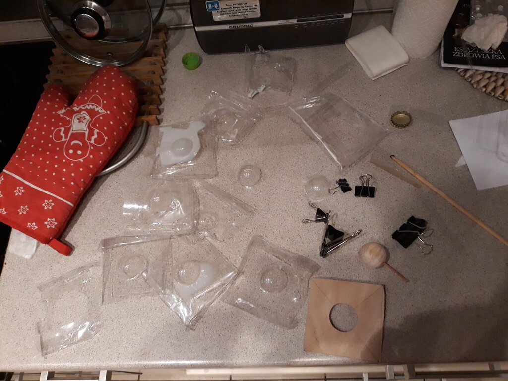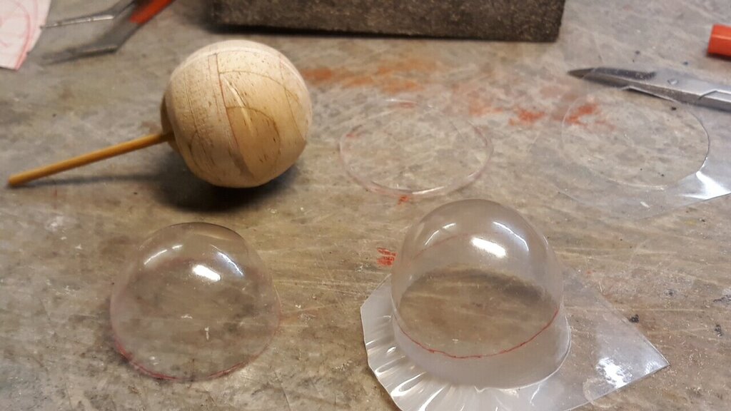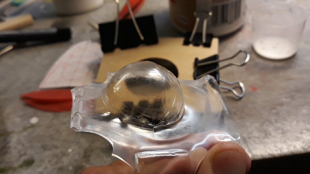 Dzień dobry, Dzięki chłopaki!! Trochę było prób ale w końcu skumałem (mam nadzieję:) ). Wczoraj wieczorem, rzutem na taśmę udałem się do obliskiej "suszarni" i tam nabyłem 5 pokrywek na opakowania do sushi i dziś już mogłem próbować dalej. Różnie to szło ale po paru próbach już umiałem zobaczyć kiedy plastik zaczyna "pływać" i wtedy ciach kopytem! Wypraski nie są idealne ale na wieżyczkę mam nadzieję wystarczą. Tak czy inaczej mogę dalej z budową dzioba iść i wykombinować obramowanie wieży tak żeby sie obracała. Cdn. Pzdr. M