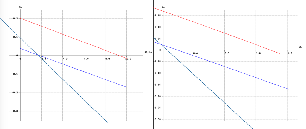 Jarku, jeden i drugi program liczą prawidłowo. Rzecz w tym, że każdy program do wyznaczania SC a internetu uwzględnia tylko i wyłącznie wymiary geometryczne. XFLR5 do obliczeń uwzględnia o wiele, wile więcej do wyznaczenia charakterystyki Cm vs CL. To co podajesz, to klasyczny błąd w fazie projektowania. Problemem jest cecha objętościowa usterzenia poziomego (z ang. Tail Volume (VH,) z niem. to co zaznaczyłem) Tutaj masz 0,84, to bardzo dużo. Trenerek powinien mieć coś powyżej 0,45, ale nie więcej niż 0,6. Tu masz po zmianie, na 0,59 I wykres dla tego samego położenia SC, dekalażu, ale innej (mniejszej) cechy objętościowej usterzenia poziomego (krzywa zielona) -